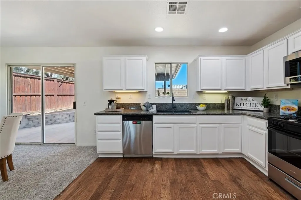 Beautiful lake Elsinore home with NO HOA OR SPECIAL ASSESSMENTS Great Location near the 15 Freeway and easy access to stores, shopping, and restaurants. You will love this floorplan and layout. Once you walk-in you will notice the open floor-plan this home has to offer. There Spacious living room with a gas fireplace perfect for warmth and ambiance. You will notice the beautiful natural REAL wood floors that have just been sanded and re-sealed and the brand NEW carpet as well. BRAND NEW INTERIOR PAINT give this home a fresh makeover and ready for you to move right in. Spacious 4 bedrooms is perfect for a large family. Primary bedroom features a walk-in closet, private bathroom and a sliding glass door to the backyard. The kitchen features newly painted cabinets, granite counter tops, brand new stainless steel stove. Both bathroom showers have just been reglazed. This home has had a fresh makeover and ready for the perfect buyer to fall in love with this adorable home. The backyard is spacious and has a large wood patio cover making entertaining and enjoying your backyard perfect. Enough room to add a pool or just entertain your guests. Spruce up the backyard and make your dream backyard come true. Long driveway allows for ample parking for guest and toys.