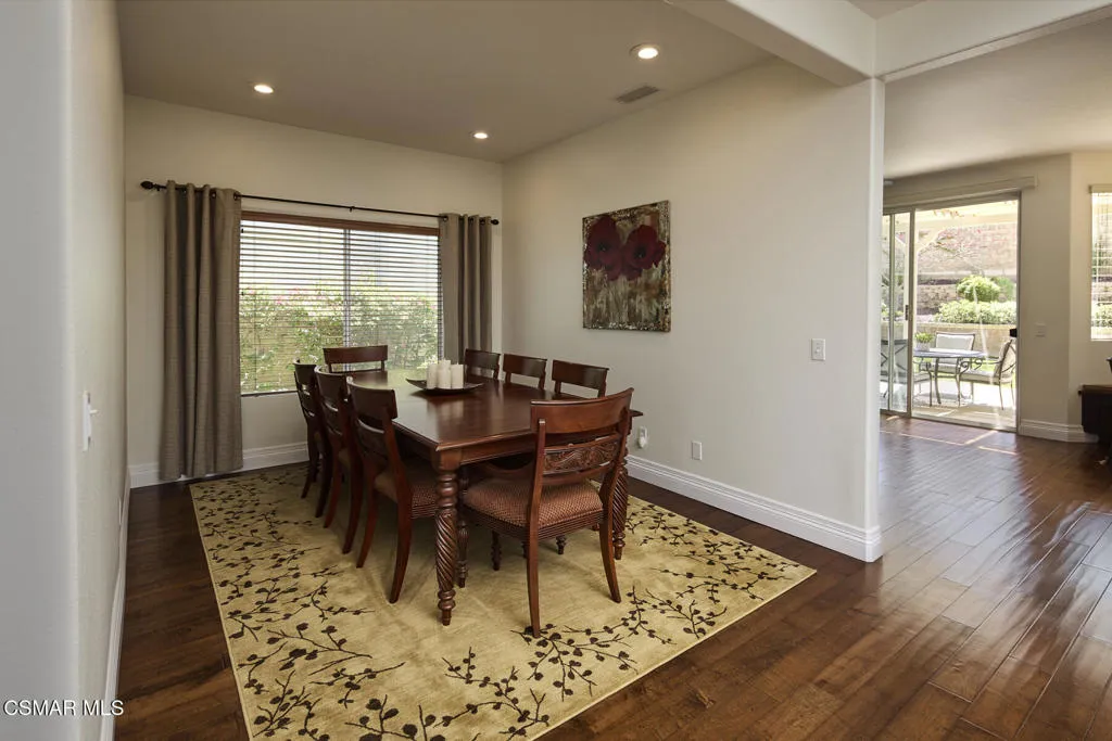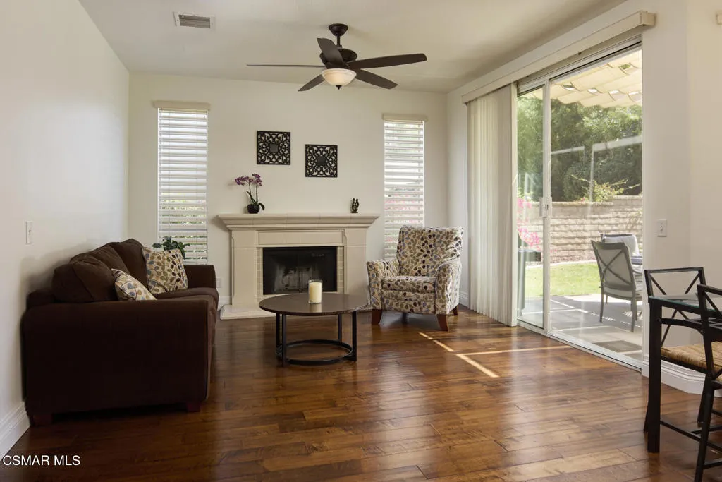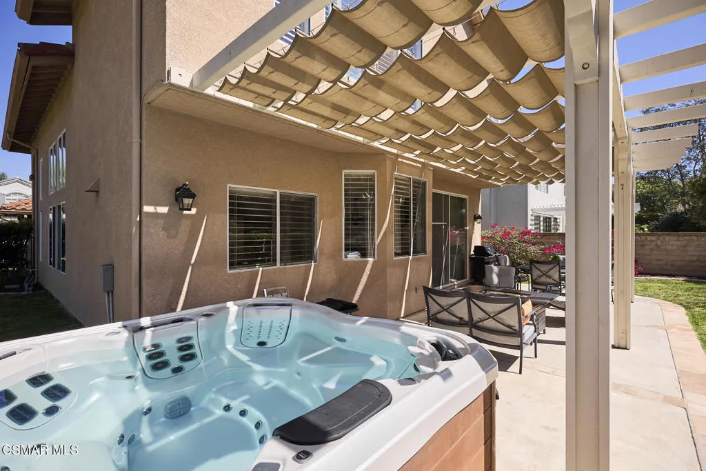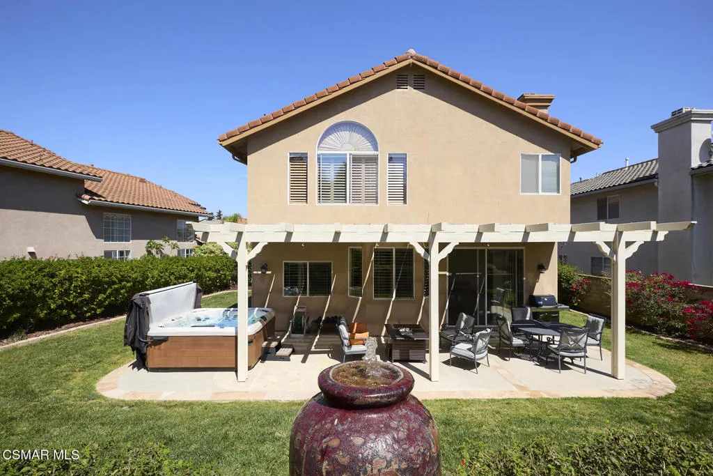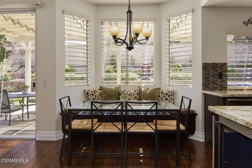 Wow! What a gorgeous home! Finally, a turnkey Rancho Conejo 5 bedroom home with a great yard! Welcome to 1804 Golden Oak, a short and quiet street in 24 hour guarded Rancho Conejo. With breathtaking hardwood (not LVP) flooring, a stunningly remodeled kitchen featuring rich mahogany stained cabinets, square edged granite with glass backsplash, a full complement of deep drawers, stainless steel appliances including both a side by side and wine fridge! The built in bay window seated breakfast nook is sublime and a place you will thoroughly relish every mealtime. The collection of gorgeous contemporary window coverings are super cool too. The family room has a beautiful wood burning fireplace and 8' sliding glass door which leads to a spacious patio and retractable cable shade cover. There's even an above ground spa for fun relaxation. The grassy yard is Uniquely roomy for the neighborhood and it's super private! The first floor rounds out with a living room, dining room and a very sharp iron and wood staircase. There's a full bath down for guests and the downstairs bedroom. Indoor laundry and a 3 car garage are also accessible on the ground level. Upstairs you'll find 4 more bedrooms including a large, elegant primary suite with plantation shutters. Rancho Conejo is a 24 hour guard gated community with roving patrol, 2 pools and 2 spas, dog friendly pedestrian paseos, close to shopping, the Oaks Mall, Los Robles Regional Medical Center, Rancho Conejo Playfield with the most fun and competitive pickleball courts, and great schools. Hiking trails are close and accessible from both the front and rear gates and the dues are a truly ridiculous $163/mo!