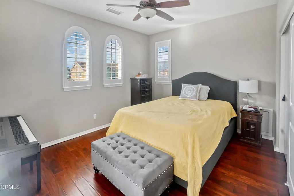 This meticulously maintained 5-bedroom, 3-bathroom home delivers 3,420 square feet of refined living space with a backyard built for year-round entertaining. A custom saltwater pool and spa (2022) with glass mosaic tile, built-in Baja shelf, and raised spa sit alongside a gas fire pit and a built-in outdoor kitchen featuring a stainless steel BBQ island wrapped in hand-painted Talavera tile -- all under a pergola with ceiling fan and string lights. A separate Saltillo tile courtyard framed by bougainvillea and wrought iron seating creates a second entertaining zone. Removable child safety fence for peace of mind.Inside, rich hand-scraped hardwood floors and plantation shutters flow throughout. The open-concept great room centers on a gas fireplace framed by a bold accent wall, built-in surround sound ceiling speakers, and French doors opening directly to the pool and patio. The chef's kitchen features dark espresso raised-panel cabinetry, granite countertops, a generous center island with breakfast bar, gas cooktop with range hood, built-in wall oven and microwave, and stainless steel appliances including a French-door refrigerator. Under-cabinet lighting and a breakfast nook with sliding glass doors to the backyard complete the space. A formal dining room with designer accent wall seats six comfortably, while the formal living room boasts soaring two-story ceilings flooded with natural light.A main-floor bedroom and full bath with glass-enclosed shower provide flexible space for guests, a home office, or multigenerational living. The dedicated laundry room includes a folding counter and upper and lower cabinetry.Upstairs, an open loft landing with built-in cabinetry overlooks the living room below -- ideal for a media center, homework station, or reading nook. The oversized primary suite features a spa-inspired bath with oval soaking tub, separate glass-enclosed walk-in shower, dedicated vanity, and private water closet. Three additional bedrooms offer generous proportions with hardwood floors and ceiling fans throughout, including one with arched windows and plantation shutters and another with a French door to the second-floor balcony. The hall bath features dual sinks and a separate tub/shower room.Attached 3-car tandem garage. Turf rear yard. Mature landscaping with tropical plantings. Corona-Norco Unified School District. Minutes to I-15, SR-60, and SR-71. This is Eastvale living at its finest.