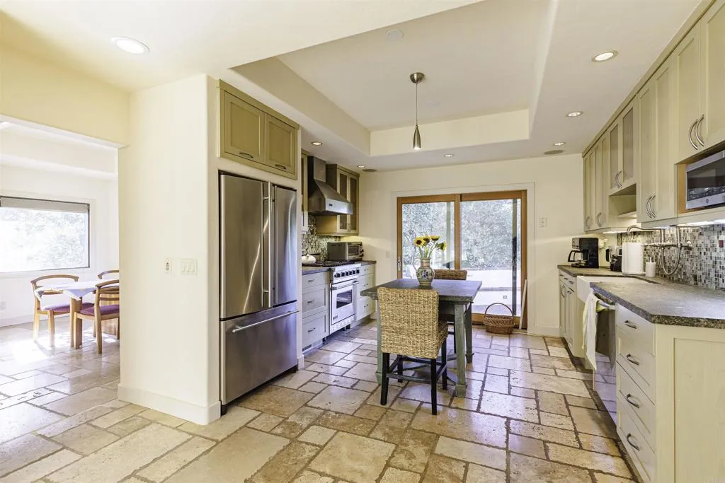 Tucked behind a private gated entry framed by hand-laid Santa Lucia stone in sought-after Carmel, this beautifully upgraded home offers a rare blend of timeless craftsmanship, refined comfort, and exceptional versatility. Nestled on a quiet cul-de-sac on Oak Place — just steps from Carmel High School, minutes from Carmel Beach, and the heart of Carmel-by-the-Sea — the setting offers exceptional privacy with no through traffic. Designed as a true forever home by a longtime licensed civil engineer and enhanced with the guidance of an interior designer, the property reflects thoughtful planning, quality construction, and enduring attention to detail throughout. Soaring tray ceilings and abundant natural light from skylight tube systems create a bright, open, and inviting interior. Rich finishes include Jerusalem stone flooring, solid oak floors, and two stunning hand-crafted mosaic inlays — one at the entry and one in the hallway bathroom. The remodeled chef’s kitchen is appointed with granite countertops, a mosaic glass backsplash, a Viking range, farmhouse sink, and kitchen island — a true entertainer’s dream. The spacious primary suite is a true retreat, featuring a walk-in closet and a breathtaking spa-inspired bath complete with glass-tiled walls, a skylight, stand-alone soaking tub, steam shower, and gas fireplace. The generous living room centers around a classic wood-burning fireplace with gas insert. Additional highlights include heated flooring in the hallway bathroom, newer Sierra Pacific sliding doors throughout, and fully insulated walls, floors, and ceilings for year-round comfort. Outdoor living is equally impressive — a gas fireplace anchors the main patio alongside a built-in BBQ, multiple brick entertaining zones, mature succulent gardens, and indoor/outdoor speakers. A fully permitted cedar shake roof installed in 2020 with a transferable 10-year labor warranty provides exceptional peace of mind. Adding rare flexibility, the home includes a private studio-style guest suite with its own exterior entrance, kitchenette, and dedicated bathroom access — ideal for extended family, guests, or a creative retreat. Buyer to verify permits and uses with County of Monterey. Gated motor court with parking for 6+ vehicles and a one-car garage — space rarely found in Carmel.