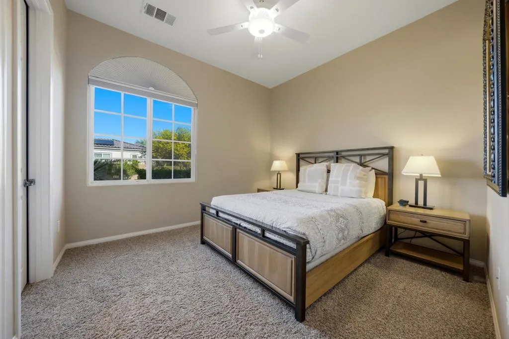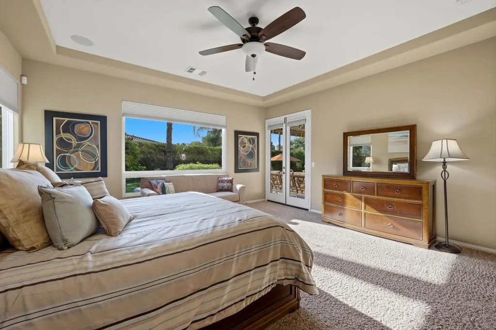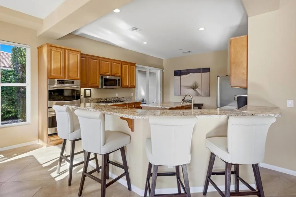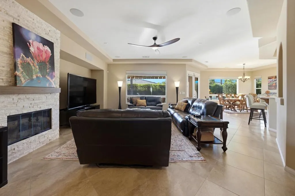 Behind the gates of Rancho Santana, this home presents a beautifully upgraded and meticulously maintained desert retreat designed for comfort, privacy, and effortless living.This thoughtfully designed residence features three spacious ensuite bedrooms, four baths, and a dedicated office/bonus room enhanced with a custom Murphy bed--perfect for accommodating guests while maintaining a functional workspace. The layout offers ideal separation between the main living areas and bedrooms, creating a natural flow suited for full-time living, a seasonal escape, or a refined retirement home.The kitchen opens seamlessly to the living space and is appointed with granite slab countertops, a center island, walk-in pantry, and stainless steel appliances, including a newer French-door refrigerator. Integrated home automation adds convenience and modern efficiency, elevating everyday living.Step outside to a fully enclosed backyard that offers exceptional privacy, backing to a tranquil trail with partial mountain views and no direct rear neighbors. Designed for both relaxation and entertaining, the outdoor space features a beautifully illuminated landscape that comes alive at night, a pool and spa with a newer high-capacity heater for fast heating, and a built-in fire pit for cozy desert evenings.The covered patio extends the living space outdoors and is equipped with two ceiling-mounted Infratech heaters, providing comfort during cooler mornings and evenings year-round.Additional upgrades enhance both function and style, including epoxy garage flooring, a California Closets storage system, keyless garage entry, video-enabled security, exterior lighting, and brand-new ceiling fans throughout. The home is offered furnished per inventory, making it truly move-in ready.Ideally located near PGA West, the Thermal Club, polo grounds, tennis, dining, and shopping, Rancho Santana offers a desirable lifestyle with low HOA dues that include gated access, neighborhood parks, bocce ball courts, a putting green, and scenic walking trails.Immaculate, private, and thoughtfully upgraded, this home stands out as a rare opportunity in La Quinta. Schedule your private showing today and experience the difference for yourself.