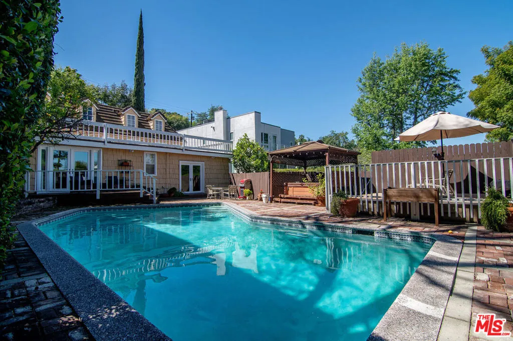 Privately set on a street-to-street lot with cul de sac entrance on Dunbar Place in one of Sherman Oaks' most coveted South of the Blvd neighborhoods, this inviting residence blends a prime location with timeless architectural character. Through the striking front gate and lush, welcoming yard, you're greeted by a spectacular great room featuring vaulted ceilings, a beautiful bay window, and a fireplace--an ideal setting to relax with a good book as dappled sunlight fills the space. Nearly 2,000sft, and 3bd/3ba, the thoughtfully designed split-level floorplan offers a newly remodeled kitchen, formal dining room, two generously sized bedrooms, and a full bath on the main level. Downstairs, the serene and private primary suite with ensuite bath enjoys treetop views and glimpses of distant mountains, creating a true retreat. The lower level also features a cozy entertainer's family room perfect for movie nights, game days, or casual gatherings. Double glass doors open to a sprawling deck where you can enjoy morning coffee or evening wine overlooking the pool and spa, ideal for both relaxing and entertaining. A rare and highly desirable second entrance at the rear of the property opens onto a quiet cul-de-sac, offering convenient access to the garage and additional parking. Adjacent to Beverly Glen, this home provides easy access to Beverly Hills, the Westside, and Ventura Boulevard's premier shopping and dining. Tranquil and private, yet moments from the city this is Sherman Oaks living at its best.