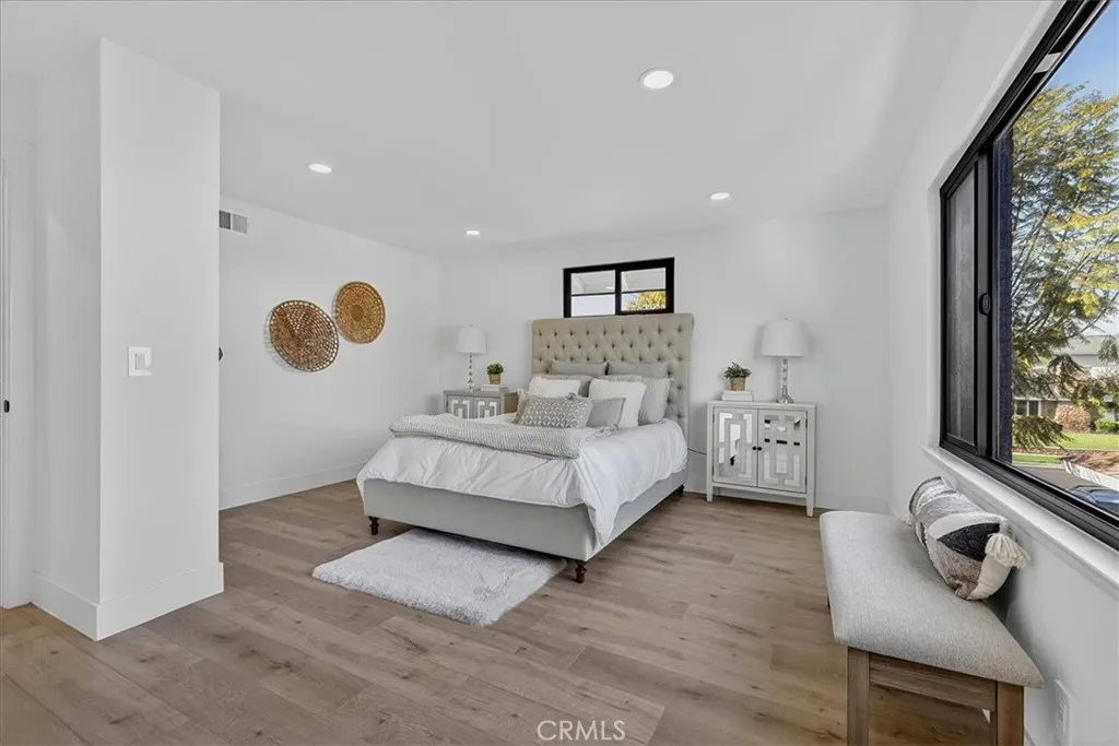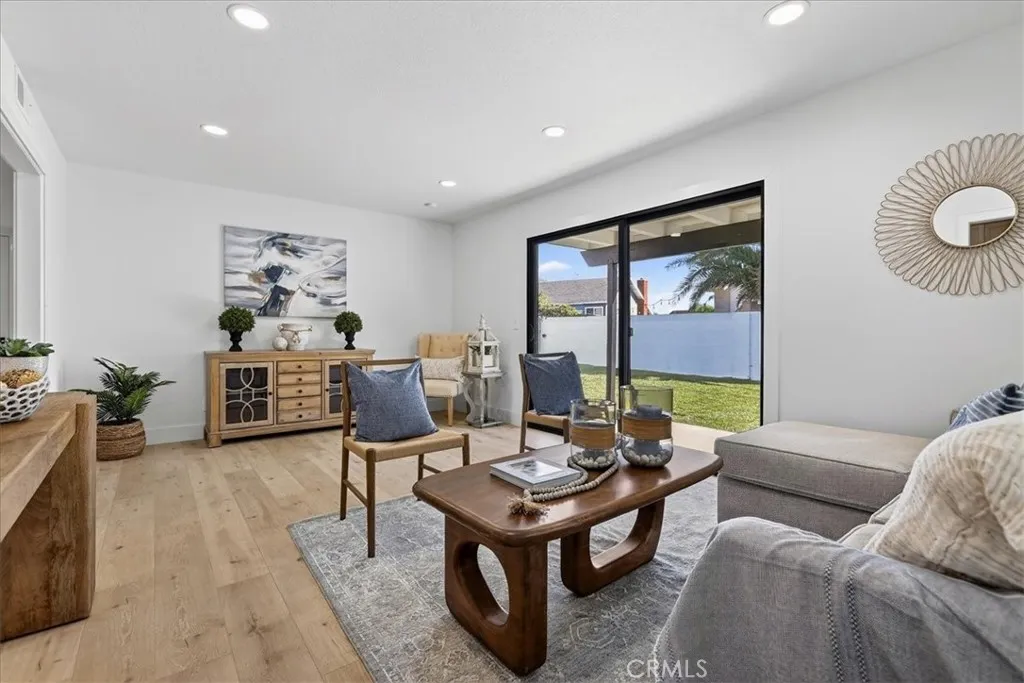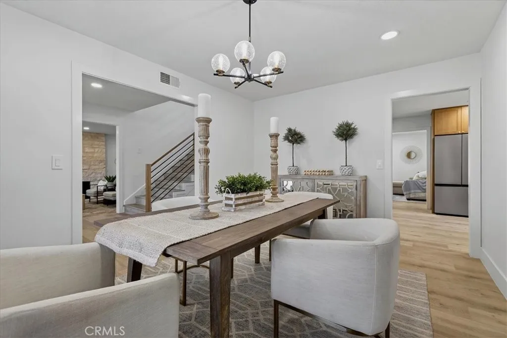 Situated on a well-kept street in Placentia, this extensively updated residence offers standout curb appeal with a freshly painted white exterior, contrasting black trim, new windows throughout, and a wide driveway with newly poured concrete leading to a two-car garage with a new door. A manicured lawn, refreshed landscaping, and a covered front porch create an inviting approach. Inside, the home features light wood flooring, recessed lighting, and fresh interior paint throughout. Upon entry, a staircase with a statement chandelier sets the tone. A formal living room with a fireplace sits to one side, and a formal dining room with a dedicated light fixture sits opposite. The kitchen has been fully updated with new cabinetry, white countertops, and brand new fixtures and appliances. It also includes a built-in buffet area for additional storage and a breakfast nook for casual dining. The space opens to a spacious family room with sliding doors that lead to the backyard. A full bathroom with a walk-in glass-enclosed shower and smart toilet, a storage closet, and a main-level bedroom with closet space complete the first floor. The attached garage features epoxy flooring, additional storage, a new garage opener, and a laundry area for added functionality. Upstairs, the home offers three bedrooms, including a generously sized primary suite with ample closet space and a fully updated en-suite bathroom featuring dual vanities and a glass-enclosed shower. A second full bathroom with dual vanities serves the additional bedrooms, all of which are well proportioned and include closet space. The backyard provides a spacious outdoor setting with a covered patio and a large grass lawn, along with durable block wall fencing that extends around the property and continues along the side yard. With comprehensive upgrades throughout, including new windows, finishes, fixtures, and major components, this home presents a move-in ready opportunity with a modern, cohesive design.