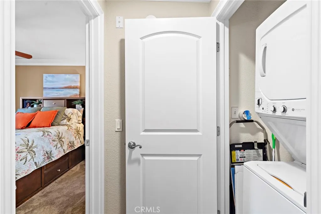 Absolutely Stunning Upper-Level Condo in a Quiet Interior Location within the Highly Sought-After Resort-Style Community of Mandevilla! Enjoy a low HOA of just $275/month. This beautifully upgraded 1-bedroom, 1-bath home includes a single-car garage featuring newer epoxy flooring and an oversized private balcony with two convenient storage closets. Showcasing impeccable taste and high-end finishes throughout, this home offers an open and airy floorplan enhanced by crown molding, designer paint, smooth ceilings, ceiling fans, raised panel interior doors, custom window and door casements, and oversized baseboards. Additional upgrades include newer central HVAC system, hypoallergenic carpeting, and stylish wood-look vinyl flooring in the kitchen. The completely remodeled gourmet kitchen is a true highlight, featuring granite countertops, a glass mosaic tile backsplash, custom dark wood cabinetry, stainless steel appliances (including microwave, dishwasher, and refrigerator), a coffered ceiling, recessed lighting, a stainless sink, and a breakfast bar with elegant pendant lighting. The spacious living room opens to the balcony, creating a seamless indoor-outdoor flow, while the full-size dining area connects perfectly to both the living room and kitchen—ideal for entertaining. There is also an inside laundry closet with a newer stackable washer and dryer for added convenience. The generous primary suite offers direct balcony access, a walk-in closet, and a beautifully updated bathroom with an extended granite vanity and a tiled tub/shower combo with a glass enclosure. Residents enjoy resort-style amenities including two sparkling pools, a spa, BBQ areas, tot lot, clubhouse, fully equipped fitness center, and lush, well-maintained grounds with scenic walking paths. Ideally located near top-rated schools, a sports park, shopping, dining, and a nearby golf course, this home offers the perfect blend of comfort, style, and convenience.