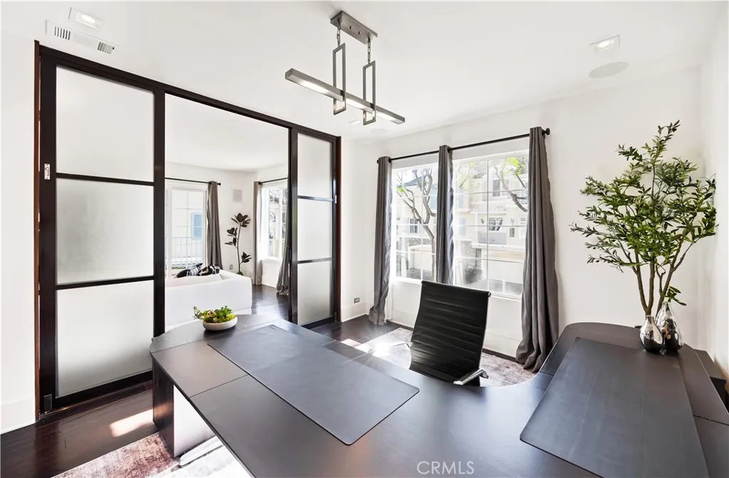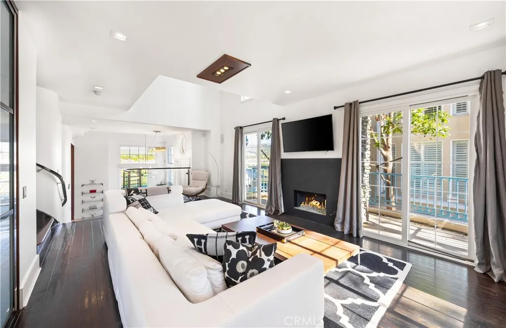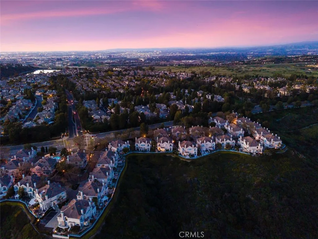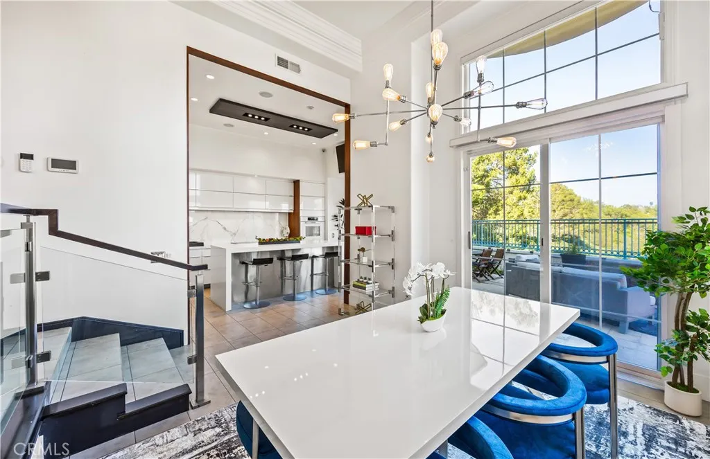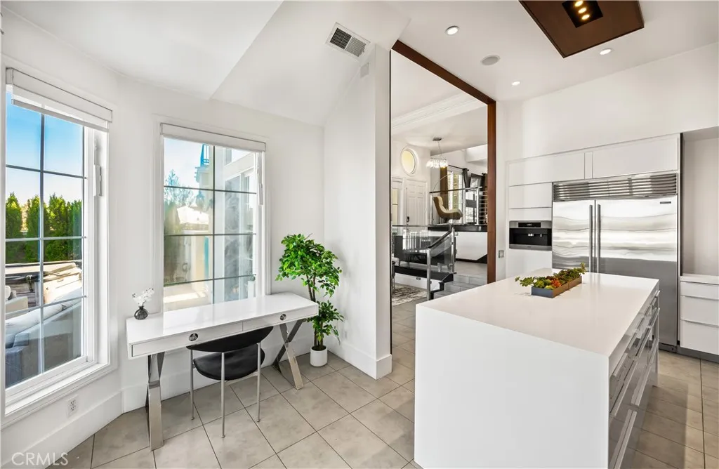 Located within the beautiful French-inspired gated community of Newport Ridge Vistas, this sophisticated townhome has been completely reimagined, offering a refined luxury lifestyle with elevated finishes including Italian Porcelanosa stone and tile in all bathrooms, custom light fixtures, architectural lighting, and a Sonos sound system inside and out. The home is sun-drenched, light and airy, with soaring ceilings creating an immediate sense of openness upon entry. The exceptionally large, double-sized kitchen—a significant upgrade over the original half, L-shaped kitchens in the community—is a gourmet showpiece featuring 16-foot ceilings and tranquil canyon views. Designed for everyday living and entertaining, it offers high-gloss flat-front cabinetry, white marble countertops and backsplash, a built-in Miele espresso machine, Miele wall oven, Fisher & Paykel dishwashers, Sub-Zero refrigerator, and a Miele induction cooktop. The kitchen and dining area flow seamlessly to a private rear-yard oasis framed by mature hedge trees for enhanced privacy, complete with a water feature, gas BBQ, and hot tub overlooking the canyon. Custom Bali privacy blinds in the kitchen and dining area allow natural light while maintaining privacy. A separate main-level office, divided by custom sliding glass doors, provides an ideal work-from-home setup. Upstairs, the primary retreat features a gas fireplace, private balcony with canyon views, dual closets, and Hunter Douglas custom motorized blinds with sheer and blackout options. The spa-like primary bath includes marble wall tile, soaking tub, walk-in shower, and dual-sink cabinetry with seated vanity. Two additional bedrooms and a full bath complete the floor plan. The home is further enhanced by a thoughtfully designed laundry center in the garage with premium washer and dryer, adjoining cabinetry, utility sink, and extensive custom built-in garage storage—an upgrade from the original layout where laundry was positioned near the garage entry. Security cameras and numerous designer upgrades complete this exceptional offering. Newport Ridge Vistas offers a large greenbelt, heated pool and spa, and proximity to shopping, dining, Newport Coast Elementary, and all Newport Ridge amenities including pools, spas, sport courts, parks, and playgrounds.