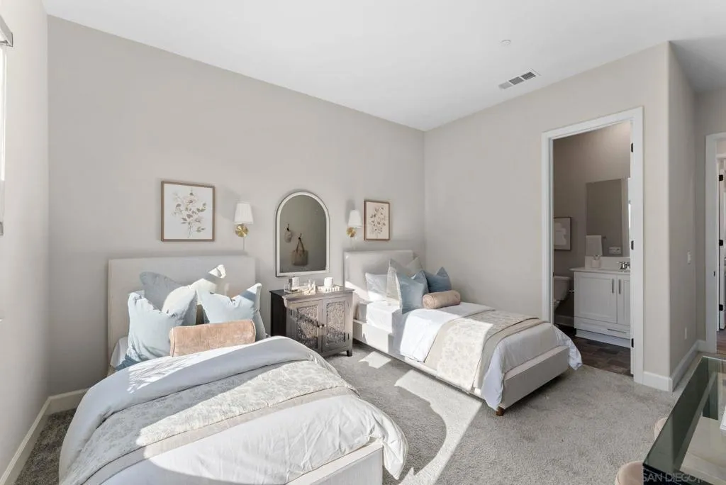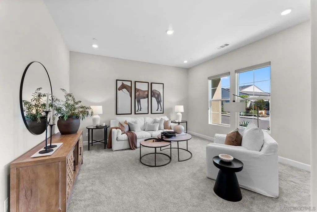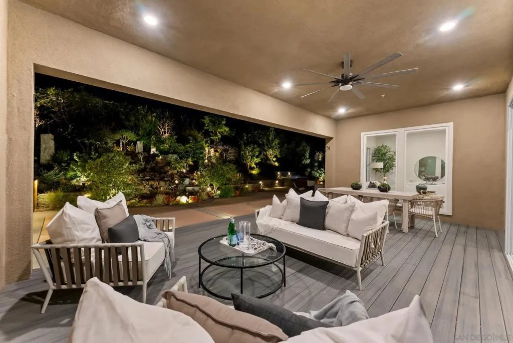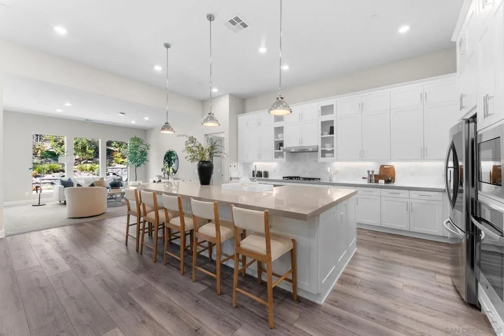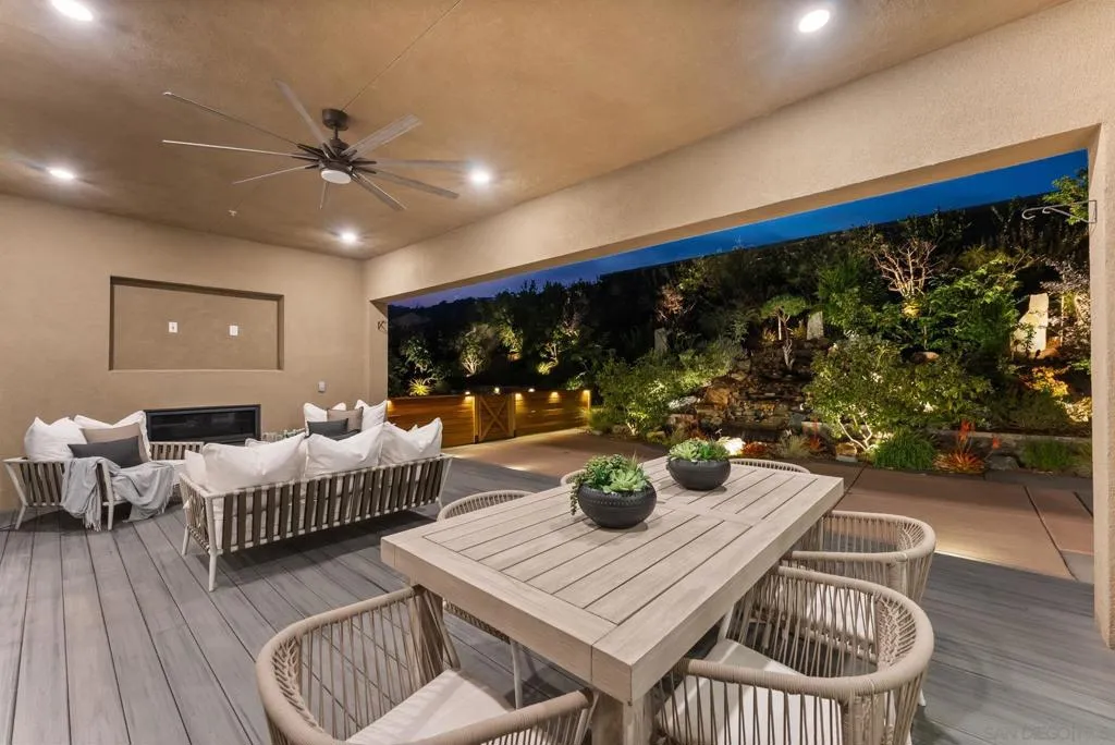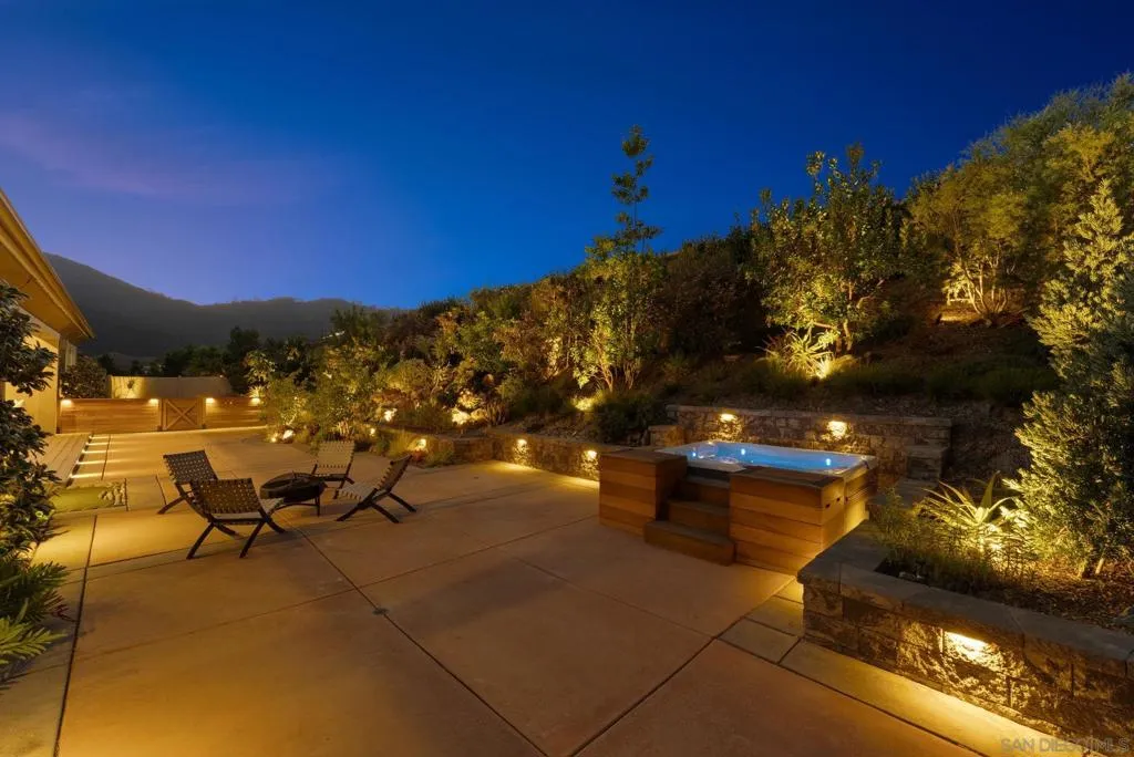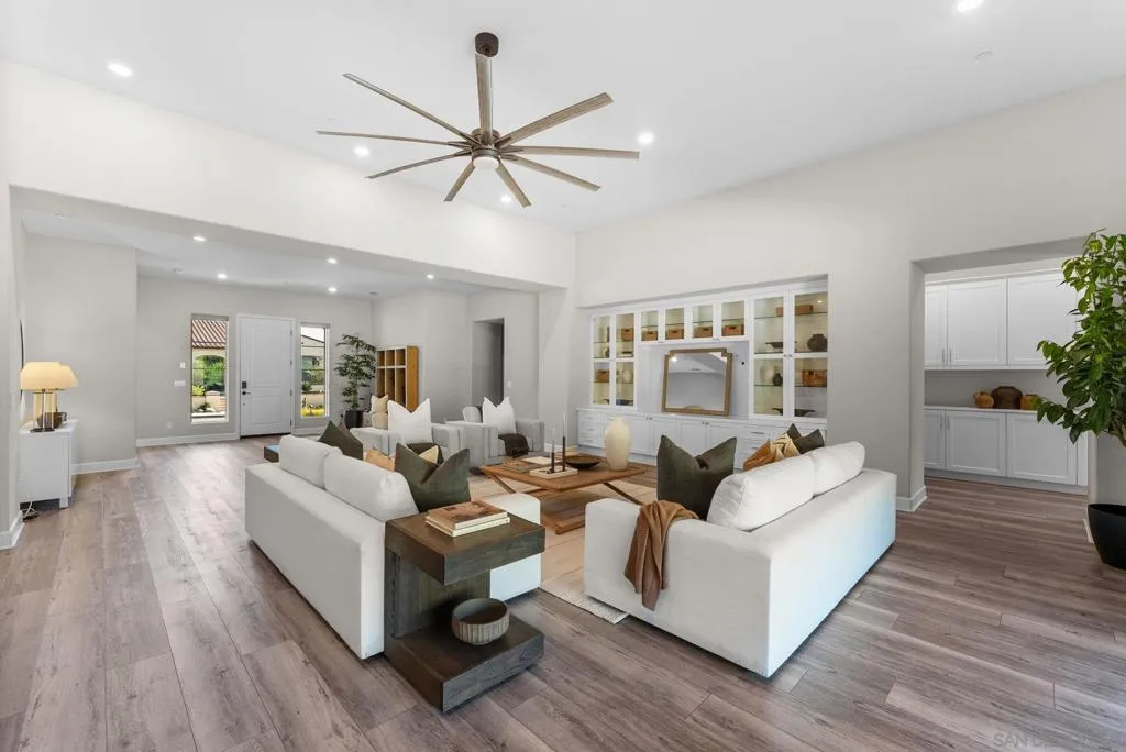 Situated within the highly sought-after Harmony Grove Village, this single-story residence offers a rare combination of thoughtful design, elevated finishes, and extensive upgrades. Set against scenic mountain ridgelines and a lifestyle centered around outdoor living, the home embodies both comfort and sophistication. Offering four generously sized en-suite bedrooms, an optional room, expansive living spaces, a three-car garage, and seamless indoor-outdoor living. The great room is anchored by 12-foot ceilings and stacked doors that open to a stunning outdoor water feature, creating a serene gathering space that connects effortlessly to the heart of the home. The kitchen is designed for both everyday living and entertaining, featuring an oversized island, premium appliances, and both walk-in and butler’s pantries. The California Room is equipped with a fireplace, TV hookups, ceiling fan, and recessed lighting. The grounds have been extensively improved with curated landscaping, hardscape, a custom putting green, private hot tub, and lush greenery. Additional upgrades include expanded solar with Tesla Powerwalls, upgraded HVAC, whole-house water filtration, custom built-ins, enhanced lighting, and smart features throughout. Harmony Grove Village offers access to trails, parks, equestrian amenities, and The Grove with a pool, spa, and outdoor gathering spaces. A rare opportunity to own one of the most extensively upgraded homes of its kind.