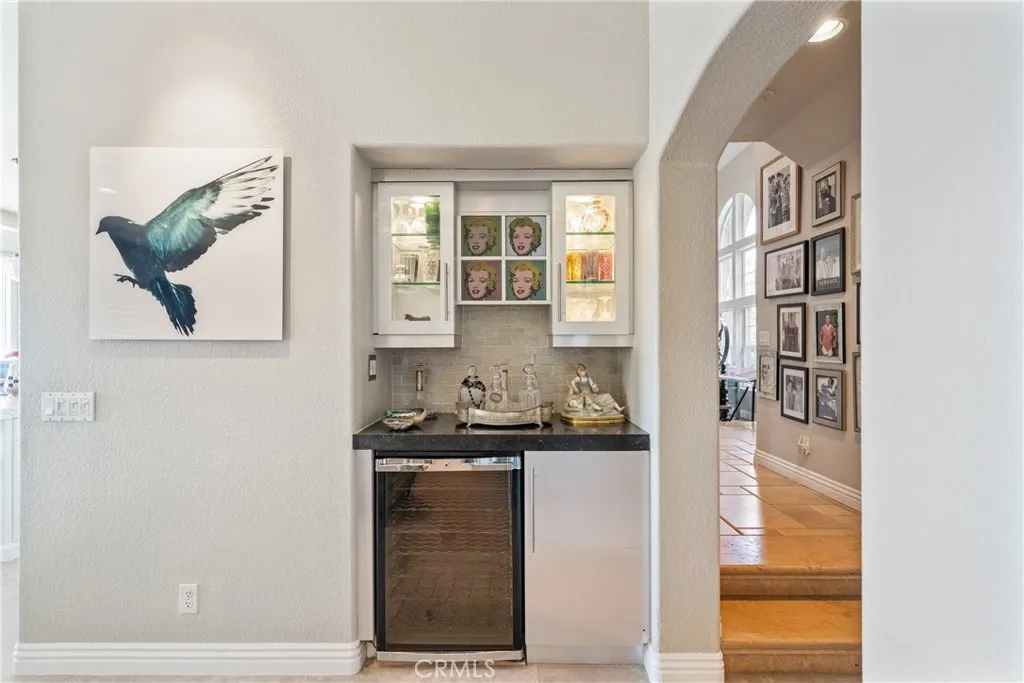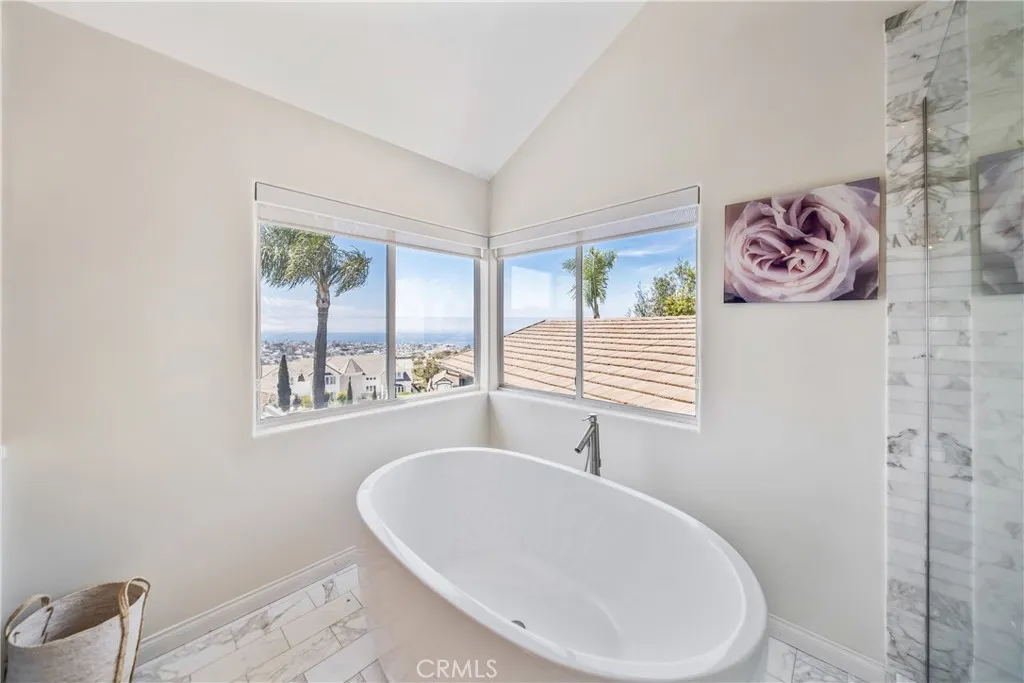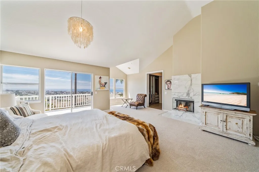 This light filled home is set on a premier San Clemente terrace, with sweeping 180 degree ocean, Catalina Island, and city light views in a refined coastal setting. This private enclave is a thoughtfully designed 4409 sq ft estate, featuring 5+ bedrooms and 6 bathrooms. A Dakota stone pathway leads past Cypress and a majestic olive tree, setting the tone of timeless European influences with quintessential Southern California style. Inside, a voluminous entryway with limestone and custom ironwork handrail, leads to vaulted ceilings, carved stone fireplaces, and generous living spaces with seamless indoor outdoor flow. The sunny attached casita, with ADU possibilities, has a private entrance, full bath, and temperature controlled wine room that is ideal for guests, creative use, wine pairing, or a wellness studio. The panoramic ocean views are on full display from most every room. The eat in family kitchen is cooking, showcasing top tier appliances, a statuary marble island, honed black marble countertops, a large pantry and open wood shelving. Even the kitchen sink has amazing views. Off of the kitchen is a den/tv room with an amazing hand carved fireplace, wine fridge and more sit down ocean views. A second, main level guest suite with full bath adds flexibility for all. The formal living room soars with 22 foot ceilings, walls of glass, and another amazing hand carved stone fireplace. The dining room offers perfect ocean views. The primary suite is a true retreat with commanding ocean views a custom built walk in closet, and glass doors that open to a breathtaking sundrenched deck with panoramic ocean views. The primary bath is a luxurious retreat with custom stonework, and a soaking tub with more ocean views. Outside, enjoy an expansive French limestone patio with French limestone columns under a huge shade trellis. Towering palms frame the solar heated French blue pool with waterfall spa and the custom Dakota stone and limestone finished fireplace. A sleek glass back fence offers unobstructed views. The teak outdoor shower adds a luxurious resort touch. Located at the end of a quiet cul-de-sac within the prestigious guard-gated community of Marbelhead, this home offers a 3 car garage and 3 additional parking spaces in the driveway. Moments from world class beaches, restaurants, shopping, schools, and recreation. This is a rare coastal soul offering combining elegant craftsmanship, ocean view serenity, and resort caliber amenities.
