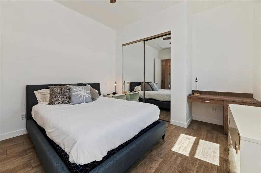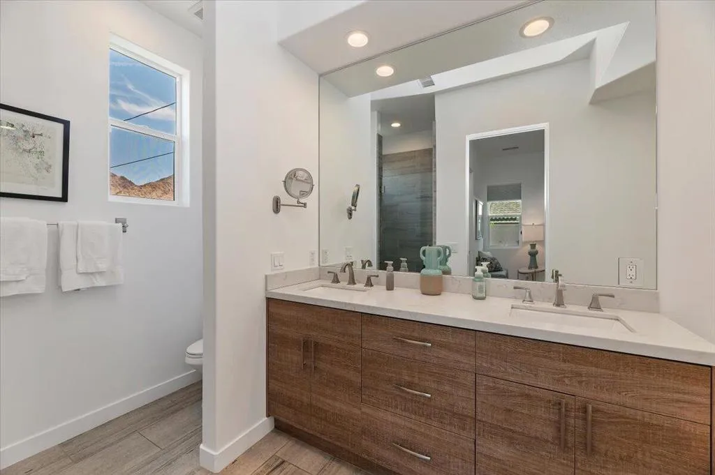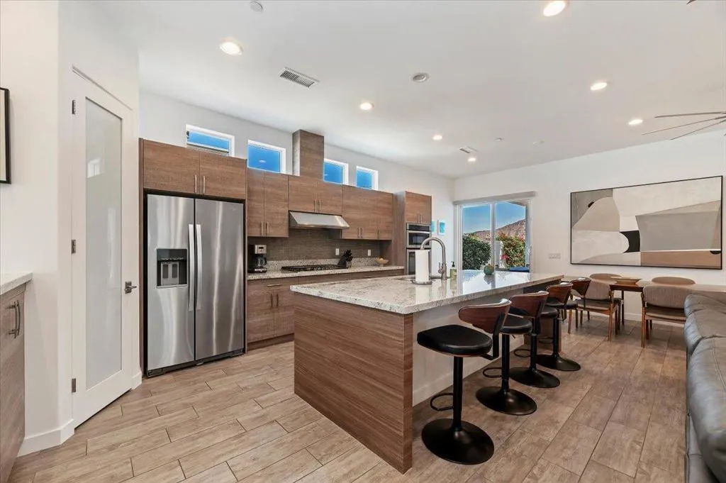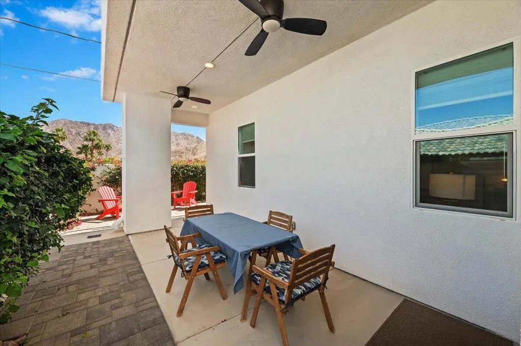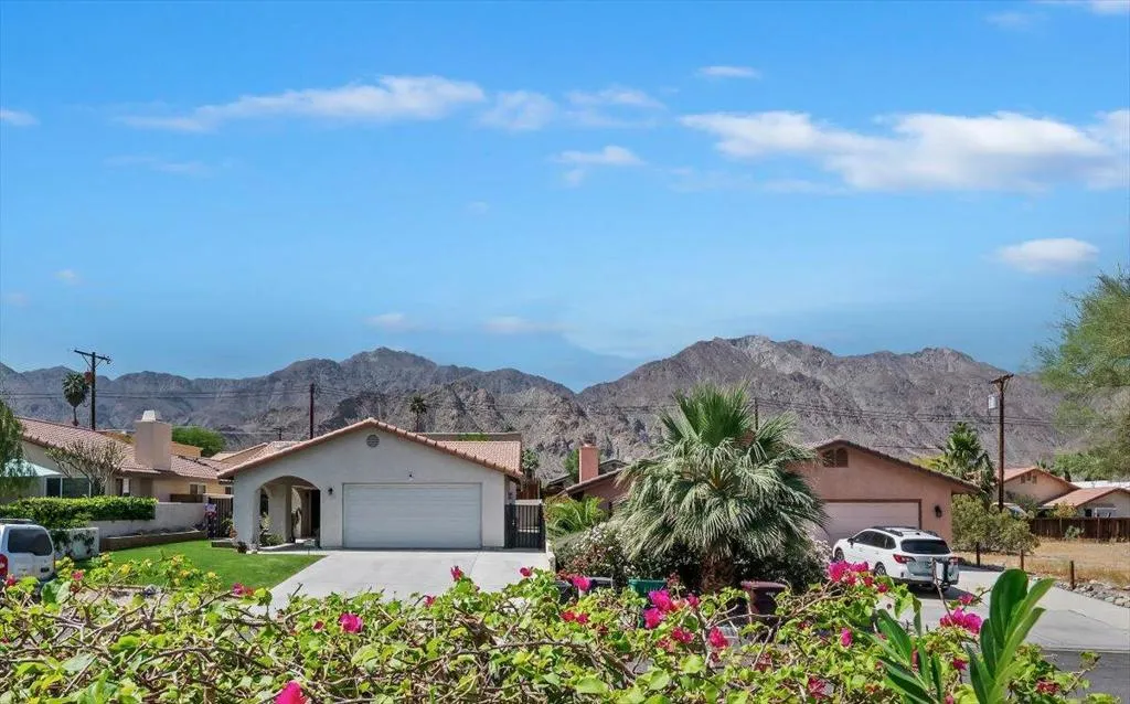 Refined West Facing desert-modern style home, featuring high ceilings and a bright, open feel. The floor plan offers two private suites, plus an additional bedroom that works perfectly as a guest room or home office with built-in workspace. Natural light pours in through elevated windows placed for both privacy and views, while quality finishes like custom cabinetry and striking stone surfaces add a polished touch throughout. The kitchen is designed for everyday living and entertaining, complete with an oversized island, ample storage, and integrated stainless appliances. The home embraces the indoor-outdoor lifestyle, with generous openings that connect living spaces to the outdoors and frame scenic mountain backdrops. Out front, enjoy a private pool and spa with a lounging shelf, along with a covered patio for shaded relaxation. A separate side yard provides space for outdoor dining or weekend gatherings. Ideally situated near top golf courses, parks, and just minutes from the shops and restaurants of Old Town La Quinta, this home offers a comfortable and stylish desert lifestyle.