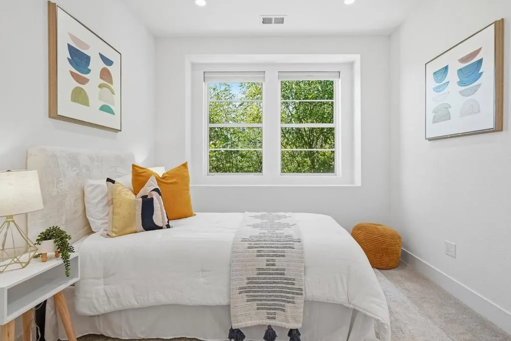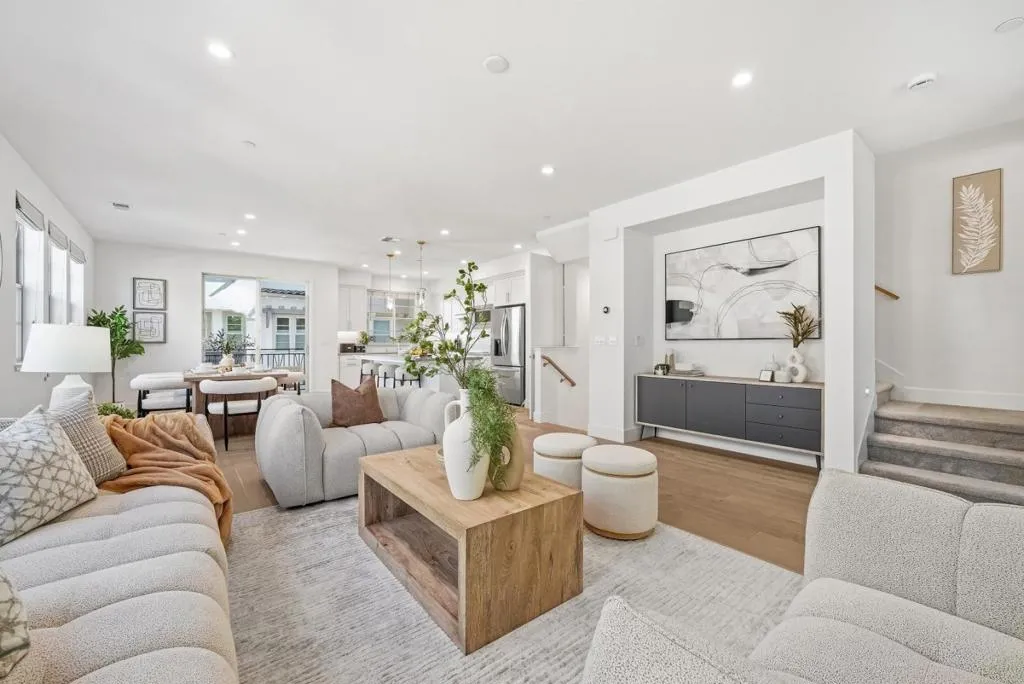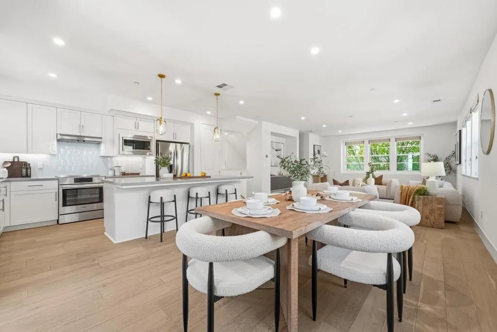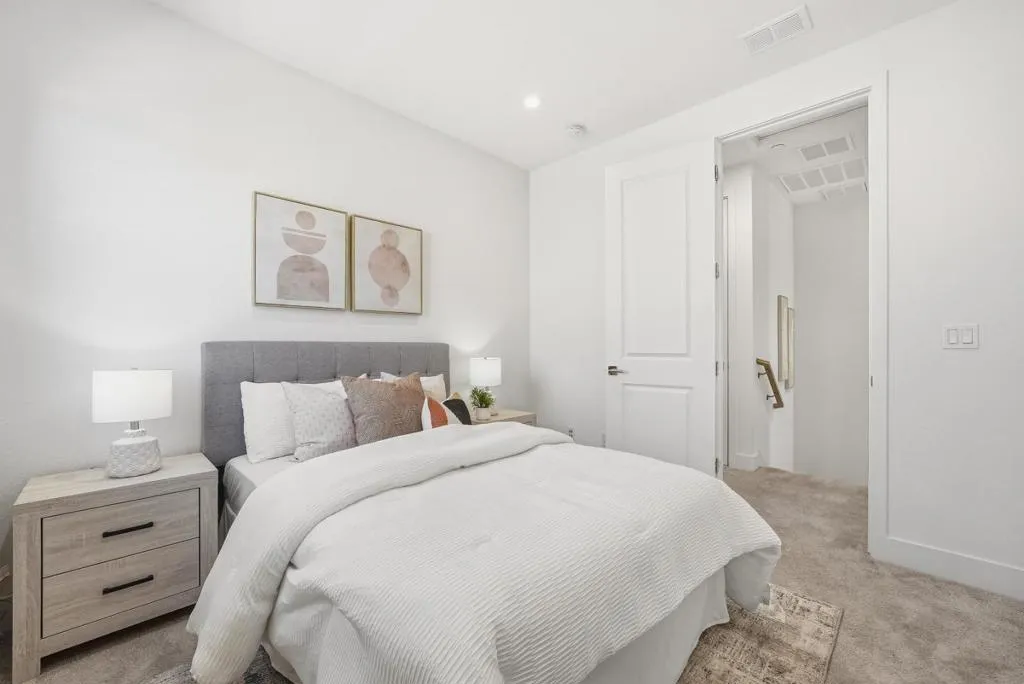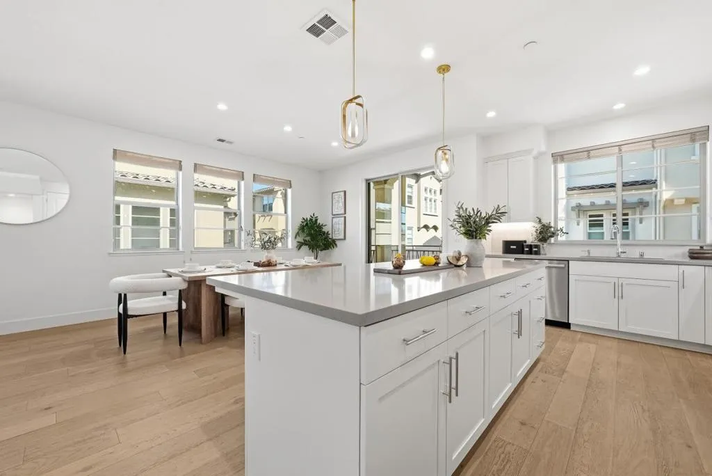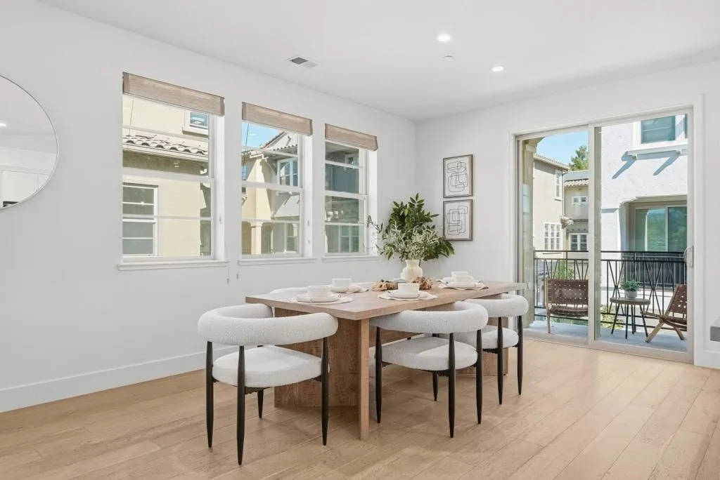 Welcome to this beautiful 2024-built end-unit townhome with 4 beds and 3.5 baths in convenient Mountain View. The home greets you with a cozy gated front yard. A ground-level suite with a bedroom and a full bath featuring a stall shower offers great flexibility for guests or extended family. The second level features an open floor plan with a spacious living room filled with natural light from large windows, flowing seamlessly into the dining area and a modern gourmet kitchen with an island, stylish countertops, a beautiful backsplash, stainless steel appliances, and ample cabinetry. There is a door to a private balcony for relaxation. A half bathroom is conveniently located nearby. The third floor hosts the primary suite with a spacious bedroom, a walk-in closet, and a modern en-suite bath with a double vanity and a stall shower. Two additional bedrooms share a full bathroom with a double vanity and a shower over tub. A washer and dryer on the same level add everyday convenience. Enjoy a prime location near restaurants and grocery stores, including Costco and Safeway, just minutes from Google and Microsoft, with easy access to Hwy 101 and 85 for a short commute to major tech companies. Zoned for top-rated Los Altos High School. Do not miss this great opportunity!
