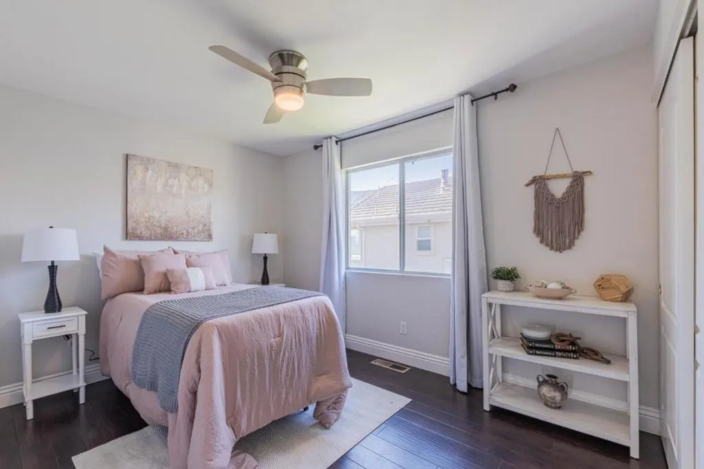 Welcome to 25215 Azalea Court, a beautifully updated two-story home just beyond the gated entry of the desirable Las Palmas, Summer Hill community. Residents enjoy HOA amenities including a pool, parks, and secure access, all surrounded by scenic hills. This 3-bed, 2.5-bath home offers 1,570 sq.ft. with dark laminate wood flooring throughout. Upon entry, you're welcomed by a formal living room and versatile study. The living and dining areas feature a striking dual-sided gas fireplace with stone accents. The remodeled kitchen includes white cabinetry, quartz countertops, stainless steel appliances, a peninsula, and gold-accented hardware. Updated lighting and plantation shutters enhance the modern feel. A whole-house LifeSource water filtration system adds everyday comfort. Upstairs, the spacious primary suite offers vaulted ceilings and a private deck with hillside views. The updated primary bath features a tile shower, soaking tub, and upgraded vanity. Two additional bedrooms share a Jack-and-Jill bath. The backyard offers a concrete patio and low-maintenance landscaping, ideal for relaxing or entertaining. The garage includes built-in storage cabinetry. Move-in ready and ideally located within one of Salinas most sought-after gated communities.