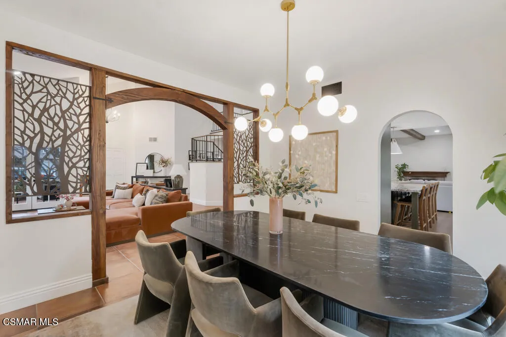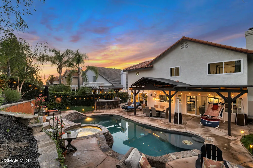 Welcome to 12208 Cherry Grove Street - a 4 bedroom, 3 full bathroom, true entertainer's delight pool home in one of the most desirable neighborhoods and cul-de-sac streets in the heart of Moorpark. Close to plenty of restaurants, top rated Moorpark schools, and shopping, this is an extensively upgraded, designer-finished home offering the perfect blend of luxury, comfort, and modern functionality. From the moment you arrive, you'll notice the thoughtfully curated exterior, enhanced lighting, freshly painted exterior, and fully refreshed landscaping, setting the tone for what awaits inside. The home features brand-new custom windows and sliding doors, light honey-toned waterproof luxury vinyl plank flooring throughout, fresh interior paint, designer baseboards, and upgraded lighting and fixtures that create a cohesive, elevated aesthetic. At the heart of the home is a stunning chef's kitchen, professionally designed with custom shaker cabinetry, striking Brazilian quartzite countertops and full-height backsplash, a massive island with bar seating, and a premium Dacor appliance suite including a six-burner range, double ovens, and drawer microwave, complemented by a Bosch dishwasher and Newport Brass fixtures . The luxurious primary suite offers a spa-like retreat with a freestanding soaking tub, high-end finishes, and a custom-designed closet system, while additional bedrooms and bathrooms have been tastefully updated with designer materials and thoughtful details throughout including a full bedroom and bathroom downstairs. Smart home features include dual-zone Nest thermostats and app-controlled pool systems, adding convenience and efficiency. With every detail carefully considered--from upgraded electrical and LED lighting to modern hardware and finishes--this home delivers a true turnkey experience with exceptional style and quality. Step outside to your entertainer's paradise - complete with a large outdoor barbeque and bar, fire pit, covered patio with exterior dining space, and sparkling saltwater pool and spa. Don't miss out on this masterpiece that you can move right in and enjoy!