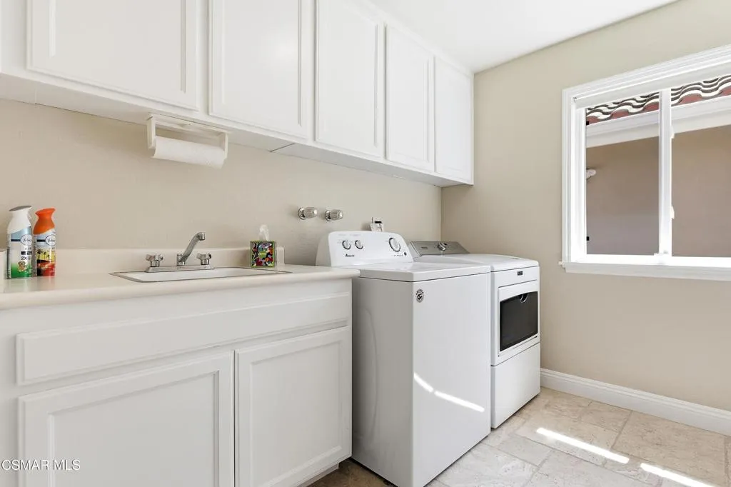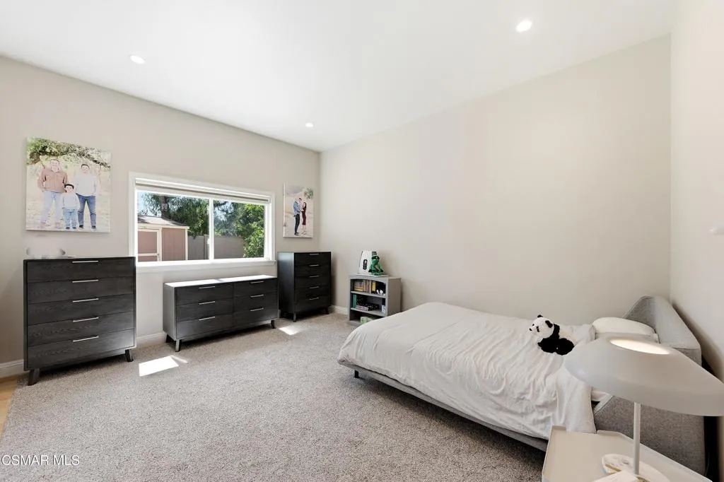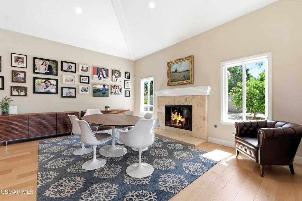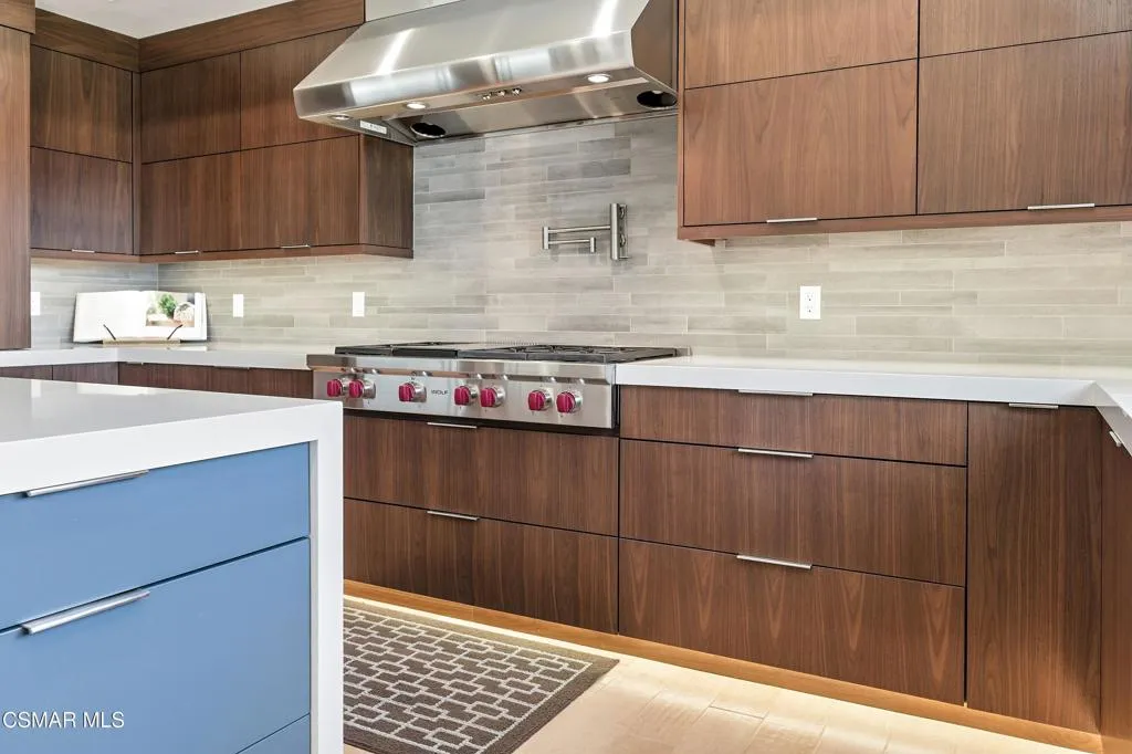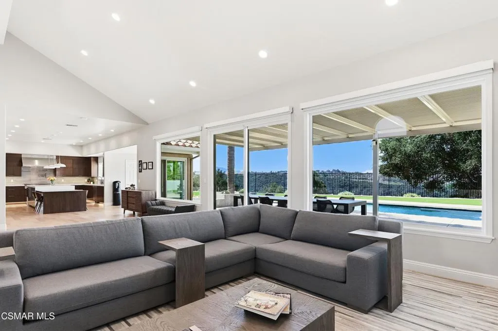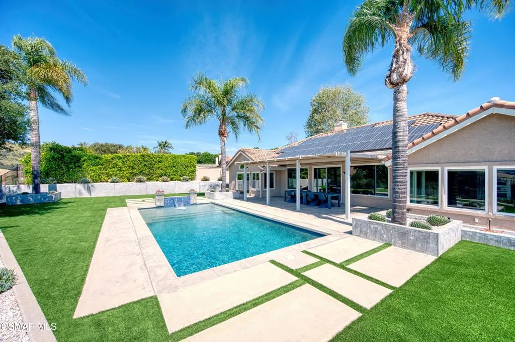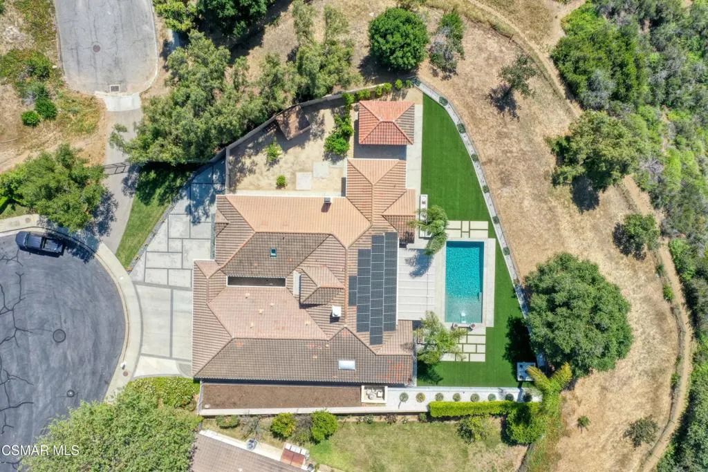 VIEW! VIEW! VIEW! Stunning SINGLE LEVEL home in Gated Lynnmere Estates on a cul-de-sac lot offers privacy and panoramic sunset views of Rancho Conejo Valley and Mount Boney. This Lynnmere gem has been professionally remodeled with no expense spared, offering an exceptional blend of custom luxury, comfort, and contemporary functionality.Enter through your private gated entrance and be welcomed by an over-sized solid Mahogany custom pivot door with a sleek solid steel linear handle. Step inside to an open, airy floor plan with raised ceilings creating an impressive sense of volume and light. The expanded, fully remodeled kitchen is a true showpiece, featuring: Rich walnut cabinetry with soft close drawers, a large center quartz waterfall island connected to a solid walnut custom waterfall kitchen table ideal for gatherings, Sub Zero refrigerator, Sub Zero mother in law refrigerator, and Sub Zero 146-bottle dual-zone wine refrigerator, two Wolf ovens, including a steam oven, an oversized 48'' Wolf gas range with a solid steel pot filler, and a spacious pantry. The kitchen opens seamlessly to the great room, where a warm fireplace and expansive picture windows frame breathtaking mountain and trail views, filling the space-with natural light creating a strong connection to nature. The primary suite is a serene retreat with a fully remodeled bathroom featuring: His and hers shower, heated flooring, newer cabinetry, sinks, mirrors, and toilet and premium Grohe fixtures. The guest bathroom has also been beautifully updated with new cabinetry, toilet, mirrors, faucet, and shower regulator. Additional major upgrades include Replacement of all accessible attic ducts, three newer HVAC systems, each equipped with germicidal UV Light, completely paid off solar system, roof replaced in 2017 with two layers of underlayment, appx. 1,000 sq ft of permitted additions designed by an engineer and architect. The south wing offers two bedrooms and an ADA prepared bathroom with heated flooring--perfect for multi-generational living or guests. Throughout the home, you'll find engineered maple flooring, 5'' baseboards, and freshly painted walls and ceilings. The exterior is equally impressive, featuring low maintenance synthetic turf, concrete, DG, and river rock landscaping, fruit trees, zero maintenance fencing that preserves privacy without obstructing views, a 10x10 Tuff shed for storage, RV parking approximately 9'x40' (HOA approved as long as it's not visible from the street). Enjoy year-round outdoor living in the south side lanai, complete with: Grill, refrigerator, fireplace, fans, heaters, lighting & fire-resistant wood construction. The pool was completely rebuilt in 2020, featuring pebble tech finish, elegant tile work, a baja-shelf, auto-filler, remote controlled lighting, and a tension safety net. For peace of mind, the home includes: six exterior Ring floodlight cameras, ring doorbell, ADT security system on all windows & doors. The three-car garage is equipped with: Two Tesla batteries, 240V/25 amp EV chargers, contemporary roll up doors with backup batteries and deadlocks & additional 9'x9' storage room for bikes, toys or camping gear!This home truly has every bell and whistle--luxury upgrades, thoughtful design, and meticulous care throughout. There is simply nothing else like it!