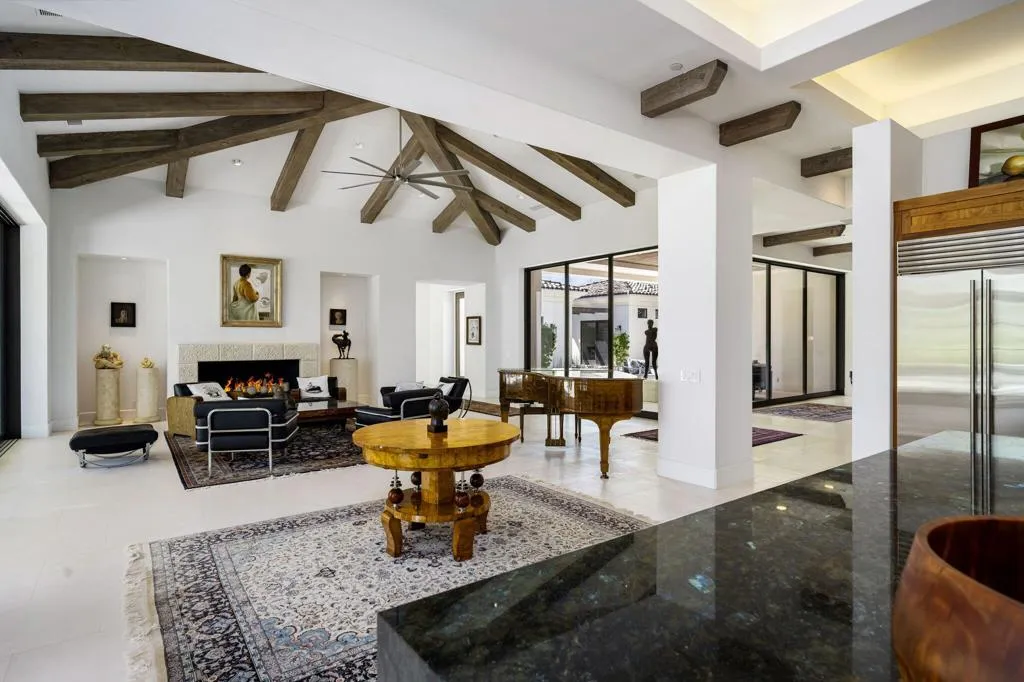 Situated on a sweeping wide lot perched above the 8th hole of Tradition Golf Club, this exceptional residence captures panoramic mountain and lake views from nearly every angle. Designed to impress, the home offers 4 bedrooms plus bonus / theatre room, with expansive indoor-outdoor living spaces ideal for both relaxation and entertaining. A private courtyard welcomes you with tranquil fountains, sculptural elements, and beautifully curated Zen rock and succulent gardens. Enter through a dramatic pivot door and immediately experience the breathtaking rear vistas framed by walls of glass. The great room showcases wood-beamed ceilings, a striking stone fireplace, and pocketing sliding doors that seamlessly open to both the front courtyard and rear patio, creating a true indoor-outdoor lifestyle. The chef's kitchen is thoughtfully designed with a large island, light wood cabinetry, stainless steel appliances, a butler's pantry, walk-in pantry, and a charming breakfast room. An expansive Game Room / Library features custom built-ins, a wet bar with wine refrigeration, and a comfortable sitting area--perfect for gathering with family and friends. The luxurious primary suite is a private retreat, complete with a floor-to-ceiling stone fireplace, dual walk-in closets, spa-inspired bath with soaking tub, gigantic two-person walk-in shower, dual vanities, dual water closets, and an outdoor shower. A spacious art studio with en-suite bath offers flexibility and can easily be converted into two additional bedrooms. Guests will appreciate the detached two-bedroom casita with its own living room, providing comfort and privacy. Additional features include a 4 car garage, and solar panels for energy efficiency. Offered partially furnished per inventory.