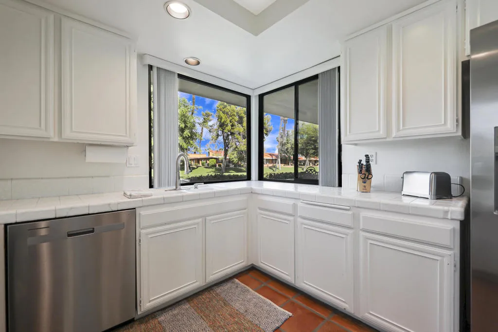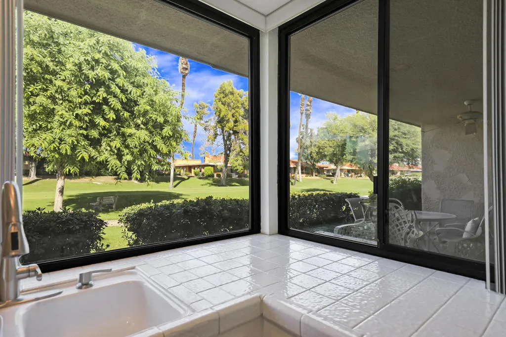 Experience the perfect blend of timeless elegance and modern comfort in this meticulously maintained home. Rustic Spanish tile floors pair beautifully with vaulted ceilings, while the soft, carpeted living room creates a warm and inviting atmosphere. The updated kitchen features newer appliances and crisp white tile countertops for a clean, classic look.Dual-pane windows enhance energy efficiency and frame picturesque views throughout the seasons. Both bathrooms have been upgraded with contemporary showers, and the primary suite includes a spacious double vanity for added luxury. The home is fully handicapped accessible, with plush carpeting in each bedroom for comfort. Plantation shutters along the west side open to stunning golf course and mountain vistas--ideal for unwinding at sunset. A newer HVAC system and water heater add peace of mind.Sunrise Country Club offers secure, guard-gated living and an impressive array of amenities, including 746 residences, an 18-hole Par 64 golf course, nine championship tennis courts, ten pickleball courts, twenty-one pools and spas, and a clubhouse with dining, lounge, grille, pro shops, and a fitness/activity center. Two new bocce ball courts expand the recreational options. Located in the heart of Rancho Mirage, the community is close to premier shopping, entertainment, and medical facilities, with Palm Springs International Airport just 20 minutes away.