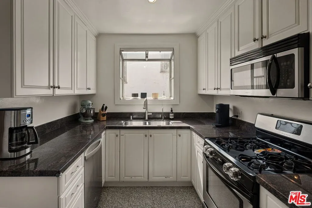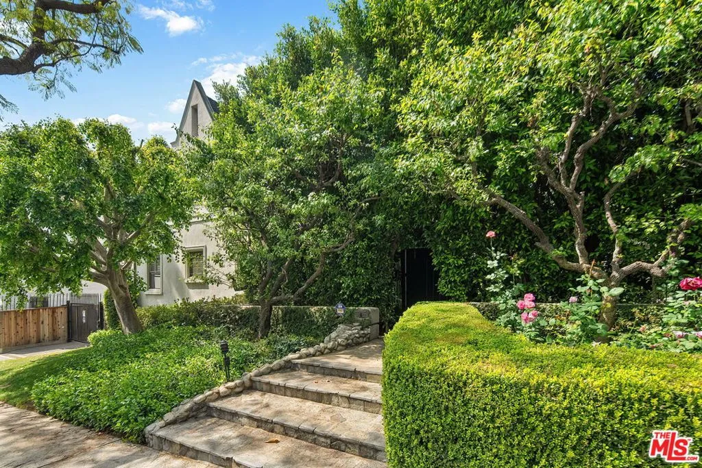 Old-world charm meets modern convenience in this beautifully detailed two-bedroom, two-bath home overlooking a sparkling pool and exceptionally lush garden courtyard in the heart of West Hollywood. A rare opportunity to own in the coveted Chateau Brittany, one of the area's most enchanting communities, known for its remarkably landscaped grounds filled with mature greenery, blooming roses, and peaceful outdoor spaces that create a warm and welcoming, resort-like atmosphere rarely found in condo living. Tucked behind secure gates, the property opens to a storybook courtyard featuring a pool, spa, and tranquil stream with waterfall, offering a serene escape in the middle of the city. Inside, the home is filled with character and natural light, with bay windows overlooking the pool and gardens, rich hardwood floors, elegant moldings, and a fireplace that anchors the living room. A formal dining room provides a beautiful space for entertaining, while the thoughtful layout offers comfortable flow for everyday living. Both bedrooms are generously sized with ample closet space, including a spacious primary suite with an en-suite bathroom. The kitchen connects easily to the dining room, and in-unit laundry adds everyday convenience. Additional storage outside the home provides valuable extra space.Side-by-side parking, secure buzz-in access, and security camera monitoring offer added comfort and peace of mind. Ideally located in the heart of West Hollywood, just moments from dining, shopping, and nightlife, yet quietly tucked away behind lush gardens and gates, this special home offers the perfect blend of charm, privacy, and convenience.