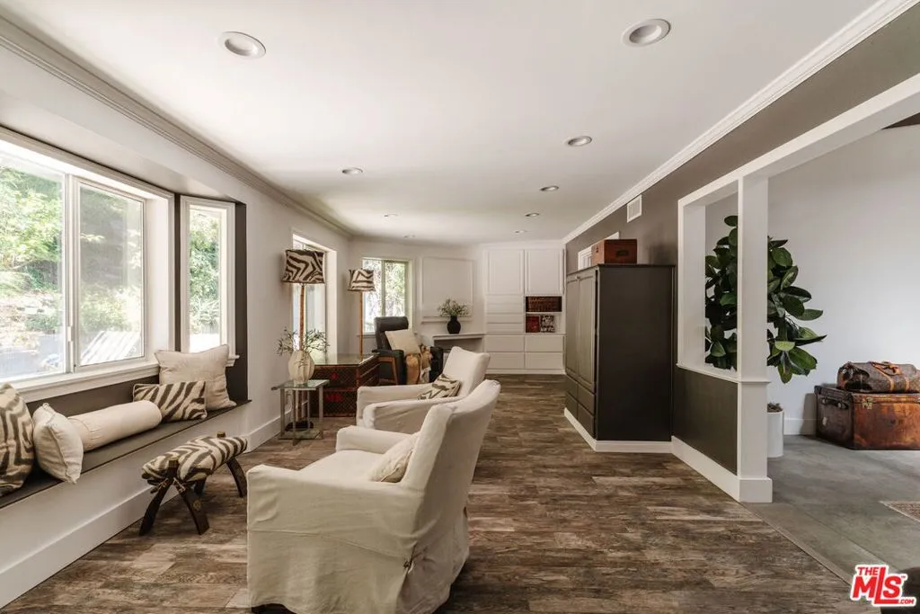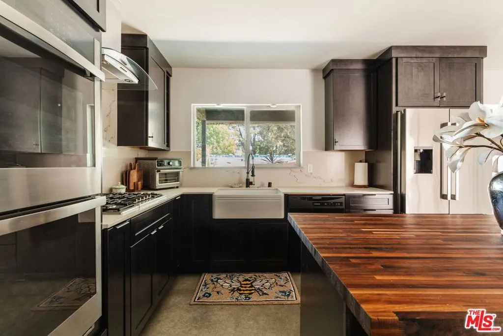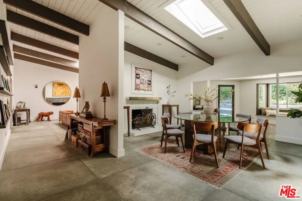 Welcome to iconic mid-century living in this Charles Du Bois residence, thoughtfully reimagined to elevate everyday livability while preserving its architectural roots. Vaulted, beamed ceilings and skylights crown the main living areas, inviting abundant natural light and creating an airy, serene atmosphere throughout. The living spaces flow effortlessly from the beautifully updated kitchen, with custom cabinetry, generous storage, and elevated finishes, into the dining and living rooms that extend seamlessly to the backyard for true indoor-outdoor connection. The completely private, lush backyard feels like a true sanctuary with a solar-heated pool and multiple areas for lounging and entertaining; it's the perfect space for slow mornings, sun-soaked afternoons, and memorable evenings with family and friends. The primary suite opens directly to a private corner of the backyard, extending the home's sense of serenity and connection to nature. Two closets provide functional storage, while the spa-like en-suite bathroom offers ease and elegance with dual vanities, a glass-enclosed shower, and a freestanding tub. Three additional generously sized bedrooms provide comfort and flexibility for family and guests, while the versatile den/bonus area is ideal as an additional living space, home office, playroom, fitness studio, or creative retreat. Additional highlights include a two-car garage with direct access to the home and a separate storage shed for added convenience. The home has been thoughtfully and extensively remodeled over the last several years, including a completely redesigned kitchen and bathrooms, new flooring throughout, fresh interior and exterior paint, new interior and exterior doors, updated HVAC and furnace, a new water heater, a new roof, and enhanced landscaping, allowing you to move right in and enjoy with ease. Ideally positioned in the highly desirable West of Valley Circle neighborhood, this home is just moments from shops, restaurants, markets, and scenic hiking trails. Enjoy living in close proximity to The Commons at Calabasas, the Topanga Mall and Village, Platt Village, and the 101 for easy commuting. Zoned for award-winning schools, including Lockhurst Elementary, Hale Charter Middle, and El Camino Real Charter High School. A rare alignment of design, discretion, and location; this is Woodland Hills living, elevated.