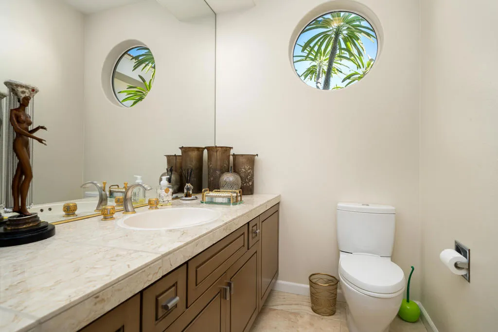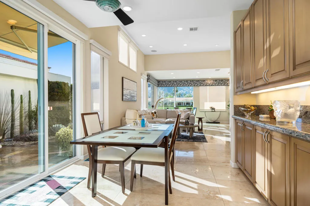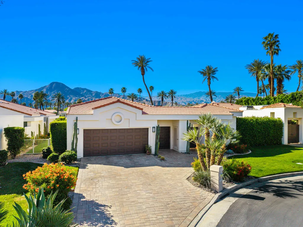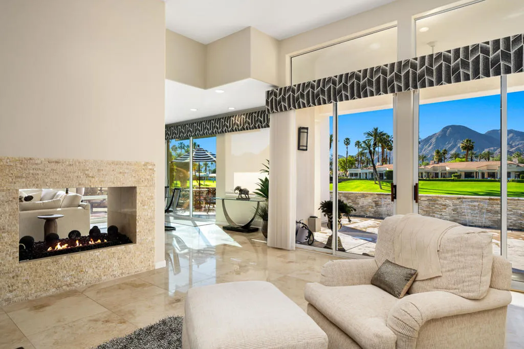 Positioned on one of the premier South-facing interior lots, this exceptional residence captures sweeping, unobstructed views of the 17th fairway, tranquil lake, and dramatic Mountain backdrop. Perfectly situated near the end of a quiet cul-de-sac, the home enjoys an elevated vantage point that maximizes sunlight and showcases the shimmering water, lush green, and surrounding landscape--arguably one of the finest view locations in the community.This beautifully remodeled Hazeltine Floorplan offers approximately 3,400 square feet of refined living space, including 4 bedrooms and 4.5 baths, with a private freestanding casita. Designed to embrace its stunning setting, the expansive rear patio is an features a soothing custom water feature across the back patio and ideal orientation for enjoying breathtaking desert sunsets over the fairway and mountains. Inside, the home has been thoughtfully upgraded with travertine flooring, granite countertops, custom cabinetry, and updated lighting throughout, complemented by tasteful designer furnishings. The spacious kitchen opens seamlessly to the living areas, all oriented to capture the spectacular views beyond. The Primary Suite is a private retreat, separate his-and-hers bath areas. Guests are comfortably accommodated in the main home and detached casita, offering both privacy and flexibility.Located just steps from the Community Pool and Spa, this home combines luxury, comfort, and an unmatched view setting--truly a rare opportunity in Desert Horizons.