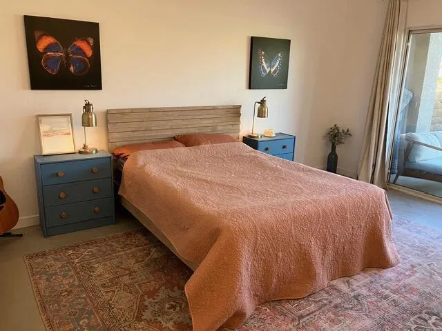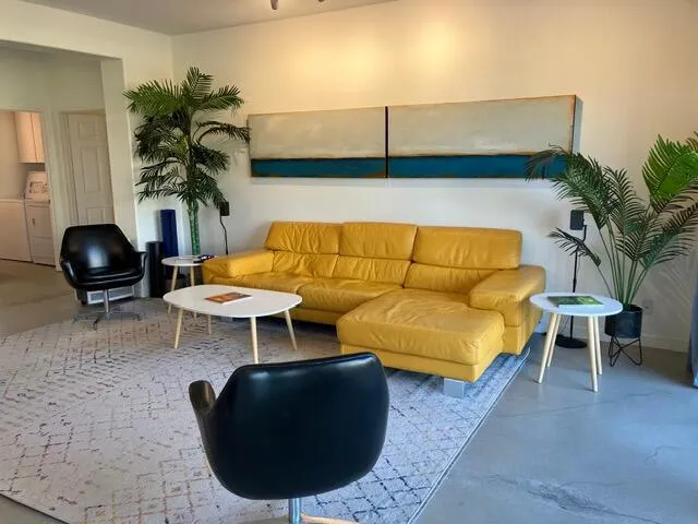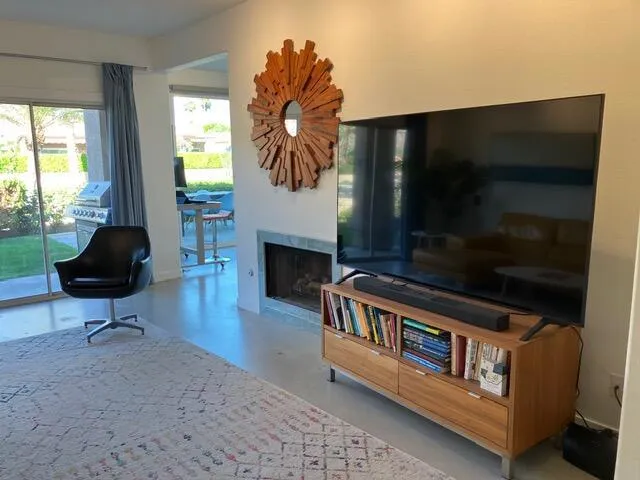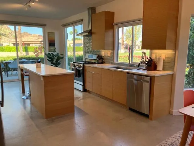 Set within the guard-gated community of Laguna de la Paz, this beautifully positioned 3 bedroom, 2 bathroom mid-century modern decorated home offers spectacular lake and mountain views. Clean lines, a desirable floor plan, and concrete floors throughout give the home a stylish, modern feel while still feeling warm and inviting. Designed for both everyday living and relaxed entertaining, the interior spaces flow comfortably and take full advantage of the surrounding scenery. Whether enjoying a quiet morning coffee or an evening with friends, the setting captures the best of desert living. Laguna de la Paz is known for its resort-style amenities and beautifully maintained grounds. The HOA covers the roof, exterior stucco, exterior paint, and landscaping outside your gates, offering ease of ownership and added peace of mind. Residents enjoy access to 15 pools, 16 spas, a 5-acre lake, pickleball courts, tennis courts, a fitness center, billiards room, and clubhouse. This is a wonderful opportunity to own a distinctive home in one of La Quinta's most sought-after communities, where mountain views, lake views, and exceptional amenities come together in a truly special setting. Professional Photos 3/29