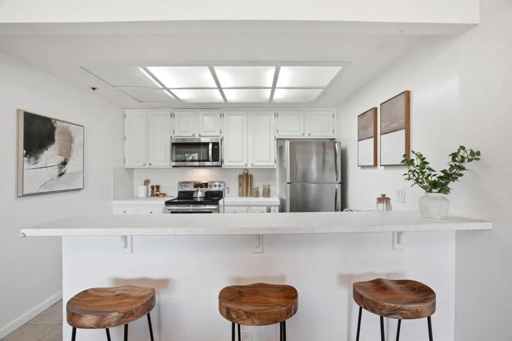 This 1360 sqft unit is situated in the gated Miramar Terrace community and has been beautifully maintained with modern updates. This spacious unit features laminate flooring throughout, a remodeled kitchen with stainless steel appliances and a breakfast bar, and a bright living area with a cozy wood-burning fireplace that opens to a private balcony. The primary suite includes mirrored closet doors and dual sinks, while the second bedroom offers an abundance of natural light to come in through the window. Additional highlights include in-unit laundry, recently upgraded HVAC, and an additional storage unit. Enjoy resort-style amenities including pool, spa, sauna, gym, clubhouse, and secure covered parking. Ideally located in the heart of Silicon Valley with easy access to major highways, tech campuses, shopping, dining, and entertainment. Don't miss this opportunity to enjoy refined living in one of Santa Clara's most convenience and desirable communities!