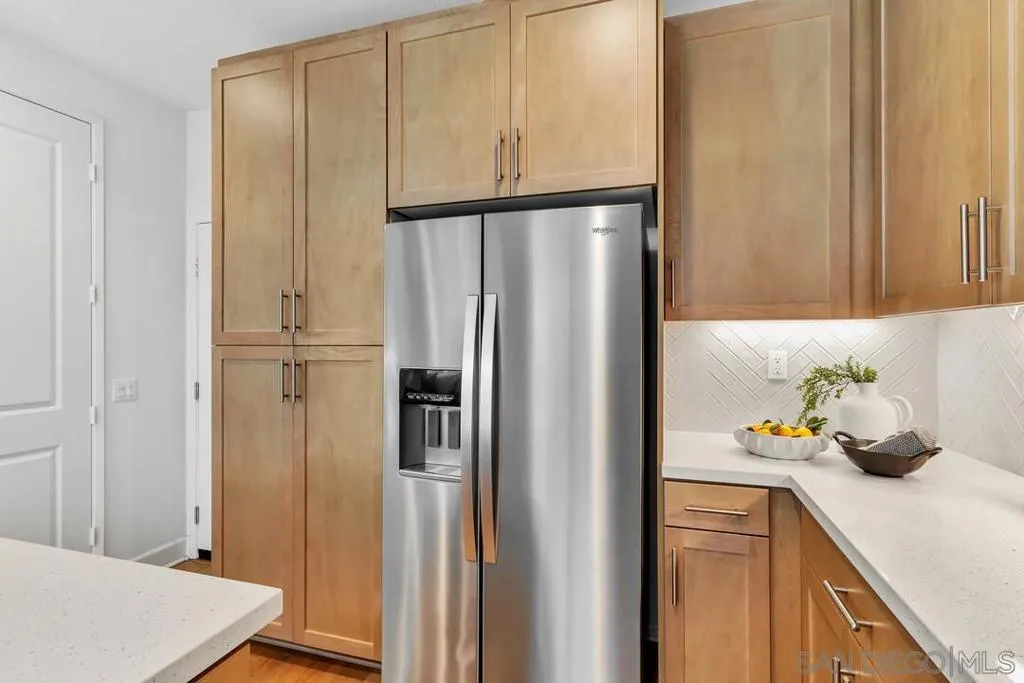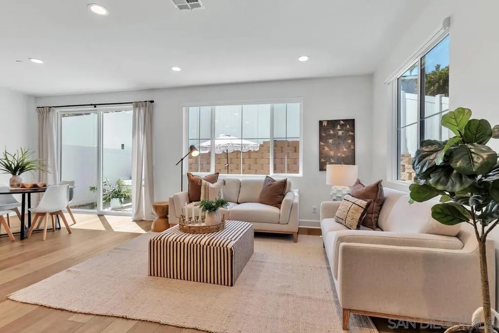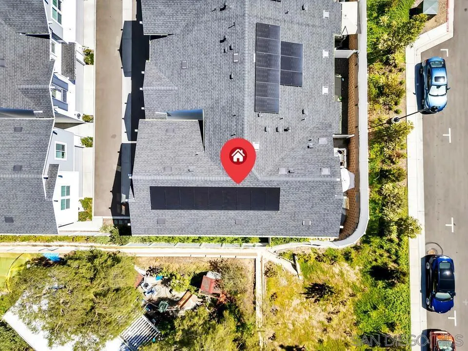 Built in 2023, this coastal cottage townhome is 3-bedroom, 2.5-bath home with a versatile loft offers 1,818 sq ft of modern living in a newer upscale all-electric community. The largest floor plans and a desirable corner unit, this home combines privacy, functionality, and thoughtful upgrades throughout. With completed landscaping, designer window treatments include motorized Hunter Douglas Vignette shades and custom white poly shutters add to the modern finishes. With these $45,000 builder upgrades in place, buyers can enjoy immediate move-in at ease. The open-concept main level is filled with natural light and showcases luxury vinyl plank flooring and designer touches throughout. The upgraded kitchen features full-height tile with a herringbone backsplash, maple shaker cabinetry creating a refined yet highly functional space ideal for everyday living and entertaining. Upstairs, the spacious primary suite offers a walk-in closet and a well-appointed bath with chrome hardware finishes. Two additional bedrooms, a full bath, an enhanced laundry area with added storage, and a generous loft provide flexible living space for a home office, media room, or play area. The staircase features modern square vertical balusters, adding to the home’s contemporary aesthetic. A convenient powder room and direct access to the 2-car garage with EV charger-ready wiring and epoxy flooring complete the first floor. Designed for energy-efficient living, the home includes owned solar, smart home technology features, and all-electric systems. The private backyard is fully landscaped and offers a comfortable space to relax or entertain. Residents enjoy resort-style amenities including a pool, spa, and play areas, all conveniently located near Mission Trails and Santee Lakes. Nearly new and thoughtfully upgraded, this home offers exceptional value, style, and convenience in today’s market.