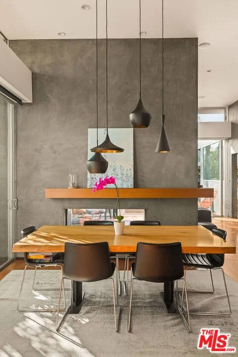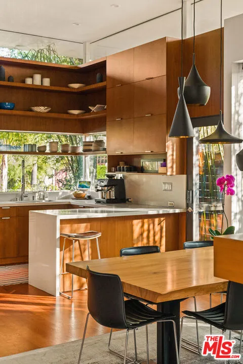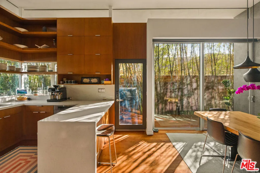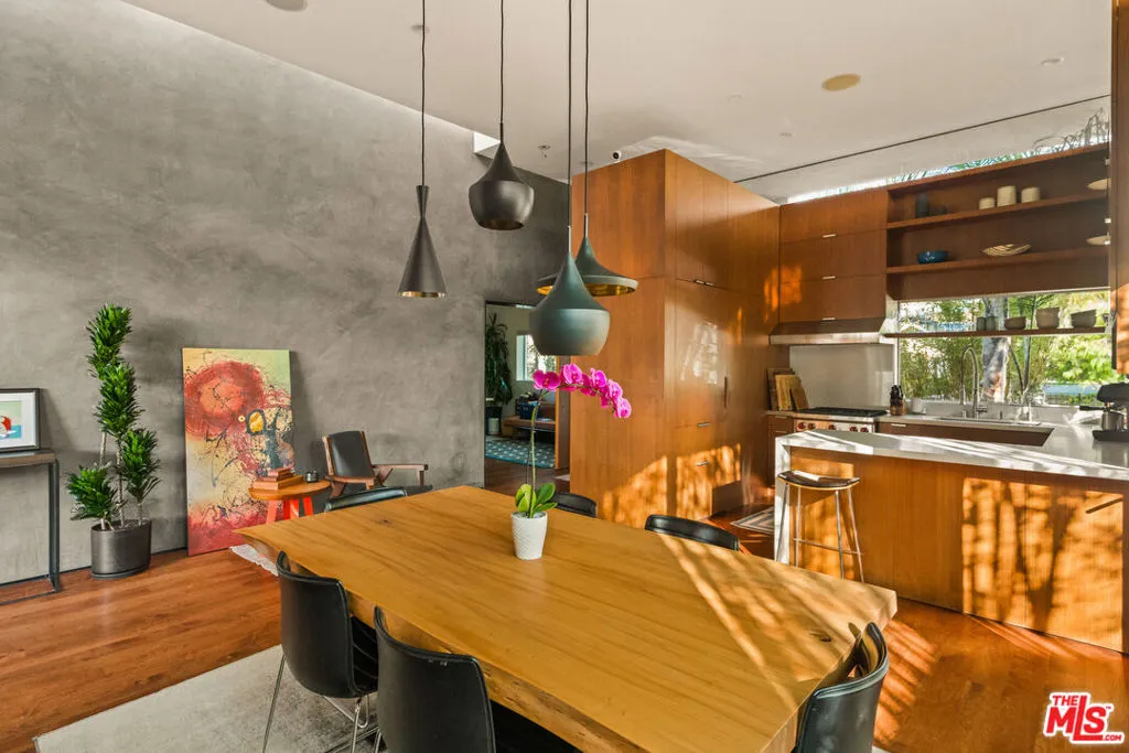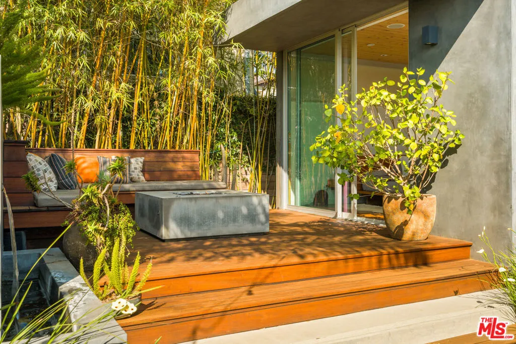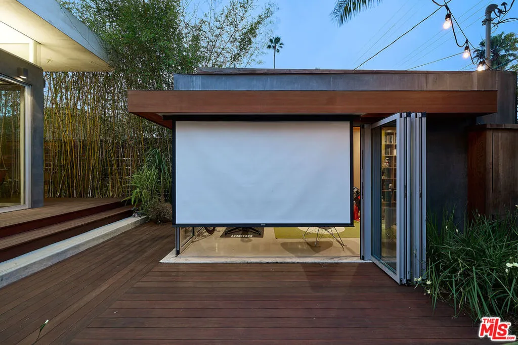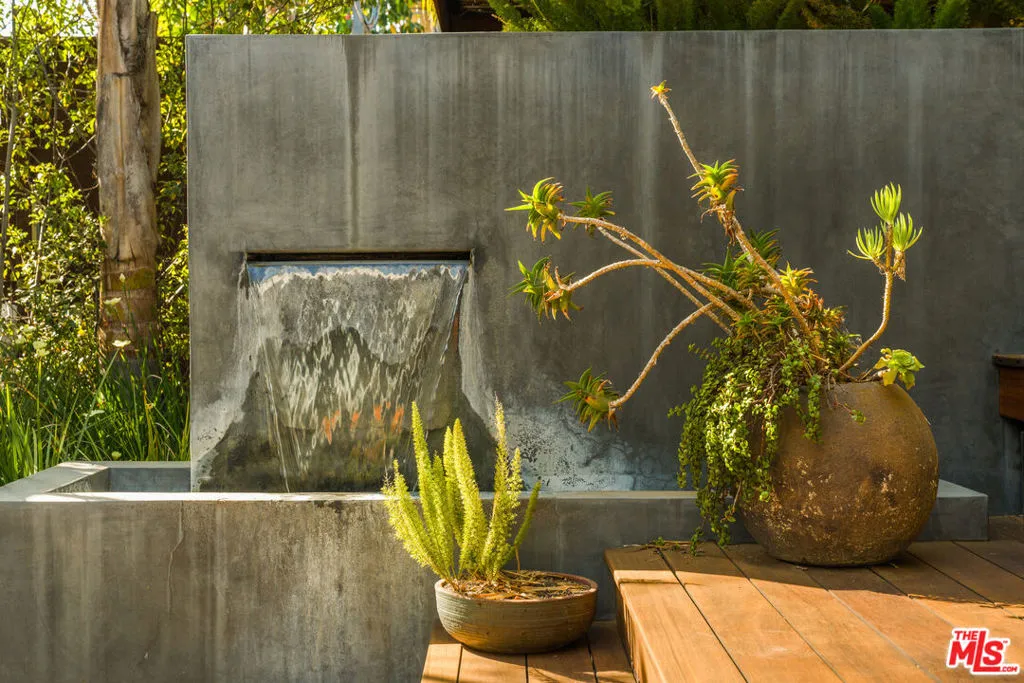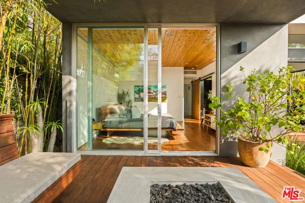 Tucked behind thoughtfully designed landscaping, this 2-bedroom, 2-bath architectural gem offers a rare blend of warmth, creativity, and modern comfort. The home has been extensively remodeled with a focus on natural materials and clean, contemporary lines, featuring rich, custom floor-to-ceiling woodwork, clerestory windows, sculptural concrete walls, and a beautifully extended fireplace that brings a cozy, grounding presence to the main living space. The kitchen is both stylish and functional, complete with upgraded appliances and statement Tom Dixon pendant lighting that adds a soft, ambient glow. Outdoor living is truly exceptional, with a custom wraparound wood deck designed for gathering and unwinding, including a built-in lounge, gas fire pit, bistro lighting, and a serene concrete fountain. The grounds, designed by Jay Griffith, feel both lush and intentional, creating a private, retreat-like setting. A converted garage adds incredible flexibility, offering custom built-ins, a polished concrete floor, and NanaWall doors that open effortlessly to an outdoor movie screen, perfect for relaxed evenings under the stars. With new electrical and a seamless connection between indoor and outdoor spaces, this home is an inviting sanctuary that feels both elevated and deeply livable.