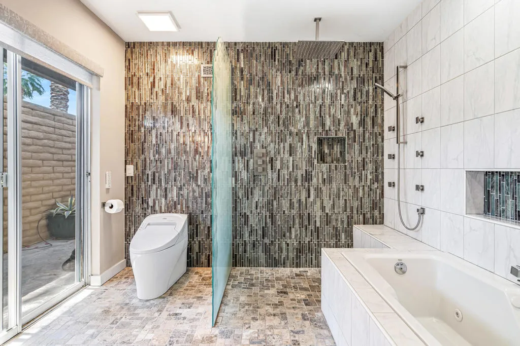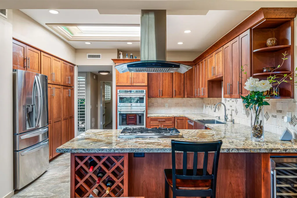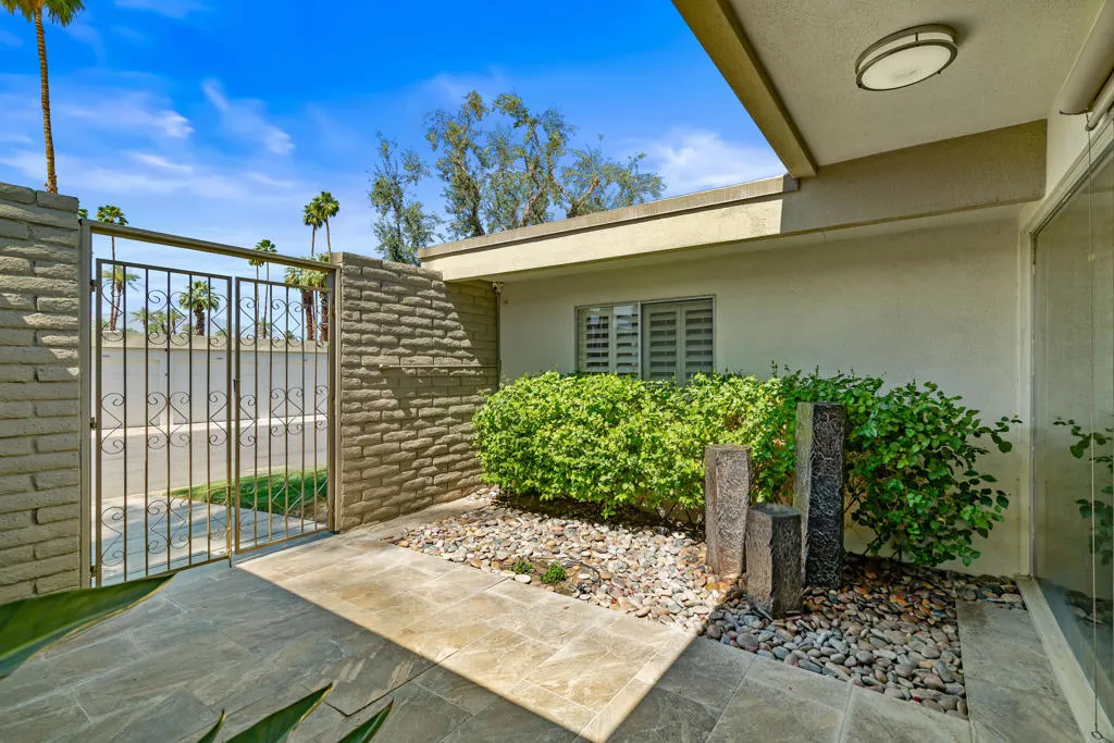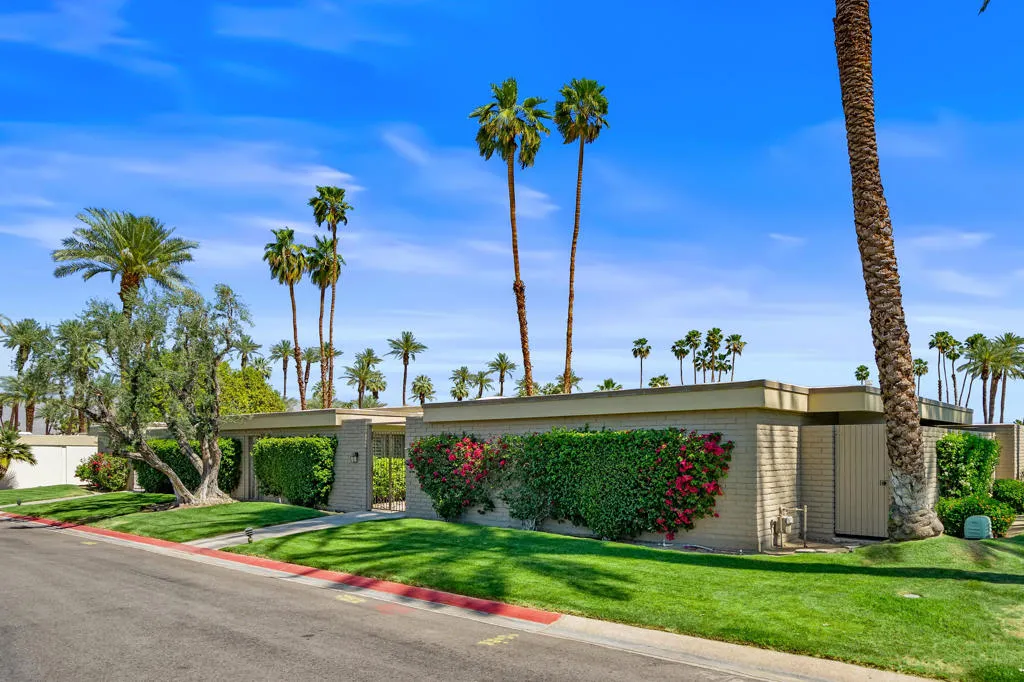 QUINTESSENTIAL MODERN ELEGANCE and UPSCALE DESERT LIVING! Perfectly appointed, this 4 bedroom, 3 bathroom home is located in the highly coveted gated community of Casa Dorado in Indian Wells. Embrace this rare offering in a prime location capturing sweeping greenbelts, water features, pool, golf AND mountain views, front and back. Truly exceeding expectations! Showcasing the signature architectural lines of mid century modern design in Casa Dorado, this home features floor to ceiling windows, an open floor plan and abundant natural light, seamlessly connecting indoor living to the serene Desert landscape. Porcelain tile flows from the oversized front courtyard into the main living areas and onto the extended back patio inviting the indoor/outdoor lifestyle. The Chef's kitchen is a culinary dream, boasting new appliances, gas stove with double sided hood, 2 ovens, microwave, built in wine rack , wine cooler, complemented by custom cabinetry and soft up-lighting! A nearby wet bar offers a great gathering spot, making entertaining a breeze! The primary suite is a wonderful retreat providing soft plush carpet, customized tile shower and and soaking tub, high end plumbing and fixtures, a walk in closet with built in dresser and pocket door for privacy. 3 additional bedrooms are generously sized and are adjacent to 2 additional modernized full bathrooms providing privacy and comfort for family and friends. Additional features include reflective window film for energy efficiency, a newer HVAC system, and an upgraded electrical panel fully equipped to support solar power. abundant storage inside and out. A huge bonus is the attached golf cart garage and the detached two car garage just steps away! Enjoy a VIBRANT, yet PEACEFUL lifestyle in Casa Dorado with lush greenbelts, mature palms, scenic walking paths, multiple pools and spas, tennis, pickleball and a par 3, four hole, pitch 'n putt golf course. Love life in Indian Wells with discounts to the Resort Course at the Hyatt, preferred access to The Tennis Tournament, discounts for dining, local events, spas and more! RICH, WARM, TIMELESSLY ELEGANT and ABUNDANT VIEWS FRONT and BACK! Who says you can't have it ALL?