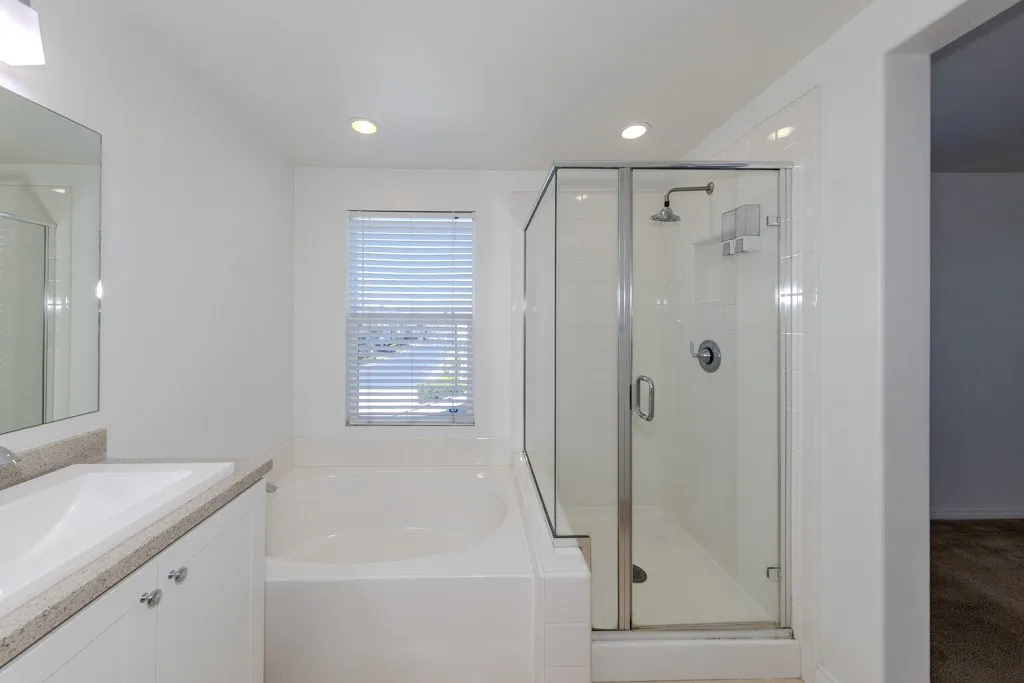 Welcome to this beautifully maintained two-story home offering 4-Bedroom, 3-Bath, 1,609 sq.ft of living space in the desirable Liberty Walk community of Fullerton. Enter through a charming gated front patio that provides a cozy and private outdoor space. The main level features a convenient bedroom and a three-quarter bathroom with granite countertops, ideal for guests. The spacious living and dining areas offer abundant natural light and sliding glass doors that open to the private patio, perfect for relaxing or entertaining. The kitchen features granite countertops, a modern tile backsplash, stainless steel appliances, and recessed lighting. Laminate wood flooring runs throughout the main level. Upstairs, the oversized primary suite includes dual vanities with granite countertops, an oversized soaking tub, a separate shower, and a walk-in closet. Two additional bedrooms share a hall bathroom with granite counters. Additional highlights include solar panels to help lower energy costs, an EV charger in the garage, a first-floor laundry room, and a two-car attached garage with direct access. All utilities are to be paid by the tenant. This desirable corner-lot home is a must-see in the Liberty Walk community.