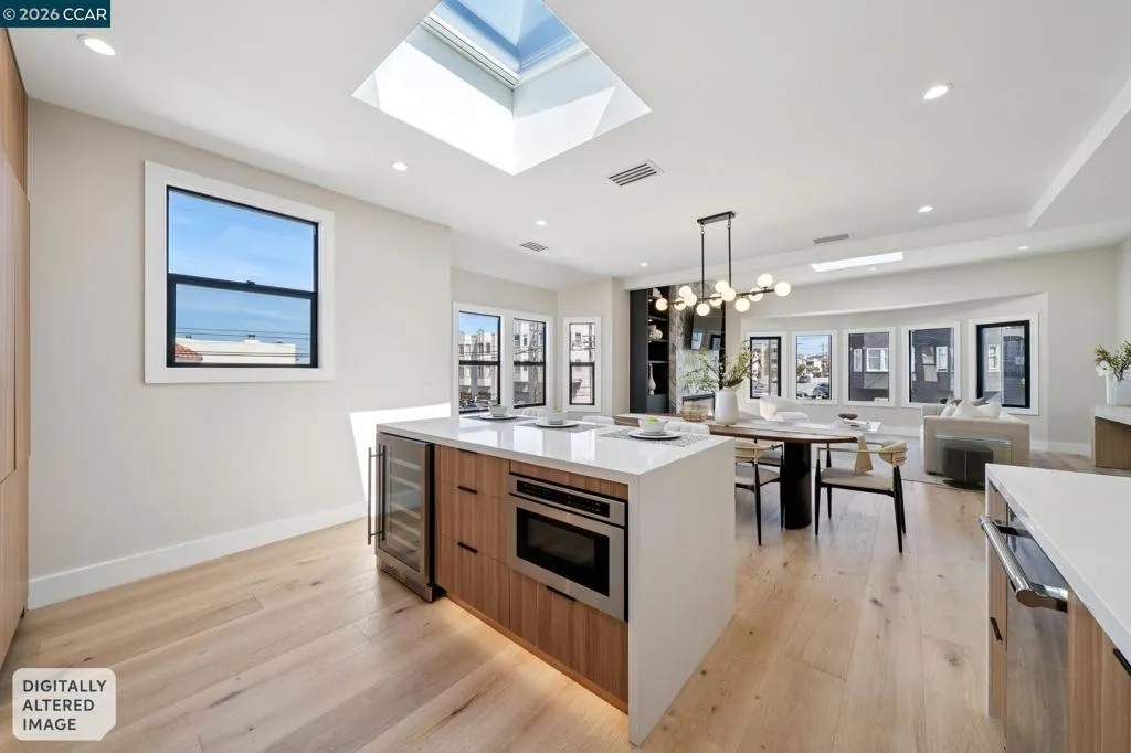 Meticulously reimagined from the studs up, this exceptional Sunset District residence blends modern luxury with refined craftsmanship throughout. Rebuilt with all new electrical, plumbing, and HVAC including air conditioning, the home features a flawless Level 5 smooth wall finish and wide plank white oak engineered hardwood flooring. Soaring ceilings and newly added skylights flood the open concept living, dining, and kitchen areas with natural light, creating an inviting and elevated atmosphere. The designer culinary hub showcases walnut European style cabinetry, quartz countertops with a waterfall island, and premium appliances including a Thermador range and dishwasher, Bosch refrigerator, two zone wine refrigerator, and a microwave drawer. Upstairs, the skylit primary suite and additional en suite offer spa inspired baths with curbless showers, heated floors, heated towel racks, Toto bidets, and Hansgrohe fixtures. A striking glass enclosed staircase with LED lighting leads to the lower level featuring two additional en suites, a wet bar, and a spacious second living area. Bifold doors open to a low maintenance backyard with artificial turf and a pergola, creating seamless indoor outdoor living. A rare offering in one of San Francisco’s most coveted coastal enclaves.