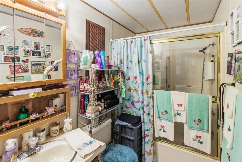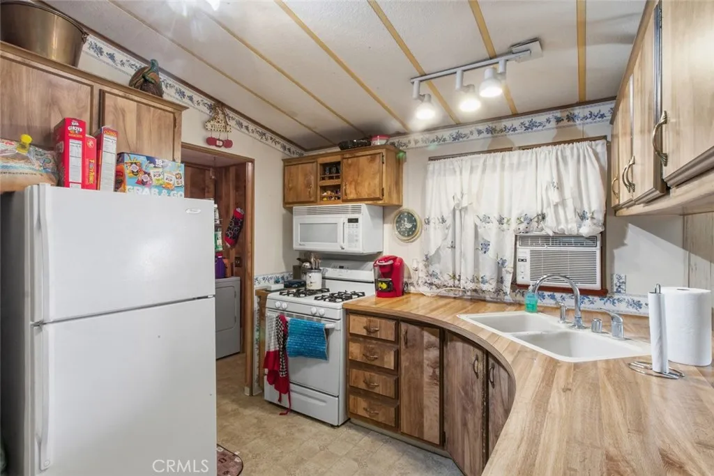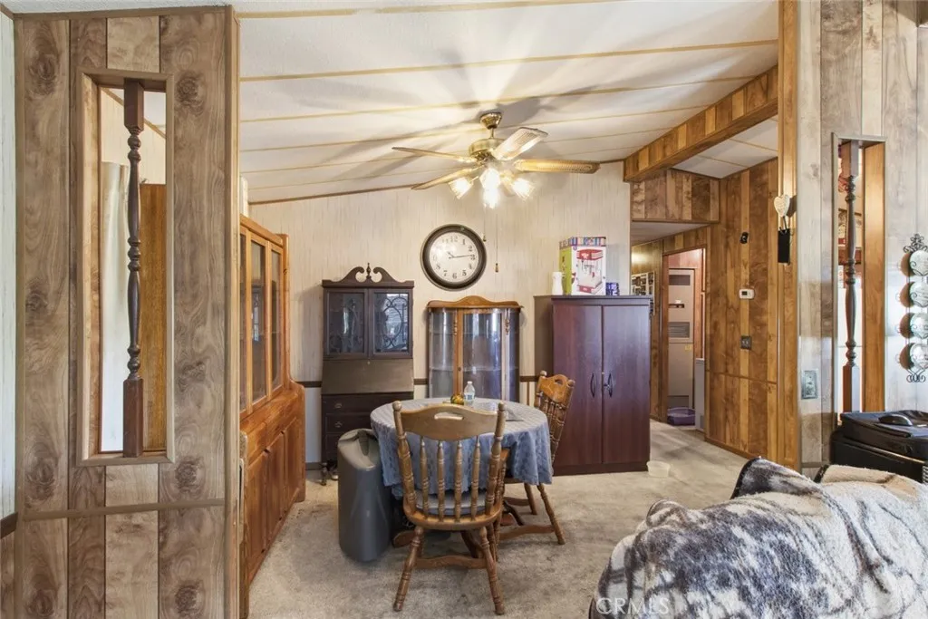 Step into comfort and charm with this wonderful 2-bedroom, 2-bath manufactured home offering approximately 1,056 square feet of inviting and functional living space. Thoughtfully designed with a warm, welcoming feel, this home is perfect for those seeking both comfort and practicality in a peaceful setting. Inside, the spacious living room greets you with vaulted ceilings, exposed beam style accents, and an abundance of natural light pouring through large windows. A stunning freestanding fireplace serves as a cozy focal point, creating the perfect space for relaxing evenings or entertaining guests. The open-concept layout seamlessly connects to the kitchen, dining area, and living room, enhancing the home's airy and connected feel. The kitchen offers a functional U-shaped design with linoleum flooring, rich wood-style cabinetry, and ample counter space for meal preparation. A free-standing stove and oven, overhead microwave, and window over the sink provide both convenience and natural light. Adjacent to the kitchen, the dining area offers plenty of space for gatherings and everyday meals. Both bedrooms are generously sized with soft carpeted flooring and a comfortable, restful atmosphere. The primary bedroom features enough space for a dedicated makeup station, and has a spacious walk-in closet, adding both convenience and privacy. Each bathroom includes a shower-over-tub combination, a well-lit vanity space, and practical layouts designed for ease of use. A separate laundry room with washer and dryer hookups and additional cabinetry adds everyday functionality and extra storage. Step outside to enjoy the covered front deck, perfect for morning coffee or unwinding in the evening. The covered carport provides convenient, protected parking, while the backyard offers a relaxing and easy-to-maintain outdoor retreat. Enjoy lush green grass, a designated garden area ideal for planting, and wooden fencing that adds both privacy and charm. A matching storage shed provides additional space for tools, hobbies, or seasonal items. Blending comfort, character, and outdoor enjoyment, this home presents a wonderful opportunity to enjoy relaxed living in a well-maintained and welcoming community. Don't miss your chance to make this inviting property your own! Welcome Home!!!