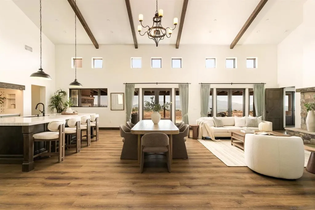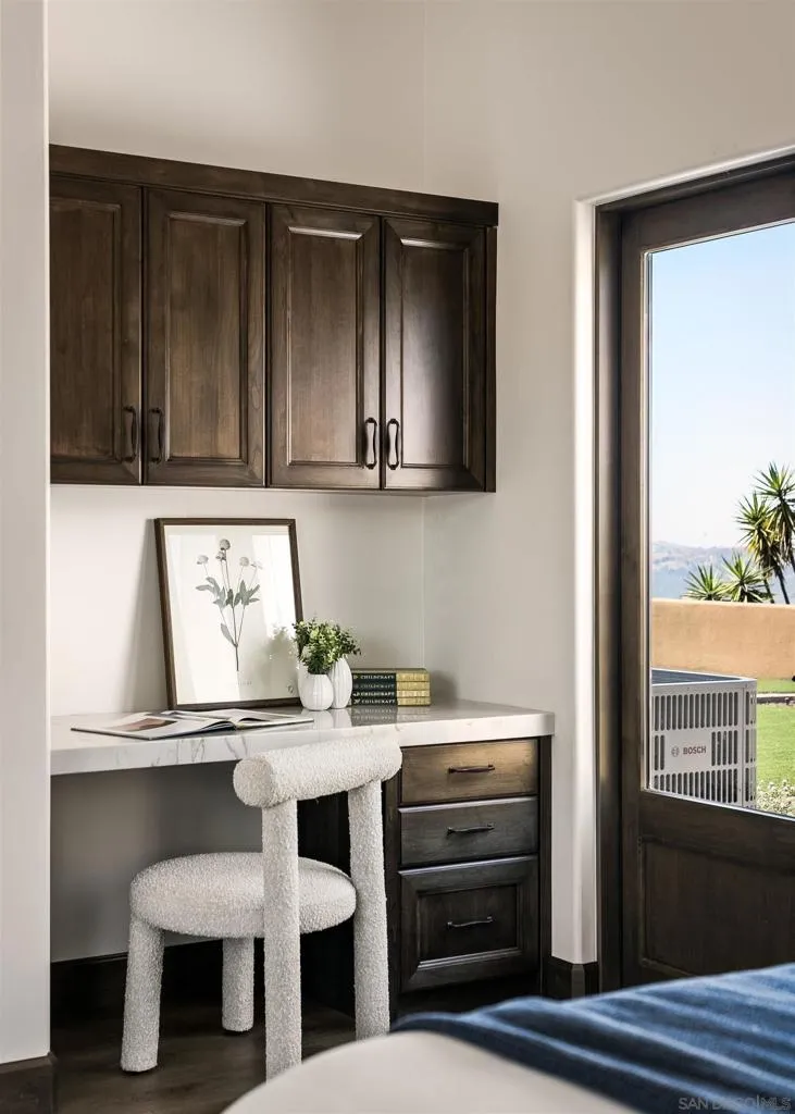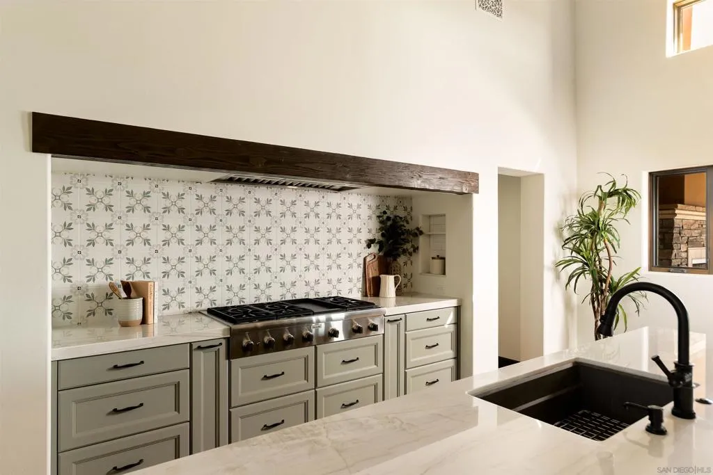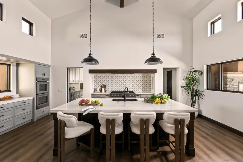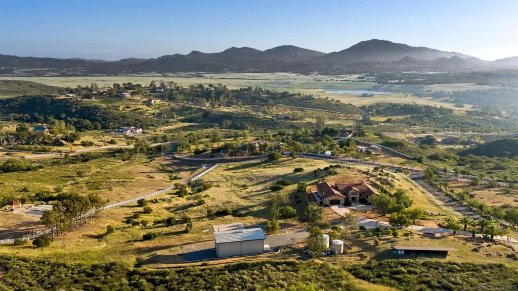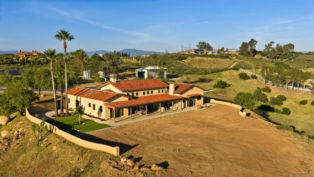 Perched atop a commanding hill within the prestigious gated enclave of Highland Hills, this exceptional new construction residence a single-level Tuscan estate is a rare fusion of old-world artistry and cutting-edge modern engineering, crafted for those who demand both beauty and resilience. Set across 9 fully fenced acres, the property delivers unrivaled privacy, panoramic vistas, and a level of craftsmanship seldom seen in today’s luxury market. Designed by internationally renowned Hubbell & Hubbell Architects, with innovative design work and artistic detailing utilizing ICCF concrete and reinforced steel construction, this certified Green Building offers exceptional structural integrity, innovative products and energy efficiency. Inside, the home unfolds with soaring cathedral ceilings accented by hand-scraped exposed wood beams, creating a grand architectural presence, along with custom wood cabinetry, a dedicated mudroom, and a laundry area with tongue-and-groove wood ceilings, plus an epoxy-finished oversized 2-car garage. Natural light pours through multiple skylights, five sets of full-lite French doors, and stacked windows, seamlessly blending indoor and outdoor living while framing surrounding hillside vistas from nearly every room. Designed for both intimate living and elevated entertaining, the residence showcases vaulted ceilings throughout and two gas fireplaces including a striking indoor focal point and a second outdoor fireplace anchoring a covered patio retreat. Custom imported tilework from European Tile Art adorns the kitchen and baths, creating a rich, textural experience throughout. Step into a resort-inspired primary en-suite retreat with soaring ceilings, a walk-in closet with custom built-ins, and a private patio. Impeccably designed, it features dual vanities, finely crafted custom cabinetry, and statement designer tile, centered around a stunning frameless glass walk-in shower. Throughout the home, statement lighting fixtures include handcrafted wrought-iron chandeliers and exterior lanterns with hand-painted finishes, bespoke glass work, and a breathtaking central chandelier crowned with custom-cut amber stone. The heart of the home is a chef’s kitchen designed to impress, featuring exquisite Italian quartzite slabs and a large center island with seating and additional storage, seamlessly paired with custom cabinetry showcasing European soft-close systems, integrated knife blocks, and detailed craftsmanship throughout. High-end Phylrich and Brizo smart-touch fixtures, along with a full suite of the latest Thermador Wi-Fi enabled appliances, deliver effortless control at your fingertips. Designed for sustainability and efficiency, the estate is powered by 55 fully paid solar panels complemented by two Tesla backup batteries. Three EV charging ports at both the home and barn, along with a new 400-amp electrical system, supporting the main residence, barn, and future expansion with ease, ensuring energy independence. Additionally, two 10,000 gallon stainless steel water storage tanks with a new multi-speed pump and connections, along with a high-producing private well, provide a reliable and sustainable water source for both the residence and irrigation needs. Additional features include custom-crafted side gates, a dedicated enclosed trash area, dual Bosch high-capacity HVAC systems with smart controls, two tankless water heaters, LG ultra-large smart washer and dryer, and whole-property Starlink connectivity with expanded Wi-Fi coverage. Beyond the main residence, the property includes a separate RV pad with full hookups and a newly constructed detached 1,250 sq ft Empire metal barn/workshop, featuring a 14’ RV entry door, an 11’ roll-up side access door, a climate-controlled office with heat pump, water connections, and more. This is more than a home, it is a legacy estate. A private Tuscan sanctuary where craftsmanship, innovation, and natural beauty converge at the highest level in Ramona. Eve...