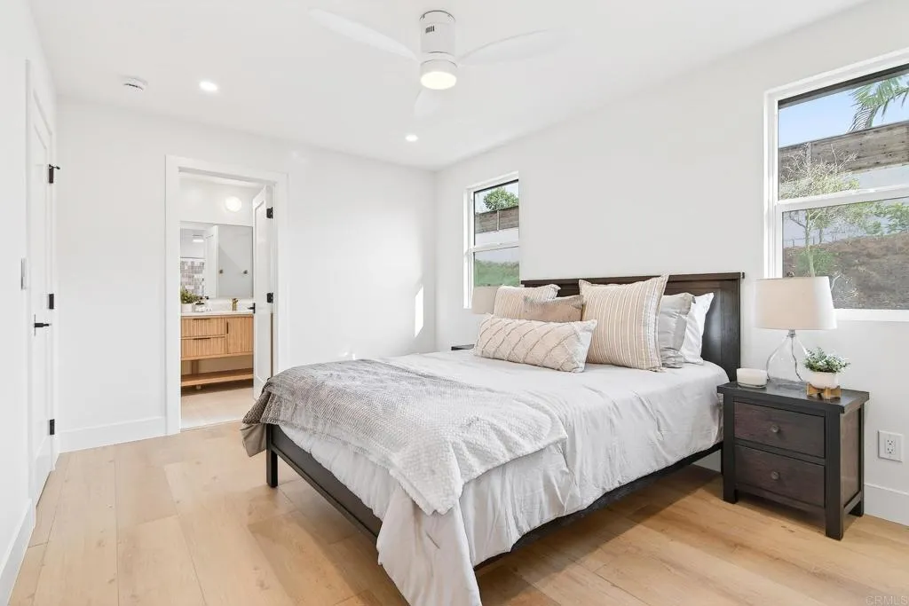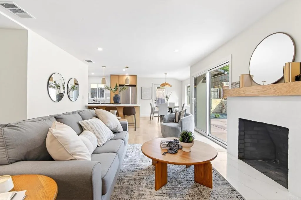 Welcome to 733 Cathy Ln, a beautifully reimagined single-story home in the heart of Cardiff-by-the-Sea. This fully remodeled 3-bedroom, 2-bath home strikes a perfect balance of coastal charm and modern comfort. A natural wood picket fence frames the fully enclosed front yard, while black-framed windows and fresh landscaping set the tone from the curb. Step inside to a cozy foyer with alcove shelving, where warm white oak-toned plank flooring and an open-concept layout set the tone. The living area features a fireplace with a wood mantel and flows naturally into the dining space and kitchen. Your modern galley kitchen features white oak cabinets paired with quartz countertops, floating wood shelves, and gold accents. A 5-burner gas range, counter-depth refrigerator, and wine cooler round out the kitchen. Seamlessly connected to your kitchen, a dedicated laundry room with a service sink and side yard access adds everyday convenience. Your primary suite features a walk-in closet and spa-inspired ensuite with a reeded dual sink vanity, frameless glass shower, and warm sand tile. The second bath offers its own character with matte checkerboard tile, a shiplap accent wall, floating vanity, and bronze accents. The interior flows seamlessly to a landscaped backyard and patio with outdoor fireplace, perfect for relaxed evenings or hosting friends. A new roof, new HVAC, updated electrical panel, and new windows round out this thoughtfully updated home. All of this in one of San Diego's most beloved coastal communities, minutes from the sand, top-rated schools, Encinitas Community Park, Seaside Market, and Cardiff Town Center. Schedule your showing today!