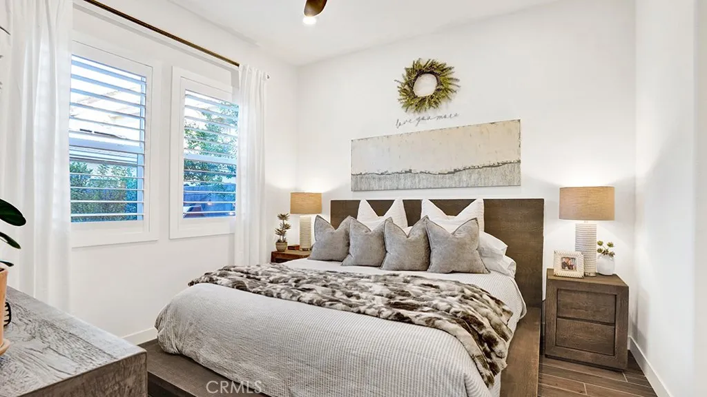 833 Sunrise Road is a single story condo that lives like an SFR in the 55+ age restricted community of Haven within Gavilan of Rancho Mission Viejo. Built in 2023, this home is tastefully upgraded with high end finishes throughout. Showcasing approximately 1,112 sqft with two bedrooms, two bathrooms, fully paid for solar, central AC, a tankless water heater, dual pane windows, a large backyard with beautiful mature landscaping and a two car direct access garage with custom epoxy flooring and overhead storage as well as built in storage cabinetry. As soon as you walk into your new home, you'll notice the porcelain tile wood style flooring throughout as well as solid wood plantation shutters, which were both builder upgrades. Your chef's kitchen has white shaker cabinetry with soft close hinges, quartz countertops, modern subway tile backsplash, stainless steel appliances and a large kitchen island with an oversized sink. The living room has a ceiling fan and plenty of windows that overlook the side yard. The dining room is very spacious and has access to the backyard via a sliding glass door that has custom vertical blinds. The primary bedroom has a ceiling fan and an ensuite bathroom with dual sinks, quartz countertops, a walk in glass shower and a spacious walk in closet. The guest bedroom also has a ceiling fan and a closet. The guest bathroom is in the hallway by the guest bedroom and features a quartz vanity with a tiled shower tub combo. The laundry area has side by side appliances with additional cabinetry nearby. Your gorgeous backyard has a custom built in gas fireplace, mature landscaping with custom landscaping lights around the entire perimeter and pavers throughout for easy maintenance. The front yard also has mature landscaping with custom landscaping lights. Enjoy all of Rancho Mission Viejo's HOA amenities including multiple pools, spas, gyms, parks, sport courts, playgrounds as well as the 55+ exclusive amenities. Haven has their own saltwater pool, spa and entertainment complex just down the street. All 55+ residents will also have access to the future clubhouse and pool being built in the Gavilan Ridge opening later this year.