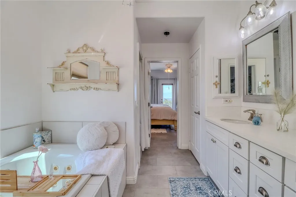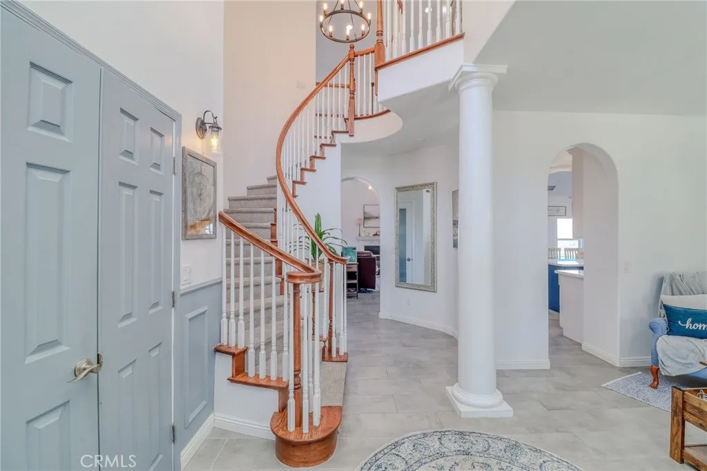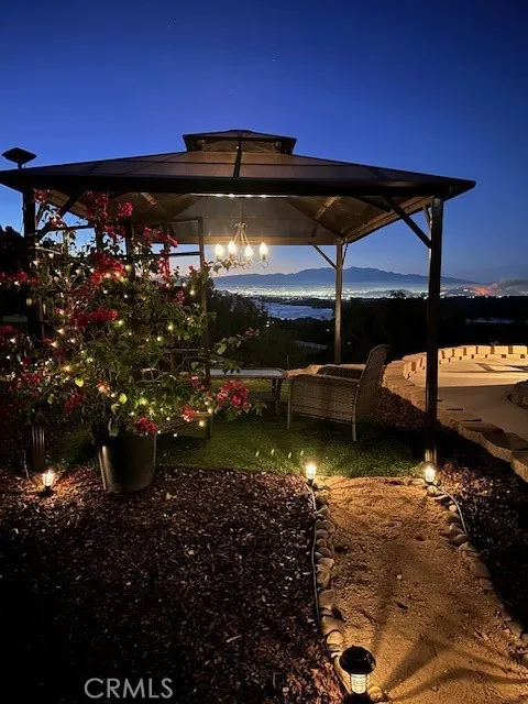 Welcome to Lake Mathews Estate. Picturesque home of timeless beauty, elegance, and tranquility, with spectacular views of the Lake, mountains, and city lights. Leave the world behind, enter your Private Gate, and drive down your tree-lined driveway. Your home offers endless possibilities with 6 bedrooms and 3.5 bathrooms, accommodating multigenerational families gathering and entertaining spaces, while enjoying spectacular views. Also, the 2.5 acres of the property has a flat pad approximately 250'x50' overlooking the views A home of high-quality design and architectural details, such as high-end flooring and crown moulding. quality cabinetry, quartz countertops. The careful layout showcases the gorgeous views throughout, surrounded by windows that illuminate each room with natural light. You are greeted by an elegant porch that opens to a grand entrance, soaring ceiling with celestial windows, and a striking winding staircase. Near the entrance is a conveniently located Office/Flex/bedroom offering its own private outdoor entry. Adjacent to the grand entry is a separate cozy family room. Large open floor plan with cathedral ceilings consisting of your Living, dining, and kitchen, with wrap-around windows. The designer kitchen is thoughtfully laid out. Two pantries, one being a large walk-in, an extra-large island with ample storage, seating, and quartz countertops. Quality cabinetry offers ample storage and a custom hood over the stove with a pot filler. There is ample counter space, a farm sink, a coffee bar, and a separate wine bar with a wine chiller. The kitchen opens to a massive dining room, perfect for your family and those special occasions and holidays. Room for a breakfast nook and seating area. Expand your dining and gathering to the Lanai, with seating, dining, and a private bar. The Living room has a warm fireplace. The luxurious primary suite is on the first floor. A retreat to wake up to the exquisite views. Large spa-like Jacuzzi tub, custom walk-in closet, and private outdoor patio. The upper level consists of a junior on suite, a bed/flex room, and two other bedrooms, each with its own personal sink and storage, sharing a spacious bath. A special feature includes a convenient upstairs second laundry area! The home also included a first-floor indoor laundry and a spacious three-car garage. The outdoors has a park-like gazebo area perfect for enjoying the top-of-the-world views!
