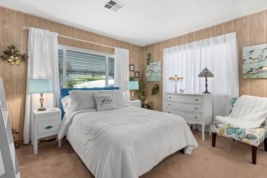 Updated VIEW Home with NO Property Taxes in Premier 55+ Resort Community! Enjoy elevated living in this beautifully maintained home located in a rent-controlled, resort-style community—plus the added benefit of HCD registration in lieu of traditional property taxes. This inviting residence features a desirable split-bedroom floor plan, offering privacy between the spacious primary suite and two guest bedrooms. The primary suite includes a walk-in closet for added comfort and convenience. Recent upgrades include a new stove, furnace, and thermostat, while many windows have been updated to vinyl dual pane for improved efficiency and natural light. Step outside to a low-maintenance yard with turf in the backyard and a drip irrigation system—perfect for easy outdoor enjoyment. Located in the highly sought-after Rancho Vallecitos community, residents enjoy access to exceptional amenities including a clubhouse, pool & spa, fitness center, library, billiards room, game and craft rooms, putting green, dog park, and more. A vibrant social calendar and scenic surroundings complete the resort lifestyle. Space rent is $740 and subject to city rent control.
