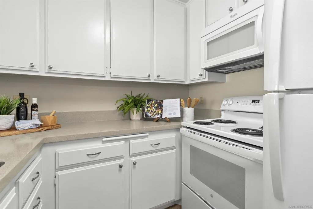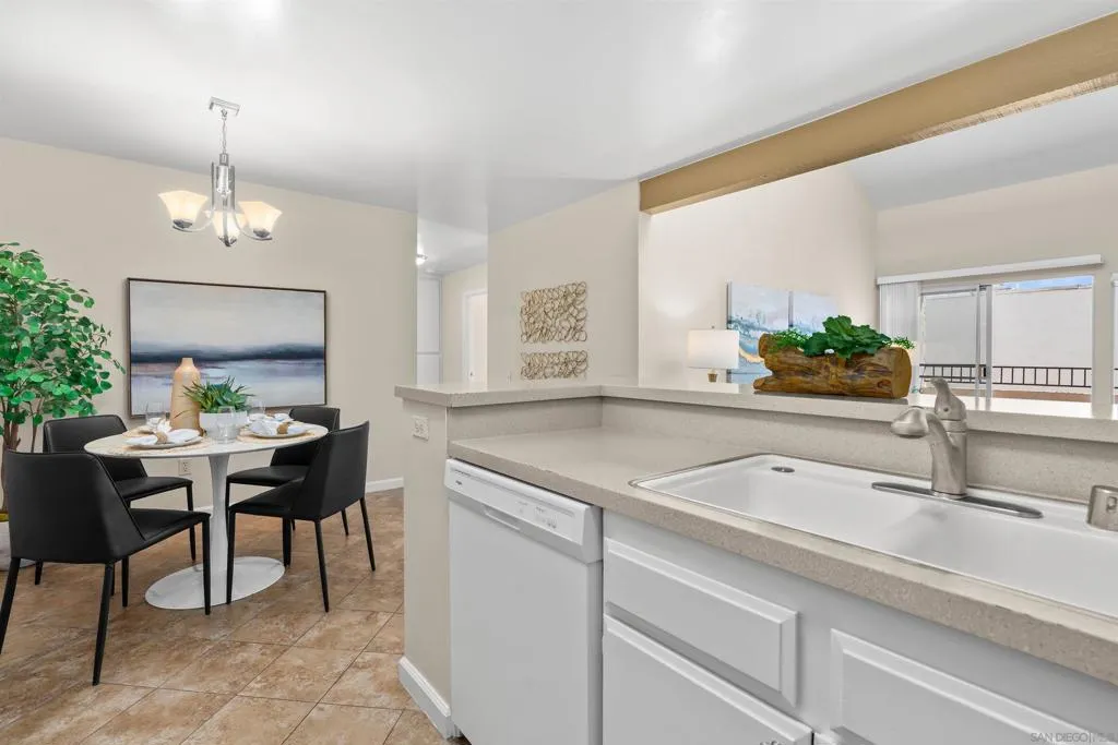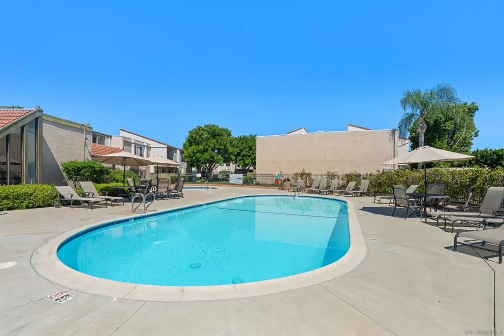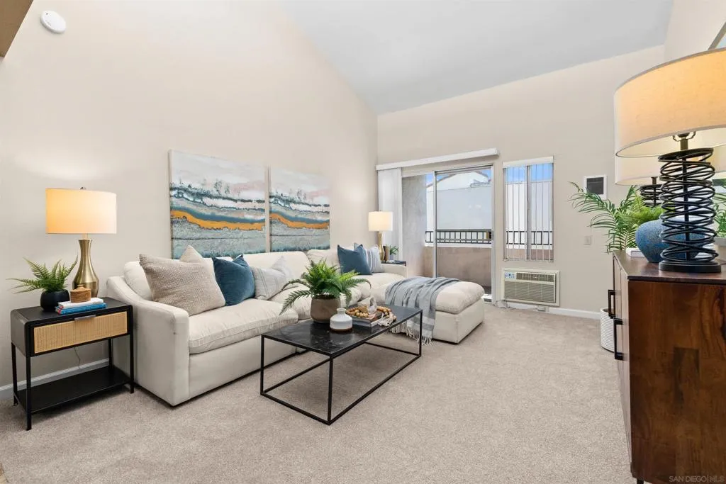 Tons of natural light stram into this terrific top floor Serra Mesa condo. The unit features vaulted ceilings in the living room, tons of storage w/ 3 interior hall closets & a 4th on the balcony, a spacious master bedroom w/ a huge closet & a nice wall AC unit for those warm Summer days. Among the many upgrades are fresh paint, new carpet, newer glass shower doors & updated light fixtures. The kitchen features an open concept & solid surface counter tops. There's even two assigned parking spots! Please see supplement for more. Welcome home! The complex amenities include a wonderful pool area complete with spa and kiddie pool, a rec room w/ a pool & ping pong table, BBQ area & a large fenced in dog run.