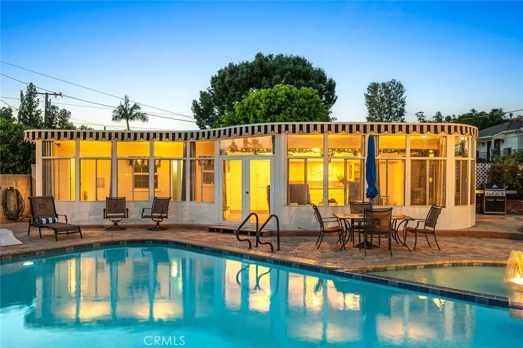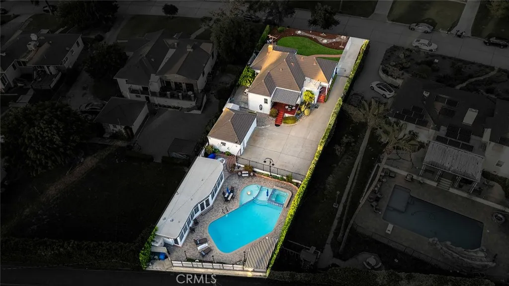 Cherished by the same family for 34 years, this stunning three-bedroom, two-bath residence sits on one of Whittier's most coveted tree-lined streets — Cadbury Road — where neighbors stay for decades and homes rarely come available. At 1,723 square feet on a lot exceeding 10,000 square feet, this is a property that has been genuinely lived in, celebrated in, and loved. Built in 1940 with fully insulated walls that keep the interior naturally cool and quiet year-round, every window has been replaced and custom blackout shades fitted to each room. The formal living room is anchored by a fireplace with marble surround, flanked by custom built-in bookshelves and a sweeping bay window with built-in seating. The kitchen delivers custom cream cabinetry against polished black granite countertops, and the dining room features elegant wainscoting and built-in glass display shelving. The resort-style backyard is where this property truly sets itself apart. The custom pool features an integrated wading pool with a kids' fountain, and a 12-man spa — all surrounded by mature privacy hedging, and an upper entertaining patio shaded by a black and white striped awning with a cast iron bistro set overlooking the pool below. Handcrafted French Quarter iron lamp posts and bougainvillea in full bloom complete a backyard that functions like a private venue. Outdoor furniture included. The crown jewel is the French Quarter-inspired pool house: a fully appointed pavilion with its own kitchenette, full bathroom, additional shower, and dedicated changing room. Sunbrella furnishings convert to a queen-size sleeping arrangement — a true guest suite and entertainment destination in one. The detached oversized two-car garage offers generous workspace, ideal for hobbies, projects, a home workshop or a potential ADU. Located Five minutes from freeway access. Ten minutes to Uptown Whittier, on a street where people put down roots. Homes like this — with this history, this lot, and this backyard — do not come available often. This one is ready for its next chapter.