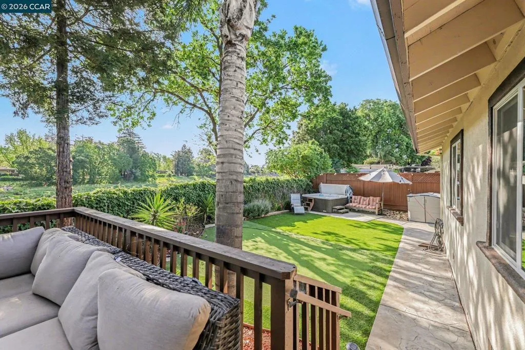 Rare find! Nestled at the end of a private driveway, this single story home offers privacy, backing to open space and Iron Horse Trail. 3 beds/ 2 baths plus garage converted to in-law quarters with 1 bed, 1 bath, living area, kitchen, and laundry/storage room. Main house has living room with vaulted ceiling and stylish tile flooring. Nice kitchen with center island with breakfast bar plus 2nd breakfast bar, granite counters plus stylish tile backsplash, stainless appliances including 5-burner gas cooktop and built-in microwave. Primary bedroom with walk-in closet, remodeled bath with free standing bubble tub, rain shower and bidet OVE Toilet, newer vanity and sink, smart fan, porcelain tile surround shower, vinyl flooring. Updated hall bathroom with travertine surround shower. Luxury vinyl plank flooring in bedrooms. Upgraded crown molding, baseboards and shutters. Large inside laundry room with sink, cabinets and counter space. Two car carport added in 2021. Freshly painted exterior including decks. Yards are great for entertaining with large deck, bocce court and patio with trellis in the front, putting green, hot tub and 2nd large deck in the rear. Property backs to open space and Iron Horse Trail. Conveniently located to shopping, parks, Highways 242 and 680.