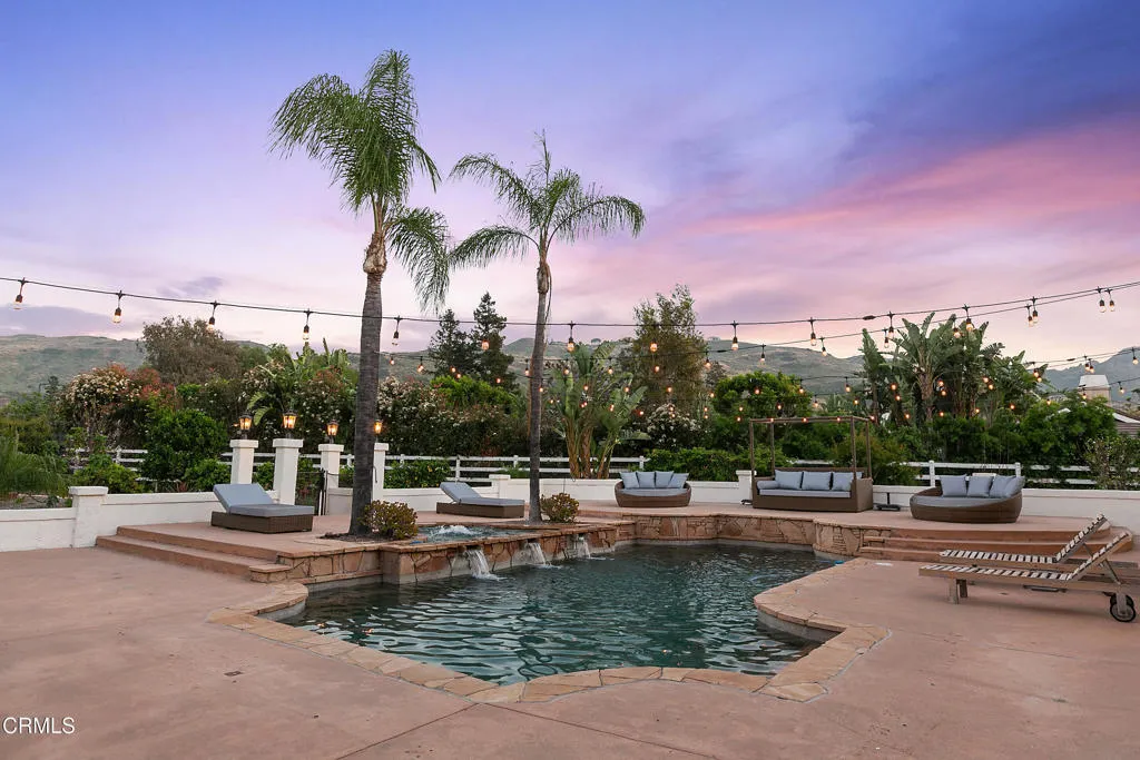 Prestigious Gated Estate on Over an Acre in Wildwood Ranch Nearly 4,800 Sq Ft of Luxury Living. Exceptional value for this stunning custom estate located in the highly sought-after gated community of Wildwood Ranch. Set on over an acre of beautifully curated, usable grounds, this nearly 4,800 sq ft residence offers the perfect blend of elegance, comfort, and resort-style living. A grand two-story entry with dramatic dual sweeping staircases creates a striking first impression, opening to spacious formal living and dining rooms. The home features new carpeting, solid wood doors throughout, and thoughtfully designed interiors ideal for both everyday living and entertaining. The gourmet granite kitchen is equipped with top-of-the-line Wolf appliances, Sub-Zero Pro 48 refrigerator, Miele built-in coffee-espresso maker, huge custom walk-in pantry and a separate breakfast area - , seamlessly connecting the kitchen to the inviting family room complete with fireplace. The luxurious primary suite is a true retreat, featuring a private balcony overlooking the park-like grounds, an adjoining office, and a spa-inspired bath with steam shower. Step outside to a spectacular entertainer's backyard--gated, private, and designed for year-round enjoyment--with a sparkling pool and spa, fountains, fire pit, and built-in BBQ. A charming freestanding arbor and multiple lounging areas create an ideal setting for gatherings. Beyond the main yard, enjoy expansive grassy areas, a sport court, and a large gated side yard perfect for pets. The property is horse-zoned and located just moments from scenic hiking and equestrian trails.A rare highlight of this estate is the incredible, fully irrigated, orchard and garden featuring an abundance of mature fruit trees including pomegranate, peach, apple, fig, persimmon, pear, Meyer lemon, multiple orange varieties, lime, cherry, avocado, and flourishing blackberry and passion fruit vines. Raised garden beds produce herbs and vegetables year-round--truly a farm-to-table lifestyle right at home. The added advantage of reduced AG water rates for landscape. A charming chicken coop completes the experience.Additional features include: Solar system with battery backup Two Level 2 (19.2 kW) EV chargers, including bidirectional capability Video surveillance system Three newer HVAC systems with updated ducting Epoxy-coated garage floors with hidden lift storageIdeally located just 45 minutes to Los Angeles, 15 minutes to the Camarillo