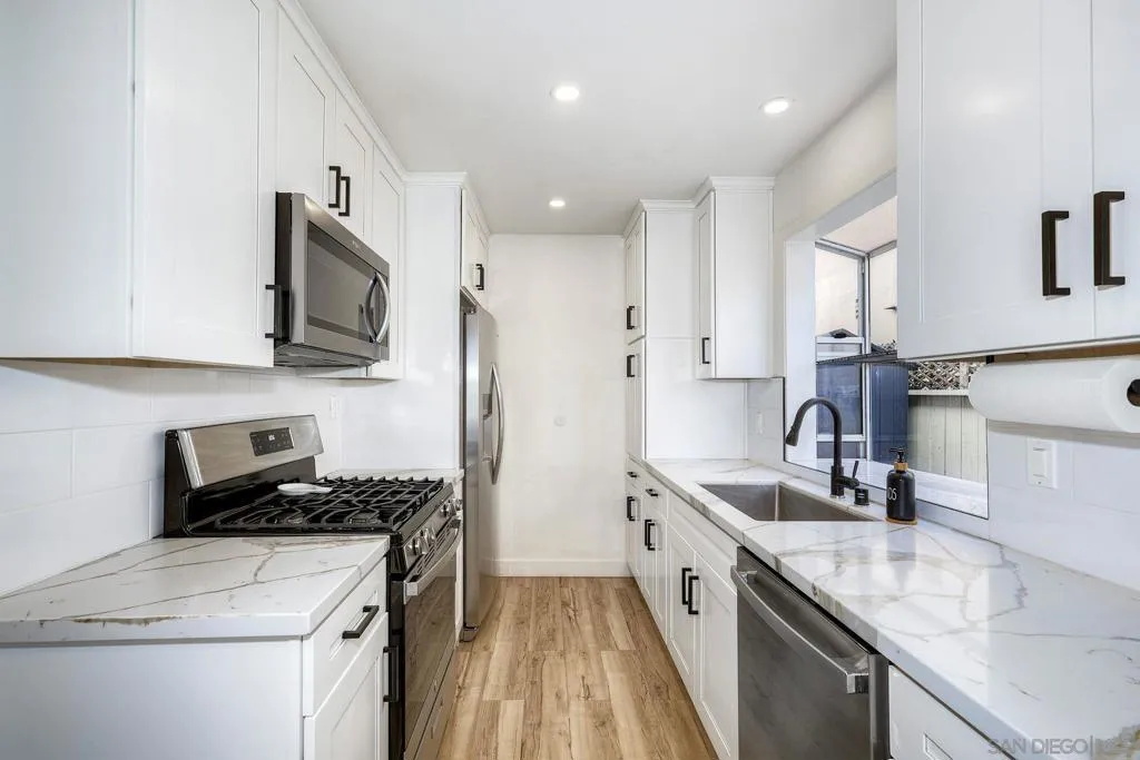 Spacious, light and bright this remodeled corner unit checks all the boxes. With almost 900 sf of coastal living area, two patios and covered parking you'll be ready to entertain in time for summer. Kitchen features an oversized breakfast bar, quartz counters, custom tile backsplash, stainless steel appliances, garden window and stylish black touch points. Living room and dining area blend seamlessly together to provide an open concept feel with a tile faced fireplace serving as the focal point. Wonderful western exposure provides loads of natural light. Bathroom w/ custom tile surround, new counters and new base cabinet. Extensively renovated less than 4 years ago with vinyl flooring and recessed lights throughout. Custom closet organizers and an abundance of storage closets for all your beach toys. Covered parking space #P78 is right out front. Prime location near Ocean Beach, Barons Market and Barnes Tennis Center(pickleball anyone?). The VA approved complex features numerous greenbelts, mature fruit trees, two pools, spa and a recreation room.