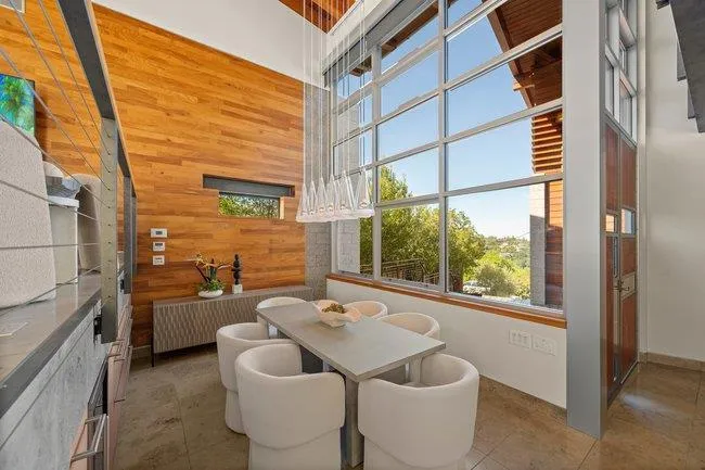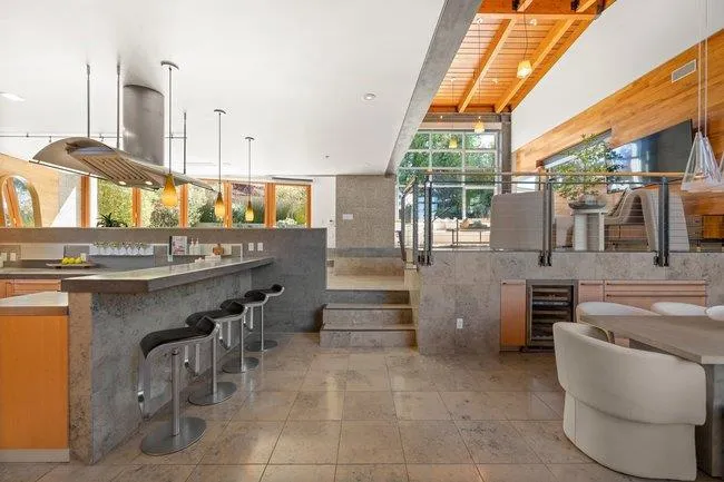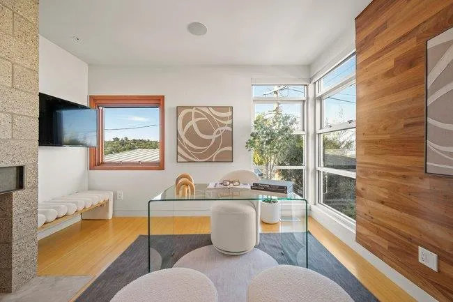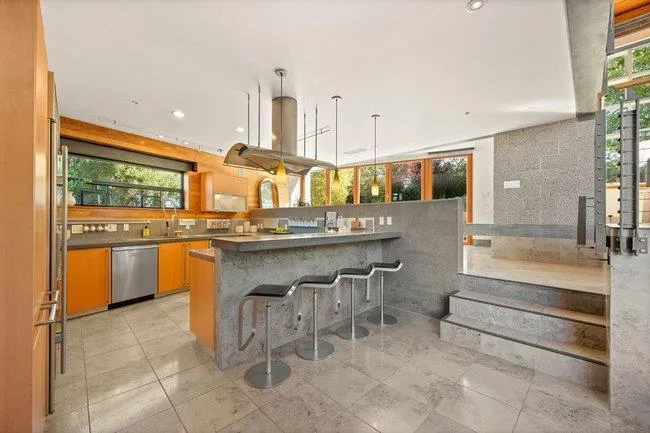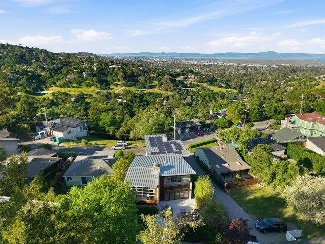 Striking contemporary architecture and San Francisco Bay views define this custom home built with sustainable features that include solar power, radiant floor heating, dual-zone climate control, and a thoughtfully designed sunroom that supports passive ventilation for year-round comfort. Distinctive materials include exposed Alaskan cedar beams, clear vertical grain cedar ceilings, Brazilian oak wall paneling, and floors of limestone and bamboo, complemented by Poggenpohl cabinetry and commercial-grade windows. Arranged over multiple levels with 4 spacious bedrooms, the home follows the natural contours of the site and has expansive glass, clerestory windows, and carefully framed outlooks to beautiful vistas all around. The level rear grounds with vast lawn, limestone terrace, and fire pit provide inviting spaces for outdoor living and entertaining. Built for design and performance, this is a truly distinctive home in a premier setting.