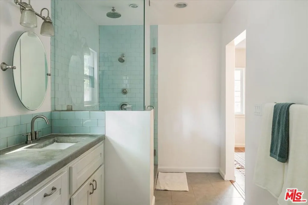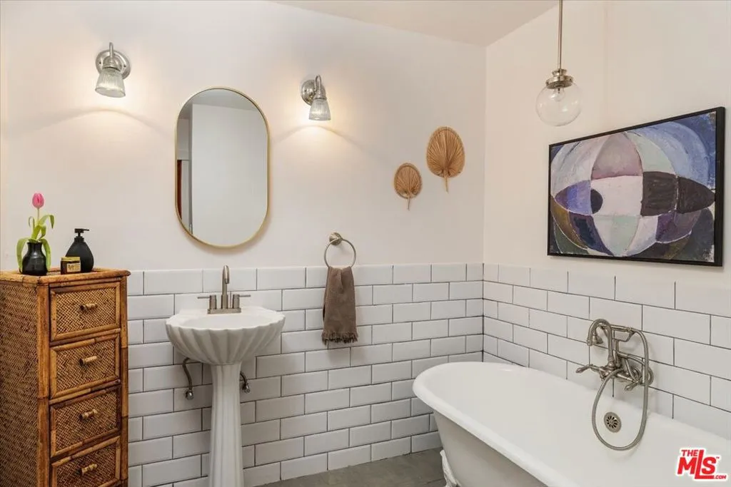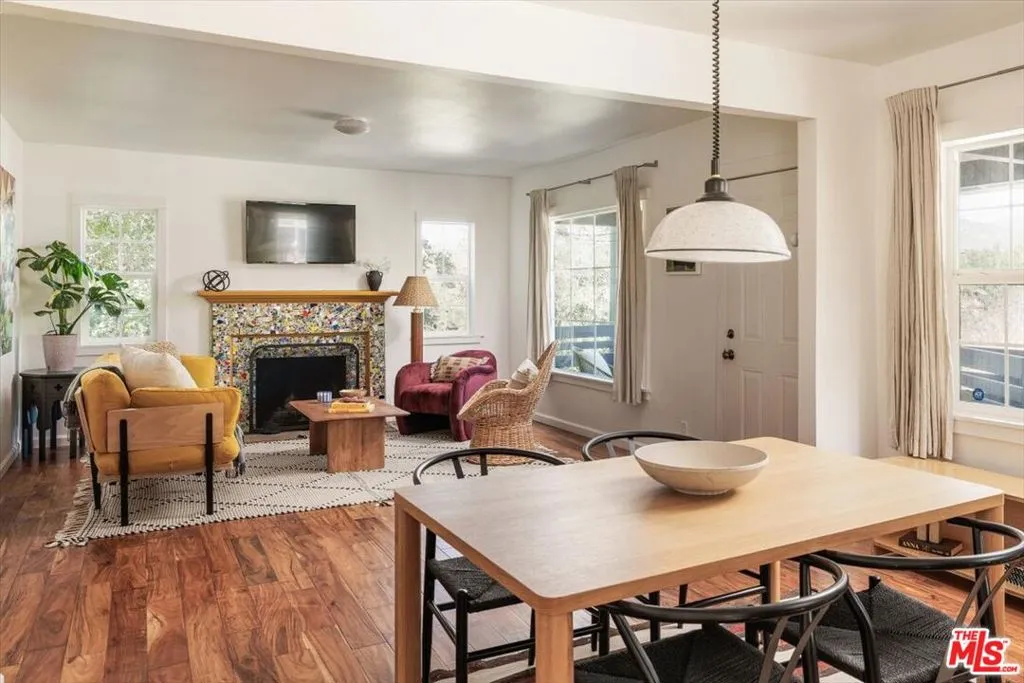 Perched above the street in a verdant pocket of Eagle Rock, and with a welcoming approach, this elevated bungalow offers warmth and personality. A wide staircase leads to an expansive front deck ideal for morning coffee or sunset lounging framed by mature landscaping and layered views. Light-filled and comfortable, the living room blends character with ease, anchored by a colorful mosaic-tiled fireplace as a delightful focal point. The dining area flows seamlessly into an open kitchen featuring concrete countertops, stainless steel appliances, and an artful tile backsplash a stylish yet highly functional heart of the home. The primary bedroom offers a luxe attached bath with dual vanities and a walk-in shower. A versatile and spacious second bedroom easily serves as an office and/or guest room. The hall bath includes a second shower and a classic clawfoot tub, blending vintage character with modern comfort.Beyond the home, a generously sized backyard unfolds as a rare and versatile canvas room to garden, entertain, create, or simply take in the views of the San Gabriel Mountains. A detached garage adds flexibility for parking, storage, or potential creative use. This charming home offers distinctive style, comfort, and a coveted Northeast LA lifestyle.