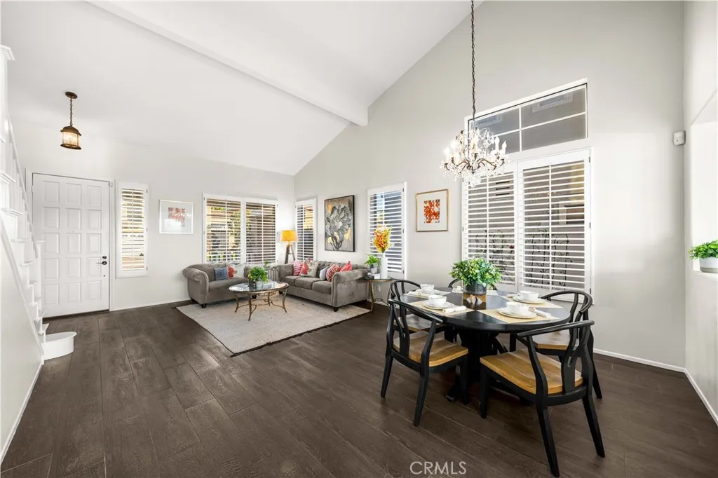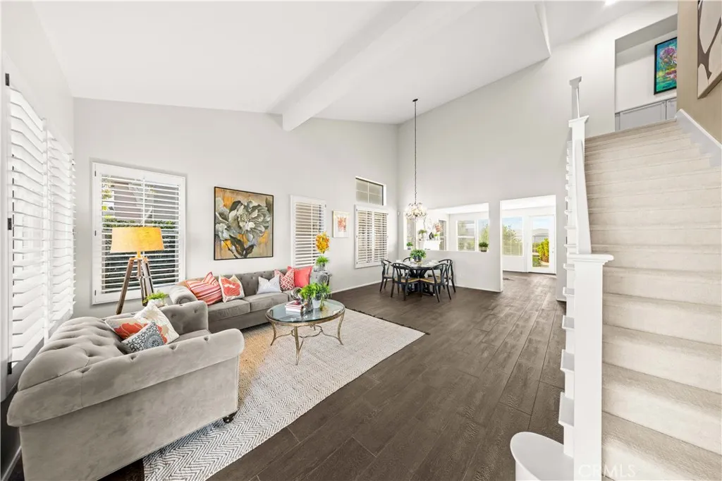 Welcome to 7 Hollyleaf in the Canyon Vistas community of Aliso Viejo. Recently updated with fresh paint and featuring wood-grain porcelain tile flooring throughout, this home offers a spacious, open floor plan. The entry opens into a formal living and dining area defined by two-story ceilings, a central chandelier, and plantation shutters. Toward the back of the home, the kitchen includes a center island with a raised bar, ample cabinetry, and a breakfast nook detailed with a ceiling fan. This space flows directly into the family room, which features a fireplace, LED recessed lighting, bay windows, and a glass door leading outside. A convenient main-floor bedroom and an adjacent full bathroom complete this level. Upstairs, the primary suite is situated to maximize the canyon and city light views. It features a walk-in closet and an en-suite bathroom with dual vanities, a separate oval soaking tub, a bidet, and a glass-enclosed shower. The suite also includes a large retreat area with dimmable recessed lighting, which can easily be converted into a fifth bedroom. The second floor is completed with the remaining two bedrooms, a generously sized secondary bathroom offering dual sinks and a tub/shower enclosed with glass doors and a dedicated laundry room. Transitioning outside, the backyard is thoughtfully designed to capture the property’s expansive canyon, sunset, and city light views, stretching as far as the Saddleback Mountains. The grounds feature low-maintenance xeriscape landscaping, mature citrus trees, and fragrant roses. A newly added second-floor patio deck provides an elevated vantage point to take in the scenery, while motion-sensor floodlights add convenience and security to both the backyard and driveway. Located within an award-winning school district, the home is walking distance to Canyon View Park's playground, sand volleyball courts, and hiking trails. It also provides easy access to Aliso Viejo Town Center, the 73 Toll Road, and Laguna Beach via Route 133.