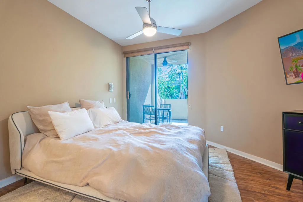 Nestled in one of the best locations within Biltmore, this upper-level 2-bedroom, 2-bath condo on fee land offers mountain views, privacy, and an exceptional Palm Springs lifestyle. The home features stainless steel appliances in the kitchen and a well-designed layout that blends comfort and functionality. The primary suite offers a spacious walk-in closet, an updated bathroom, and access to a private balcony--an ideal setting for morning coffee or quiet evenings outdoors. Positioned opposite the primary, the guest bedroom is perfect for visitors and features mountain views along with its own generous walk-in closet. A separate nook provides flexible space for a home office or creative use, while the in-unit laundry room and direct-access 2-car garage add everyday convenience. HOA dues include access to three resort-style pools and spas, a fitness center, clubhouse, and exterior landscaping. Ideally located near Palm Springs' best coffee shops, restaurants, shopping, hiking trails, and PSP International Airport, this home is well suited as a full-time residence, seasonal getaway, or lock-and-leave desert retreat.