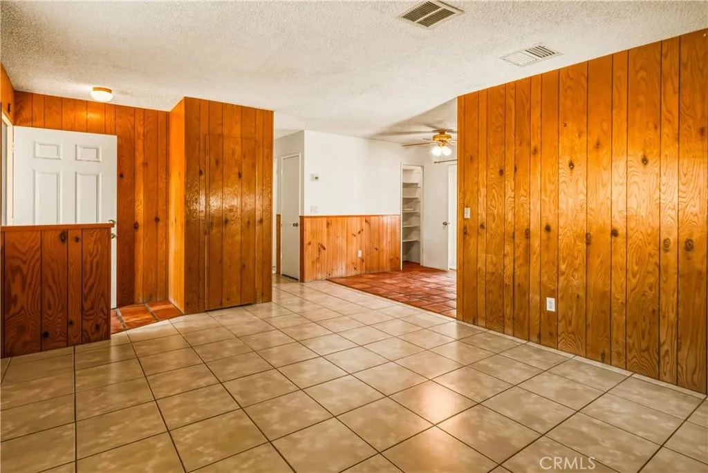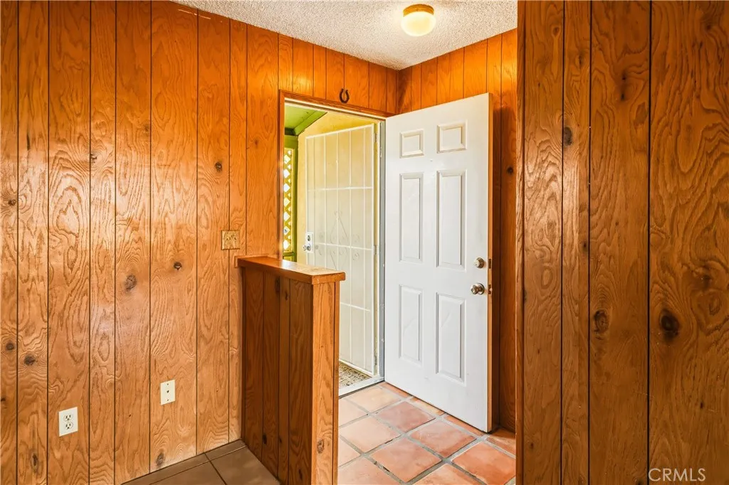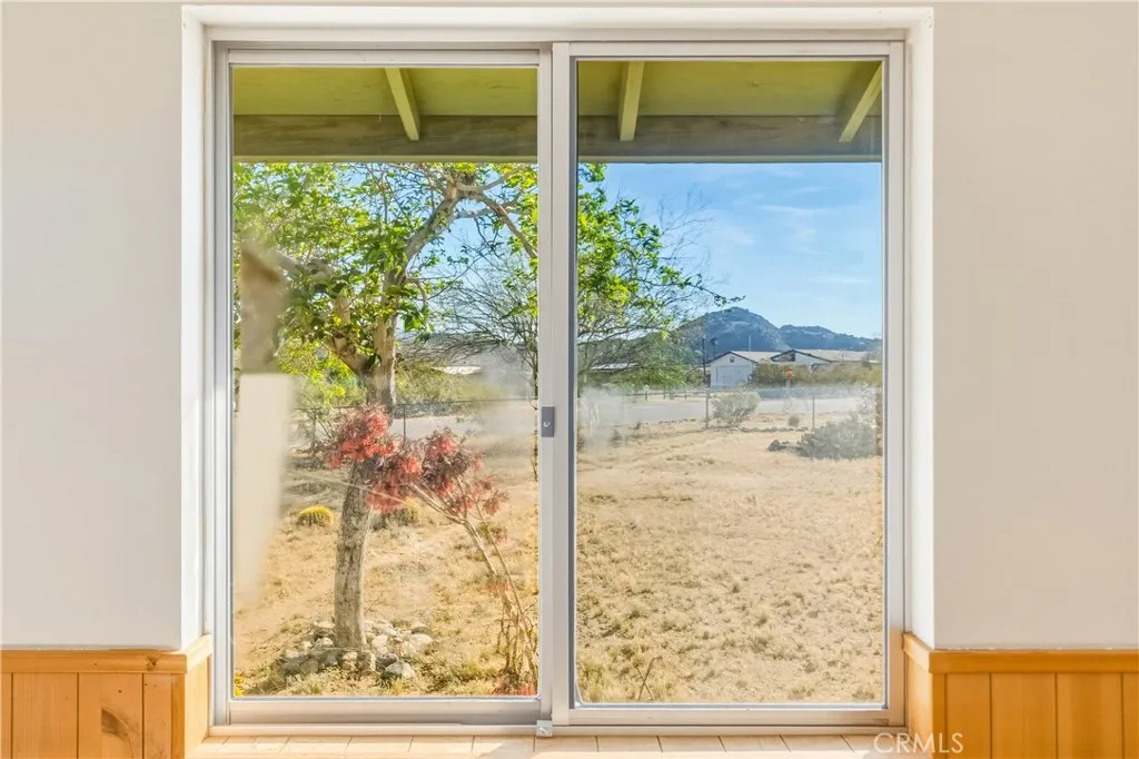 Adorably Vintage with Sustainable Soul -- 61948 Calle Las Sierras, Joshua Tree, CA -- Step into desert charm at its most authentic. This lovingly maintained Joshua Tree home radiates retro warmth and timeless appeal — with sustainable modern comforts that make it both cozy and smart. Inside, rich wood paneling lines the living room walls, creating a golden glow that feels like a hug from the past. The dining room and a bedroom feature classic wood wainscoting, adding texture and charm, while Saltillo tile floors in the entry, dining, and kitchen offer a touch of rustic desert romance. The original wood kitchen cabinets are beautifully preserved — a rare find. You’ll find functional storage everywhere: Two oversized linen closets in the hallway, a coat closet at the entry, a large food pantry off the kitchen, and an attached single-car garage. Outside, the desert lifestyle shines. A covered front porch with pony walls and a whimsical entry gate welcomes you home, while the double covered back patio invites endless creativity and relaxation. The patio’s half-wall separation with a tiled counter and swinging door creates a natural space for entertaining — from outdoor dining to an impromptu dry bar. One section was once a screened "catio" (complete with a pet door entry from the dining room), perfect for your furry companions. This property is built for efficiency: 16 fully paid solar panels, rainwater collection system for garden watering, compost stacks and water-wise landscaping, and a newer HVAC plus a swamp cooler option for economical comfort. Set on a large corner lot with mountain views, both the front and back yards are fully fenced, with an additional partially fenced side yard — ideal for pets, projects, or privacy. The location couldn’t be better, with close proximity to the elementary school, a straight shot to downtown Joshua Tree, and bordering the stunning Mesa with clear, starry night skies that make every evening feel special. This home may seem modest but it's big on personality, storage, and sustainability — a perfect desert retreat with character and conscience! Come see why 61948 Calle Las Sierras is more than a house — it’s a slice of Joshua Tree history with a modern green heartbeat.