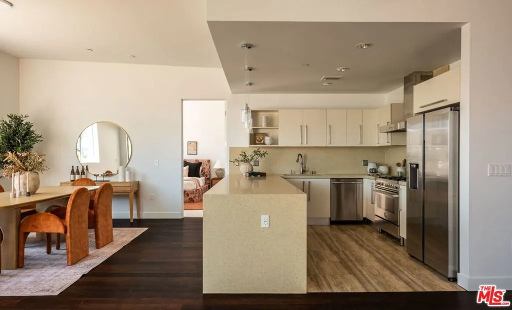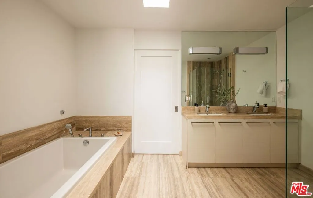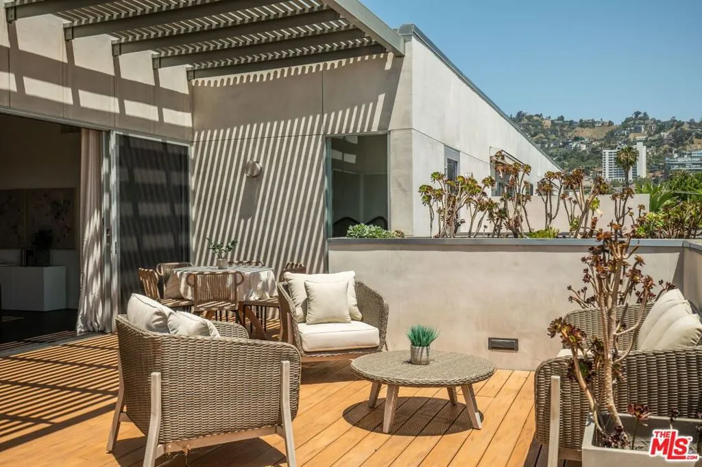 Perched on the top floor of this iconic architectural gem designed by Zoltan Pali, FAIA. This sophisticated Penthouse conveys urban elegance and the coveted California lifestyle with an open concept floor plan, soaring ceilings, sleek wood floors and expansive walls of glass that open seamlessly onto a sprawling patio. Framed by lush meticulously designed landscaping, the patio offers stunning hilltop views, perfect for both relaxation and entertaining. The chef-inspired kitchen, complete with a breakfast bar, is ideal for hosting gatherings or enjoying casual meals. Two generously sized master suites each feature their own private patios, luxurious en-suite bathrooms, and walk-in closets, providing a perfect blend of comfort and privacy. Additional amenities include side-by-side parking, a private storage room, and in-unit laundry for ultimate convenience. Located steps from Melrose Place in the vibrant heart of West Hollywood, this Penthouse is a rare opportunity to experience elevated living in LA's most desirable neighborhood.