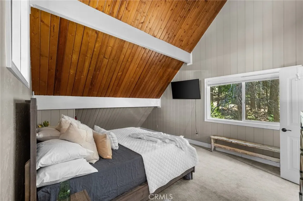 Welcome to your dream getaway in beautiful Lake Arrowhead. Situated on nearly 1/3 acre of lush, private land, this beautifully renovated prow-style home offers the perfect blend of modern comfort and classic mountain character—plus lake rights! Tucked into a serene setting with lush landscaping and a seasonal stream, the home features a spacious wrap-around deck ideal for entertaining or soaking in the peaceful surroundings. Inside, the open-concept living and kitchen area is filled with natural light, highlighted by soaring beam ceilings and a stunning stone fireplace that creates a warm and inviting atmosphere. The expansive primary suite is set on its own private upper level for added comfort. On the lower level, a custom-designed bonus space complete with a built-in wet bar, cozy nook seating, pool table and a second stone fireplace that adds a rustic touch to the entertainment area. A generous laundry room is already plumbed and sized for a potential third bathroom, and there’s abundant storage throughout the home. With a massive concrete driveway offering parking for 6 to 8 vehicles—plenty of room for guests, or even a boat—and easy year-round access to main roads, this home is as practical as it is picturesque. Whether you're looking for a full-time residence, vacation escape, or investment opportunity, this Lake Arrowhead property delivers comfort, charm, and room to relax.