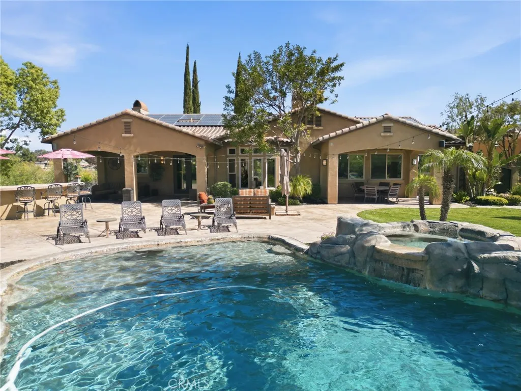 A stunning custom single-level estate on a private drive designed for both comfort and entertaining.Enter through the gated front courtyard featuring one of the home’s three fireplaces, creating a welcoming outdoor gathering space. Inside, the foyer opens to a great room with impressive 14-foot ceilings that enhance the open and airy feel of the home.The family room flows seamlessly into the kitchen and a built-in bar with three-sided seating and a climate- controlled wine room, ideal for hosting. The kitchen features alder wood cabinetry, a butler’s pantry, large walk-in pantry, and Bosch appliances including a double oven.Each bedroom offers its own ensuite bathroom. One bedroom includes a private entrance, Murphy bed, built-in desk, and a separate A/C unit, making it ideal for guests, a home office, or extended living. The primary suite offers new carpet, marble shower and countertops, dual vanities, a large soaking tub with backyard views, and a spacious walk-in closet.The home is equipped with built-in speakers throughout, all controlled by the Control4 smart home automation system. Energy efficiency is enhanced with 48 paid solar panels.Step outside to a resort-style backyard featuring a heated saltwater PebbleTec pool and spa with waterfall and slide, plus a convenient half bath built into the rock feature behind the pool. The 2.69-acre property is beautifully landscaped with fruit trees, a natural arroyo behind the home, and a large flat area suitable for RV or boat parking or the potential to build an ADU.Additional highlights include two separate two-car garages with built-in storage, a large driveway with ample parking, and gated RV parking.