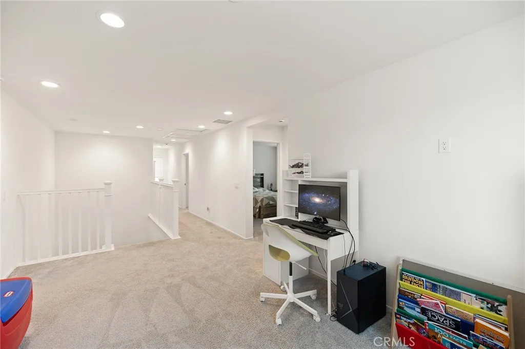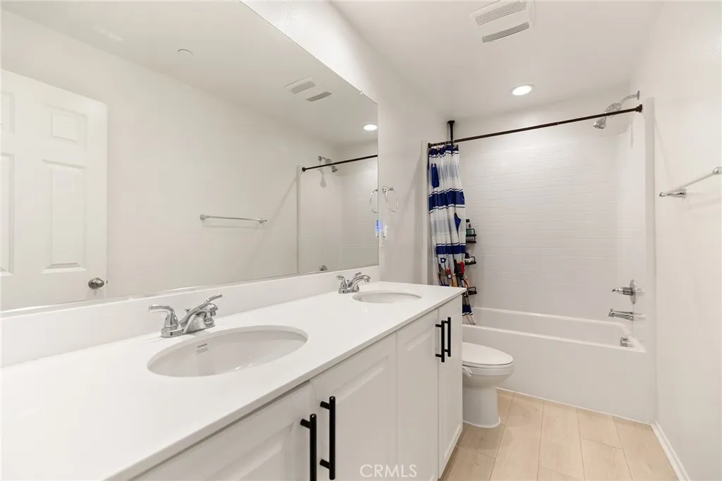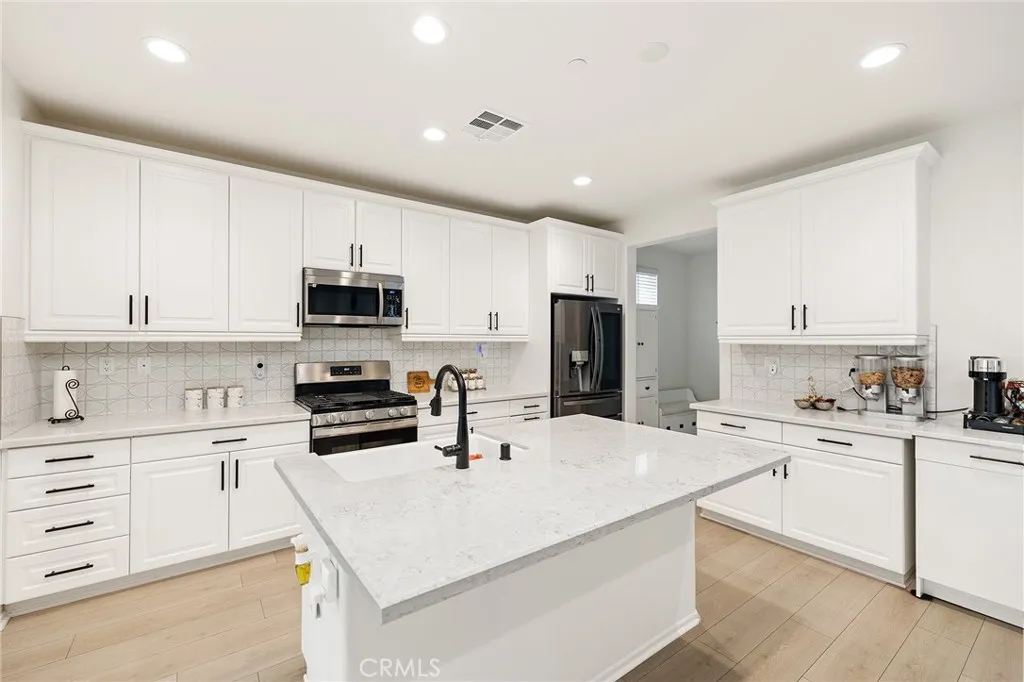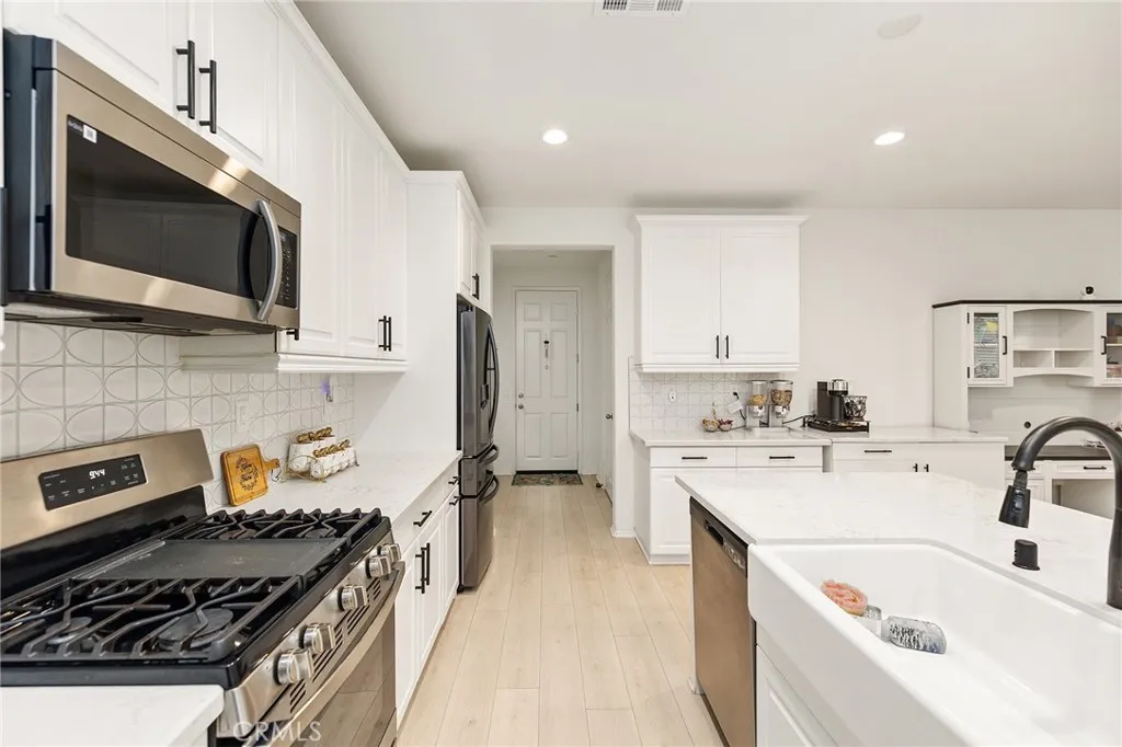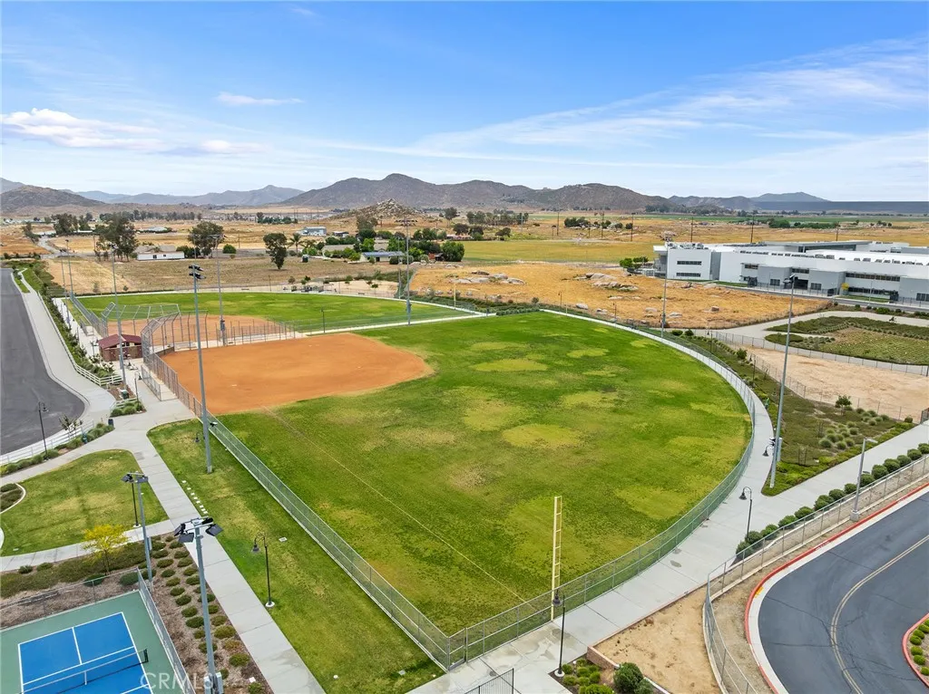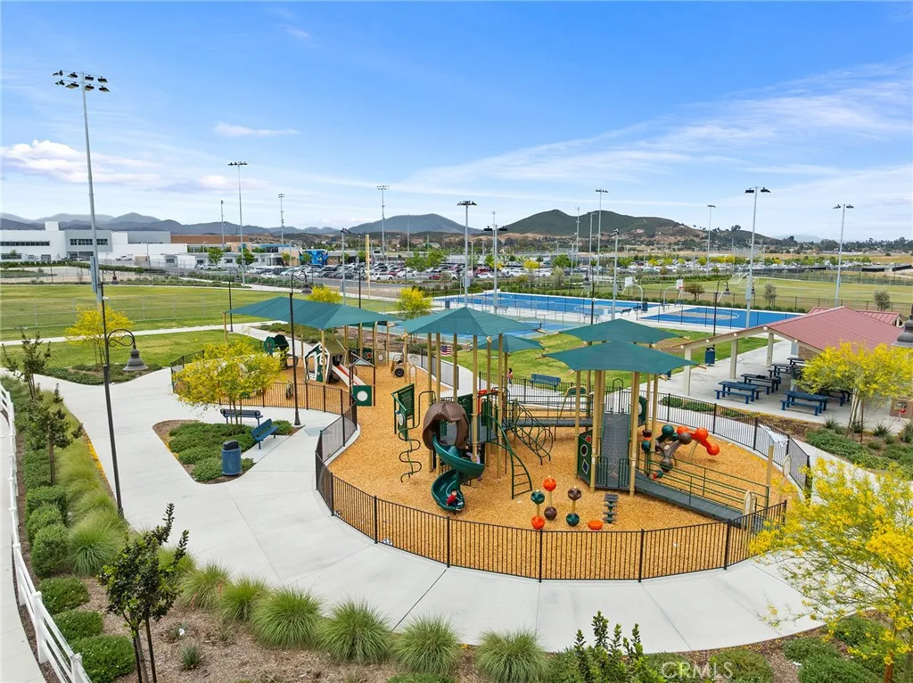 Welcome to this beautifully move- in upgraded home in the heart of Menifee. Showcasing exceptional curb appeal with thoughtful designed low maintenance landscaping and covered entry. Step inside to a welcoming entryway featuring elegant double doors open to a flexible first floor room, this could be used as a bedroom or office room. Modern seamless laminate wood flooring throughout the main level. The thoughtful designed floor plan includes a dinning room, full bathroom, and open -concept upgraded kitchen.This beautifully designed kitchen features crisp white shaker cabinetry paired with sleek black hardware, along with stylish backsplash tile, spacious center island with quartz stone countertops, custom farm sink, plenty of cabinetry, walk in panty, and stainless steel appliances. Additional highlights includes FULYY PAID SOLAR (5.25 KW system with 15 PANELS on NEM 2.0) for energy efficiency and long term savings. Window blinds throughout the house, along with the spacious two -car garage that is upgraded with a sleek EPOXY coated floor, tankless water heater, and build in EV charger, offering both functionality and modern convenience. Step outside to a low maintenance backyard with covered California patio, lush of artificial turf and irrigation system, extended concreted and brick retaining wall. Additional upgrades include added gutters for improved drainage. Upstairs, you will find a spacious loft offers an open design with natural light, perfect for use a second living room, home office, playroom or media room. The upper level also features four bedrooms and large laundry room. The luxurious, spacious primary room serves as private retreat, featuring a beautifully designed walk in shower, linen closet, and expansive walk in closet. This turnkey home is located in amenity -rich community featuring pickleball court, basketball court, play ground, picnic area, soccer field, dog parks, and conveniently close to schools and shopping. Opportunities like this don't last- schedule your showing today.