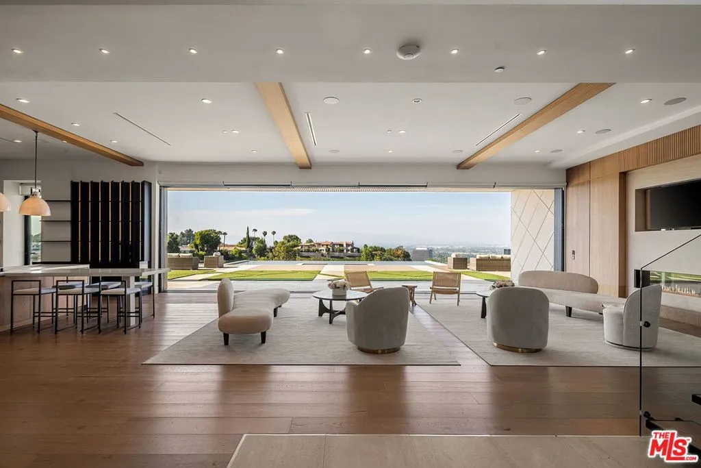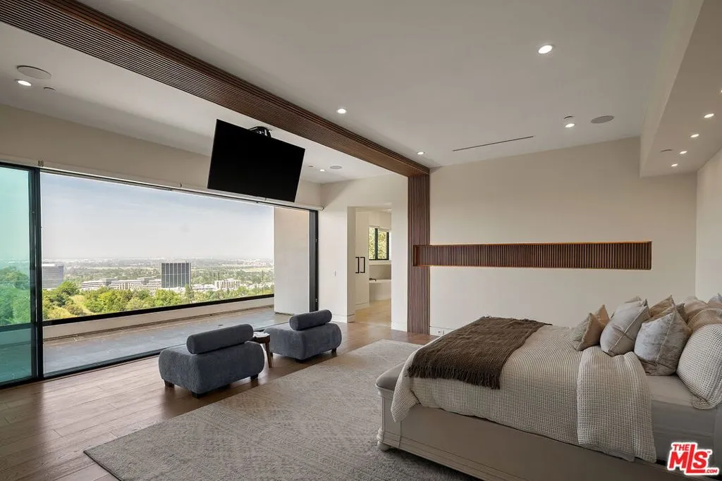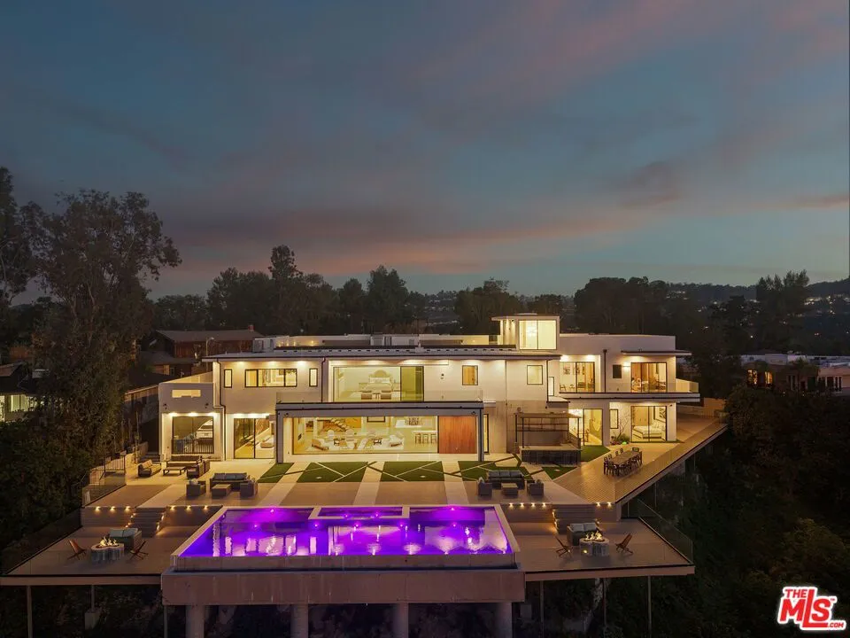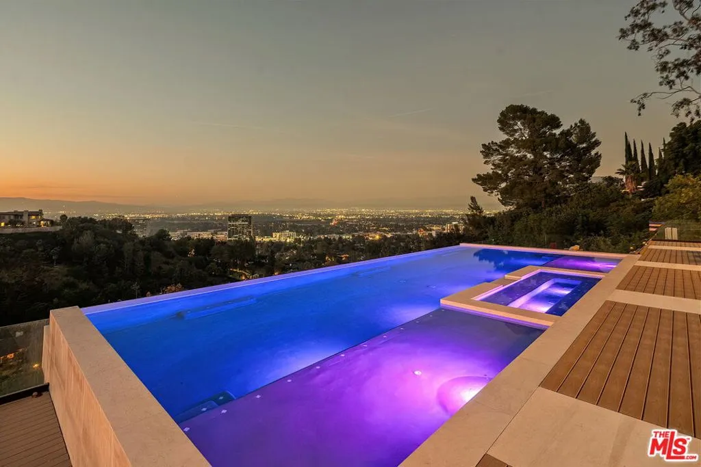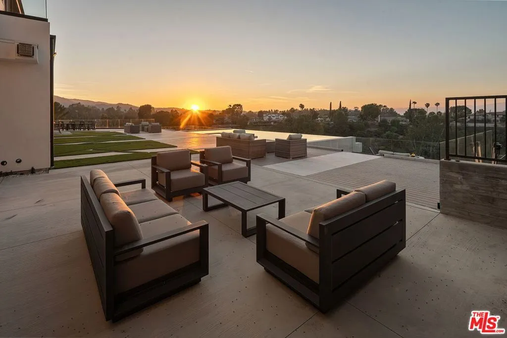 Perched on a private cul-de-sac in the prestigious Royal Oaks enclave, this recently constructed modern estate combines a rare blend of architectural scale, privacy, and sweeping panoramic city and canyon views. Designed around seamless indoor-outdoor living, the main level is defined by expansive floor-to-ceiling glass, soaring ceilings, and a refined material palette of warm woods and natural stone. The open-concept living and dining areas flow effortlessly to a resort-style backyard, where an infinity-edge pool, lounge areas, and sunset vistas create an ideal setting for both everyday living and large-scale entertaining. The chef's kitchen is anchored by a statement island and custom cabinetry, complemented by top-tier appliances and thoughtful detailing throughout. Upstairs, the primary suite is a private retreat, oriented to capture panoramic views and complete with dual spa-inspired bathrooms, two generous dressing areas, and its own outdoor terrace complete with an outdoor shower and soaking tub. Additional bedrooms and flexible spaces provide comfort and versatility for guests, office, or wellness use. A rare offering combining modern design, volume, and lifestyle in one of Encino's most sought-after locations.