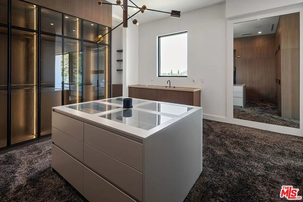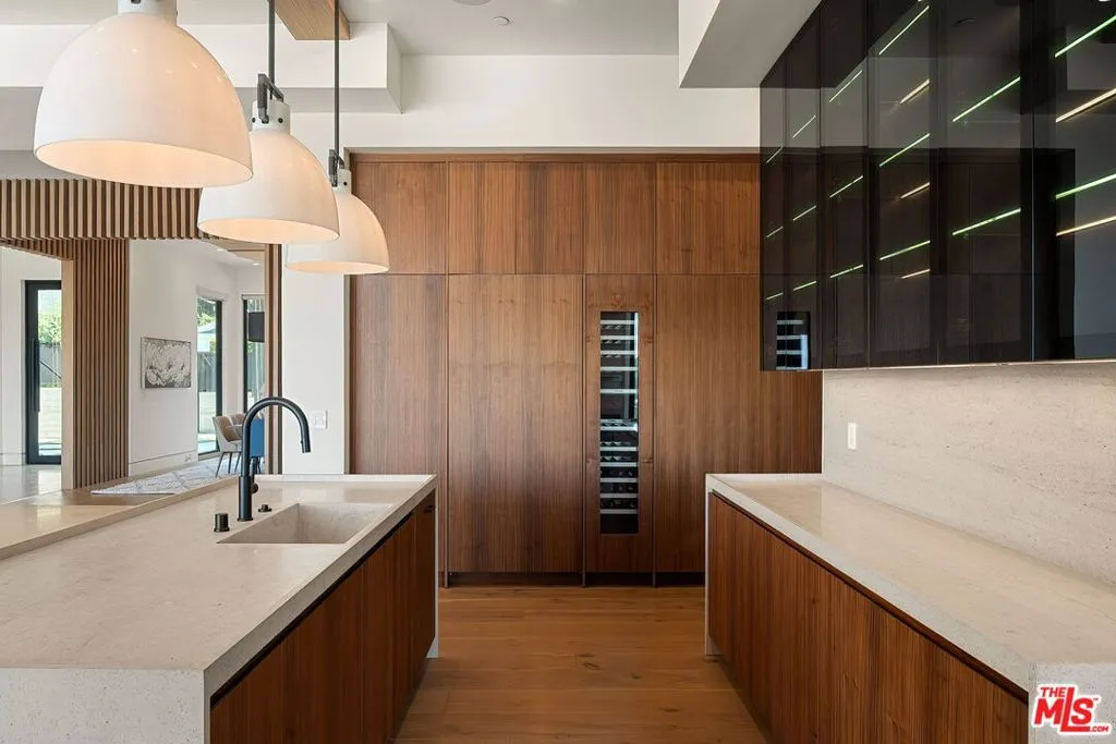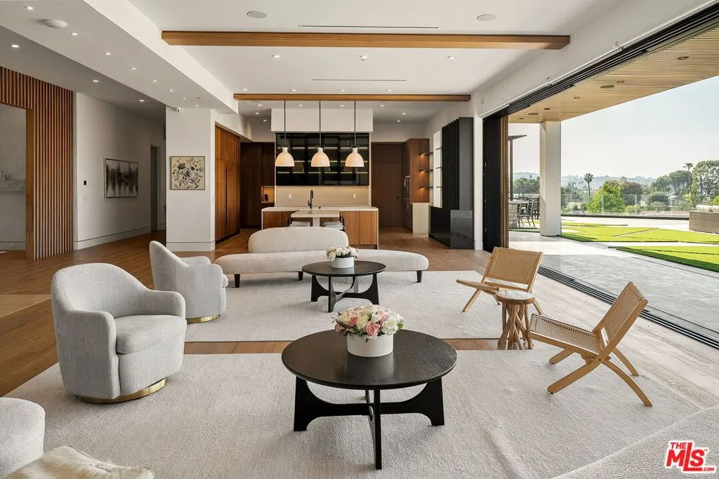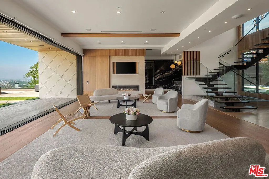 Perched on a private cul-de-sac in the prestigious Royal Oaks enclave, this recently constructed modern estate combines a rare blend of architectural scale, privacy, and sweeping panoramic city and canyon views. Designed around seamless indoor-outdoor living, the main level is defined by expansive floor-to-ceiling glass, soaring ceilings, and a refined material palette of warm woods and natural stone. The open-concept living and dining areas flow effortlessly to a resort-style backyard, where an infinity-edge pool, lounge areas, and sunset vistas create an ideal setting for both everyday living and large-scale entertaining. The chef's kitchen is anchored by a statement island and custom cabinetry, complemented by top-tier appliances and thoughtful detailing throughout. Upstairs, the primary suite is a private retreat, oriented to capture panoramic views and complete with dual spa-inspired bathrooms, two generous dressing areas, and its own outdoor terrace complete with an outdoor shower and soaking tub. Additional bedrooms and flexible spaces provide comfort and versatility for guests, office, or wellness use. A rare offering combining modern design, volume, and lifestyle in one of Encino's most sought-after locations.